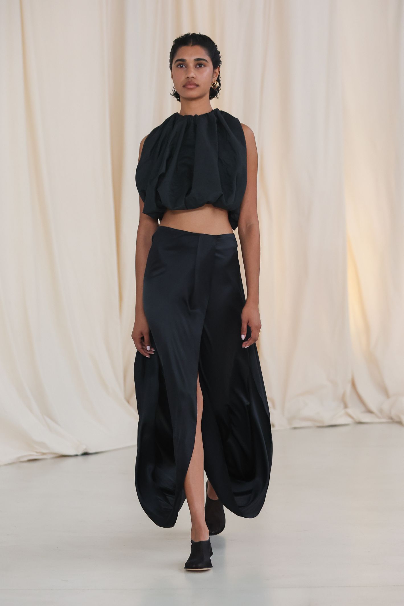 NAVY SATIN CREPE DEVIATION GOWN