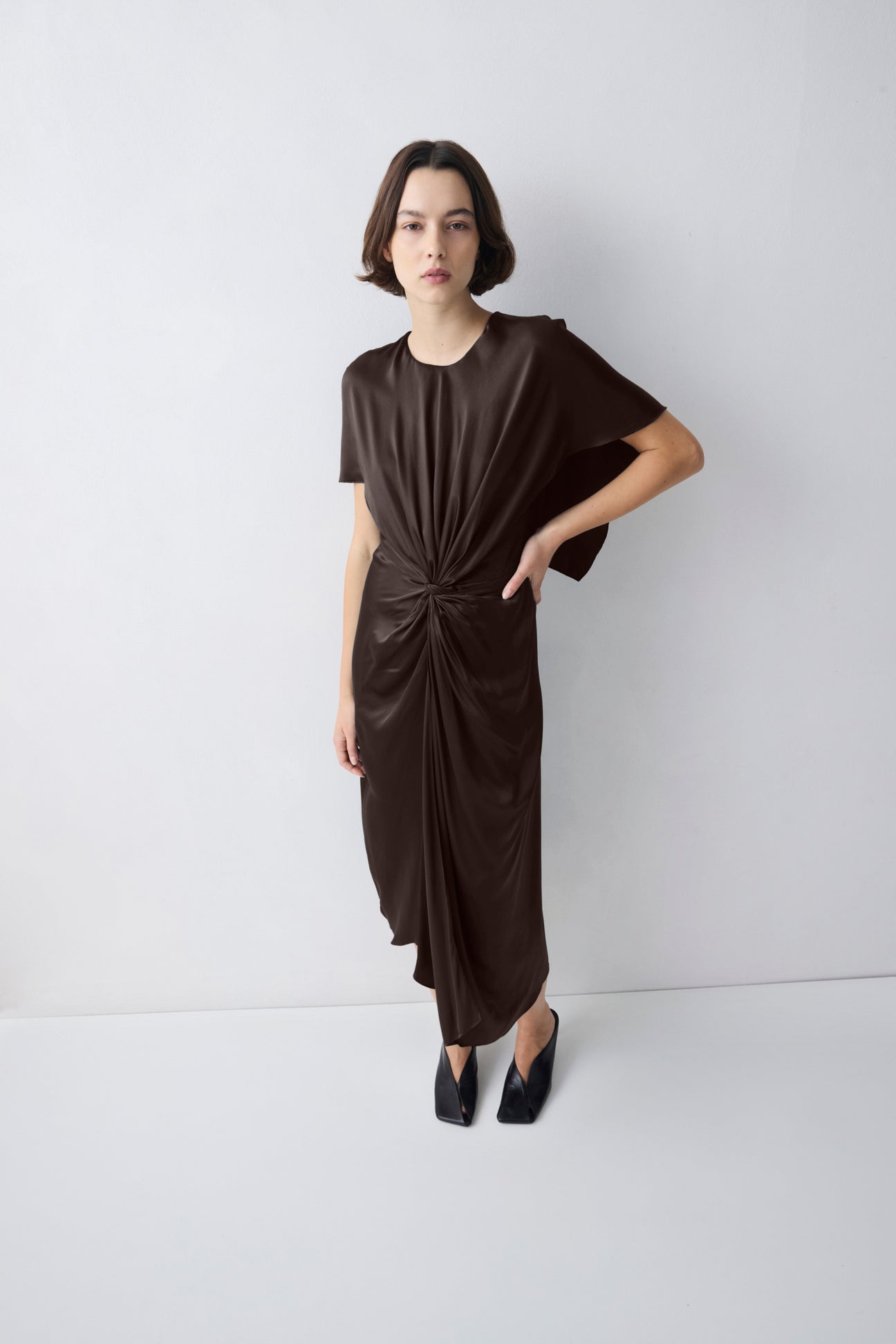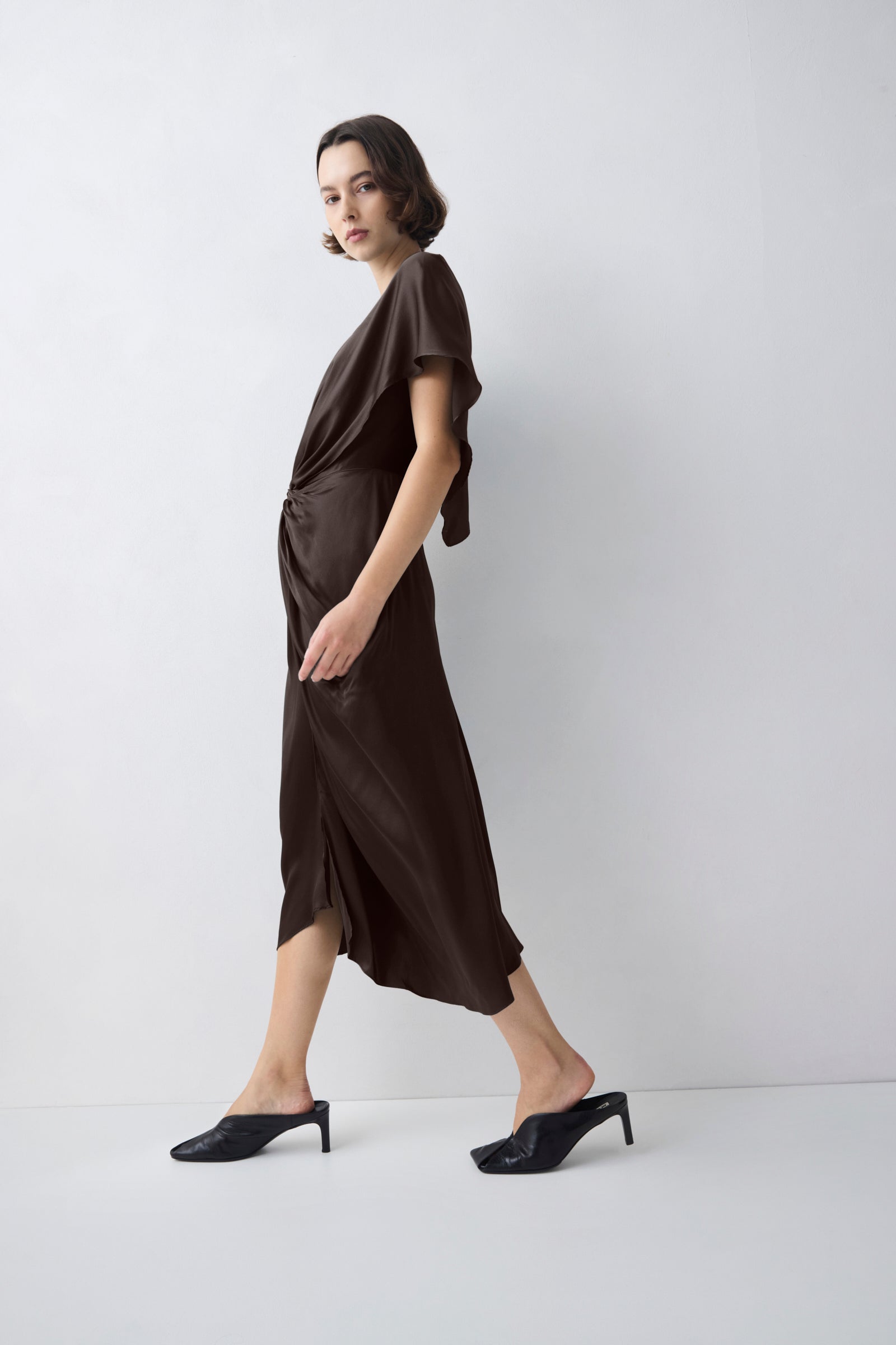 A best-selling silhouette, reimagined in decadent chocolate silk satin. The Illusionist Dress is a masterclass in draping, with a sculptural knot detail at the waist that shapes and flatters the body. Cape-like sleeves offer soft arm coverage, while the back falls into a gentle drape for added elegance and movement.