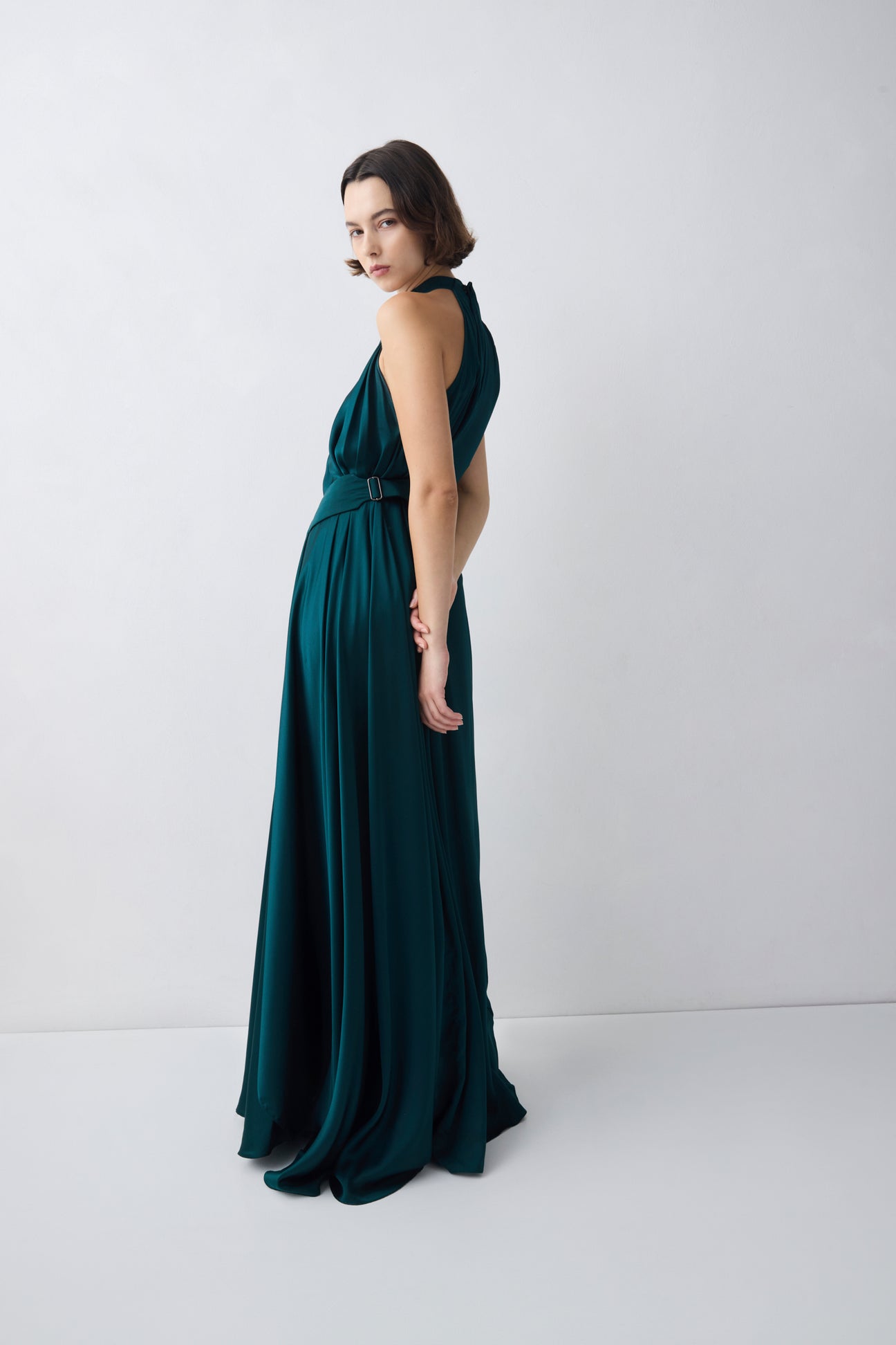 The Isabella Gown exudes glamour and sophistication. The gown is cut from lustrous silk satin and gracefully falls to the ground, skimming the body. It features a high neckline and a delicate side adjustable belt that cinches in at the waist, creating a stunning feminine silhouette.