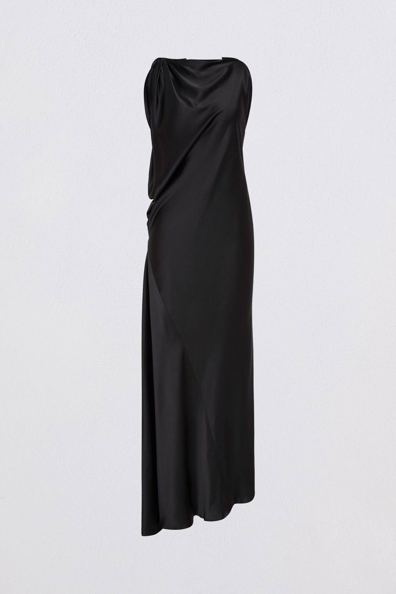 The Roma Gown is draped from a single length of cloth. Twisted and folded to accentuate and elongate the body, this stunning style is cut in our seasonless Black silk. With its draped bodice and contouring stitching across the skirt, the Roma Gown is an unforgettable piece. It is a reversible style that can be worn either way.