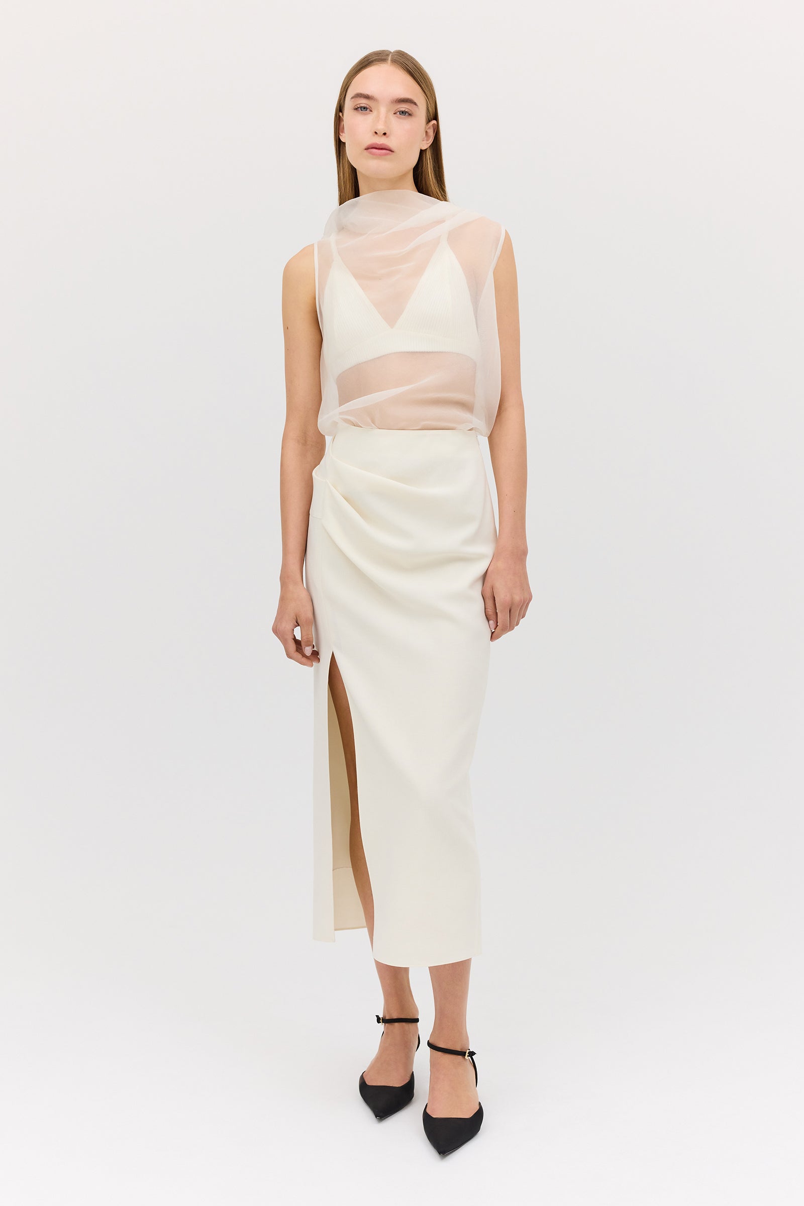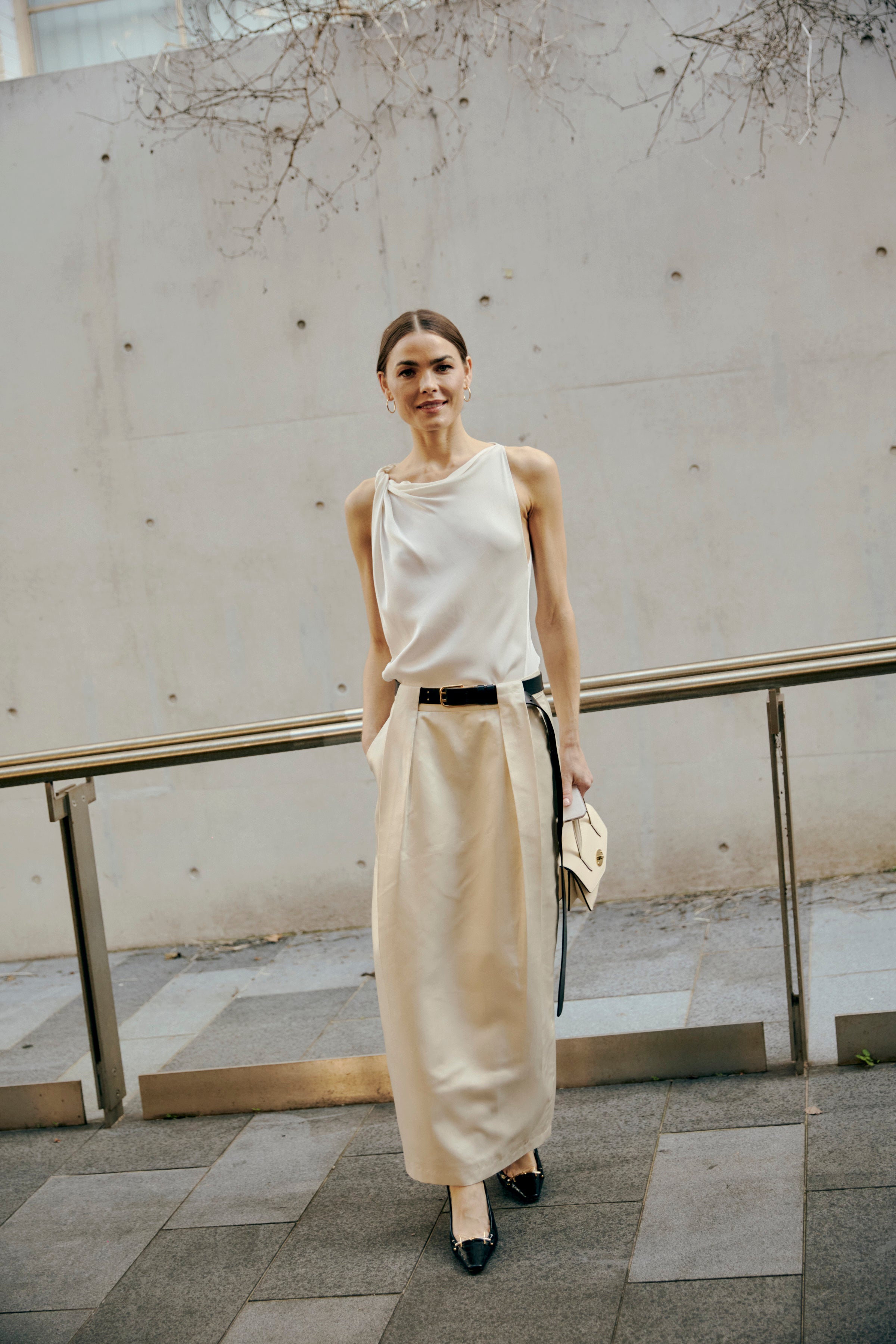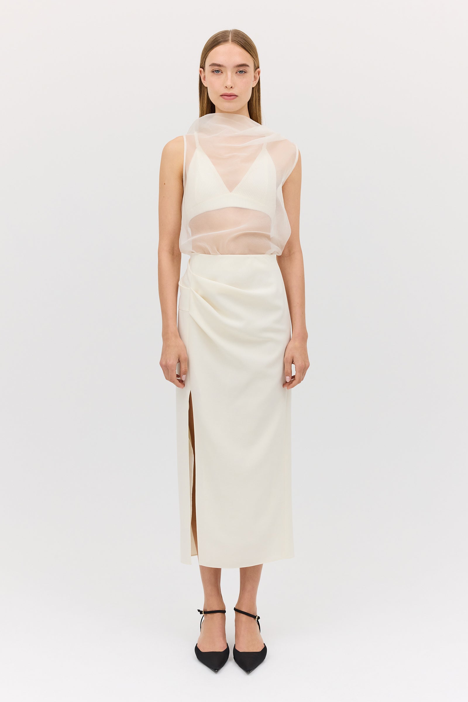 We love this style paired with the most-loved Cream Satin Hazel Top, for a chic look of playful proportions. This style also looks stunning worn with the Cream Organza Top and heels.