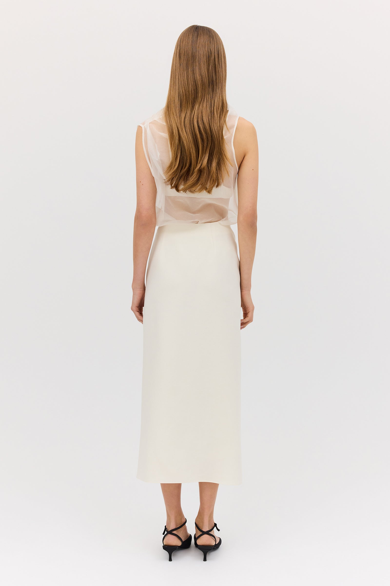 Modern minimalism and precise tailoring. A chic, tulip-style midi skirt fitting at the waist, and softly flaring through the hip, for a beautifully sculpted silhouette. Zips through the center back. Crafted from a super-soft silk blend fabric with slight texture and subtle sheen.
