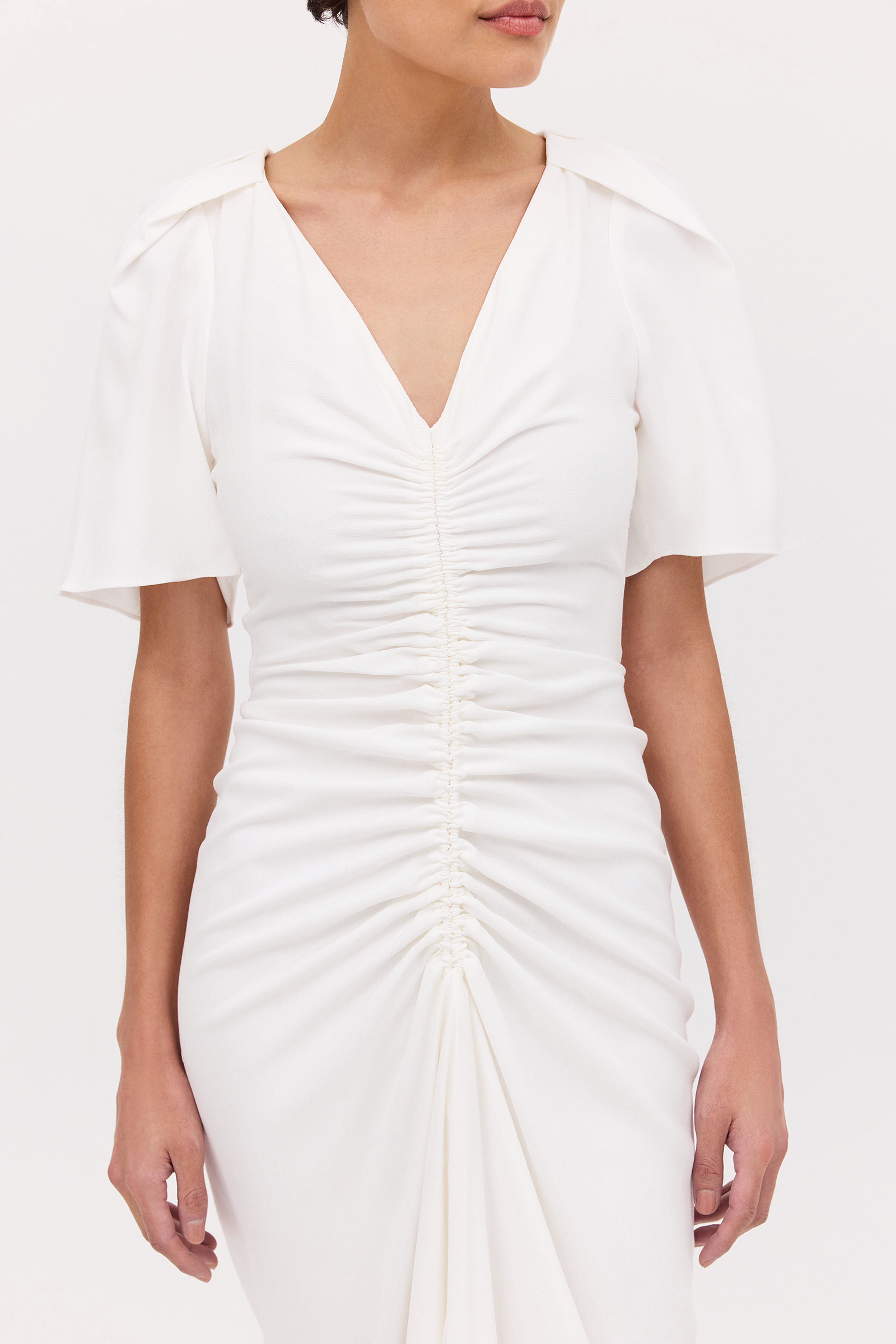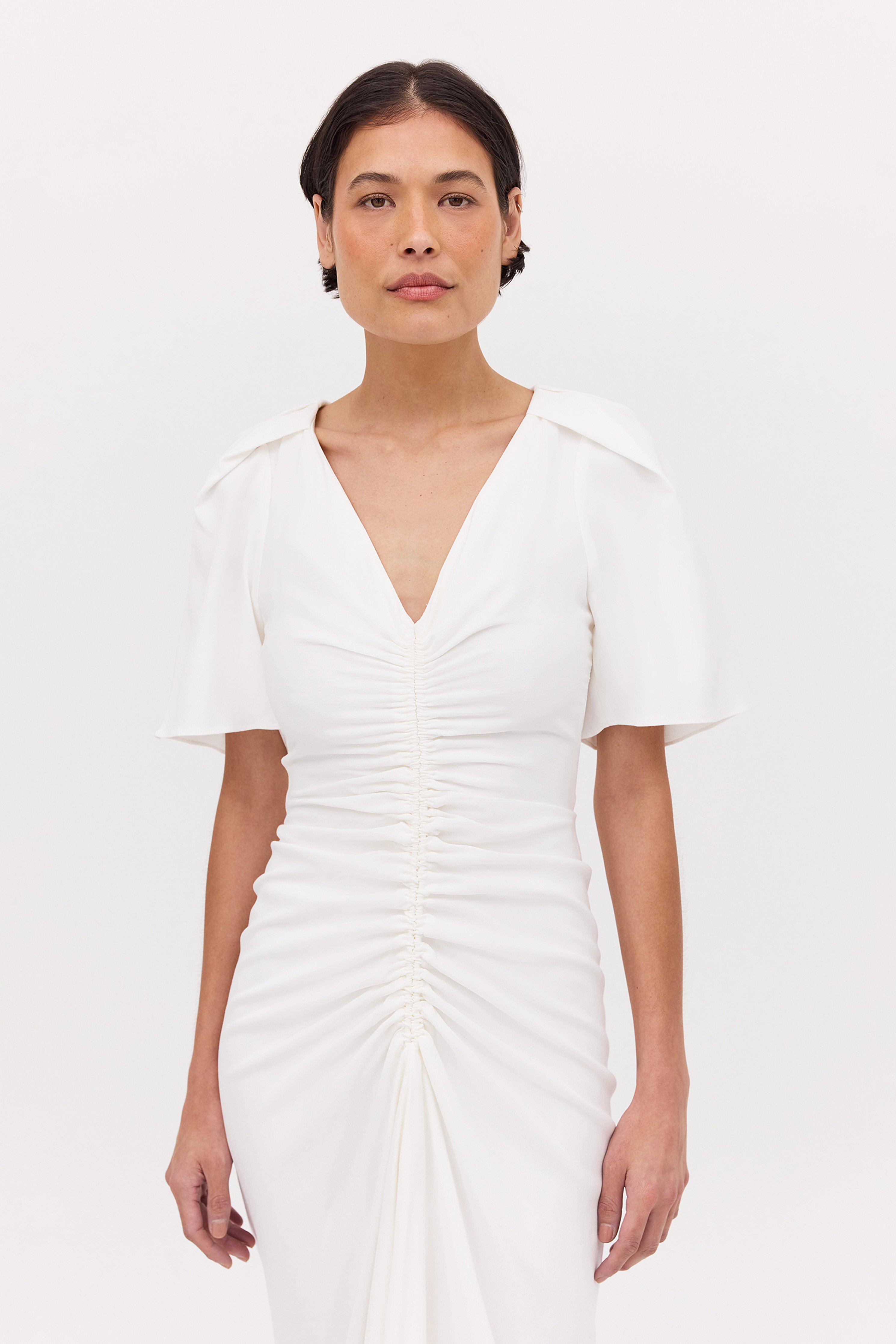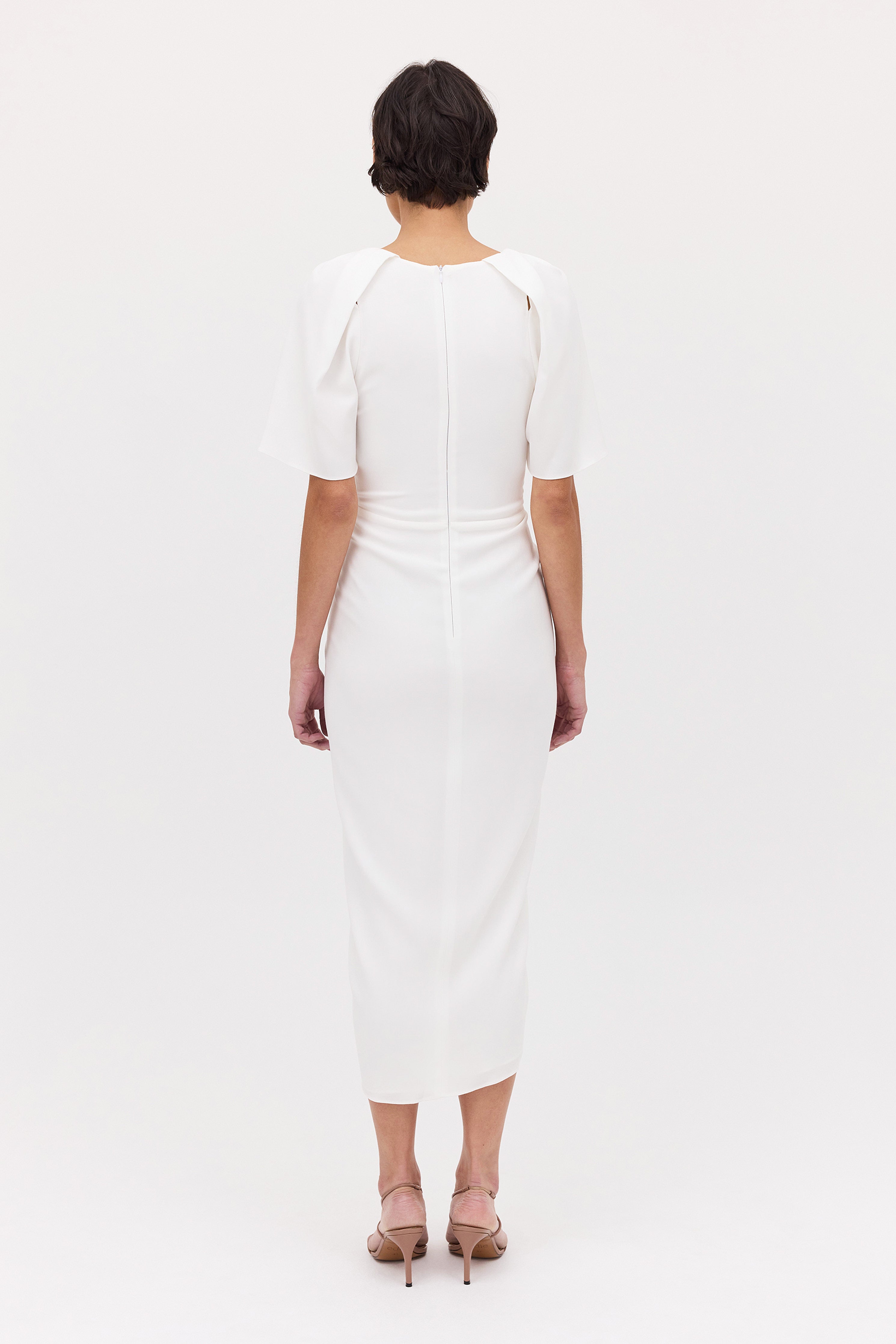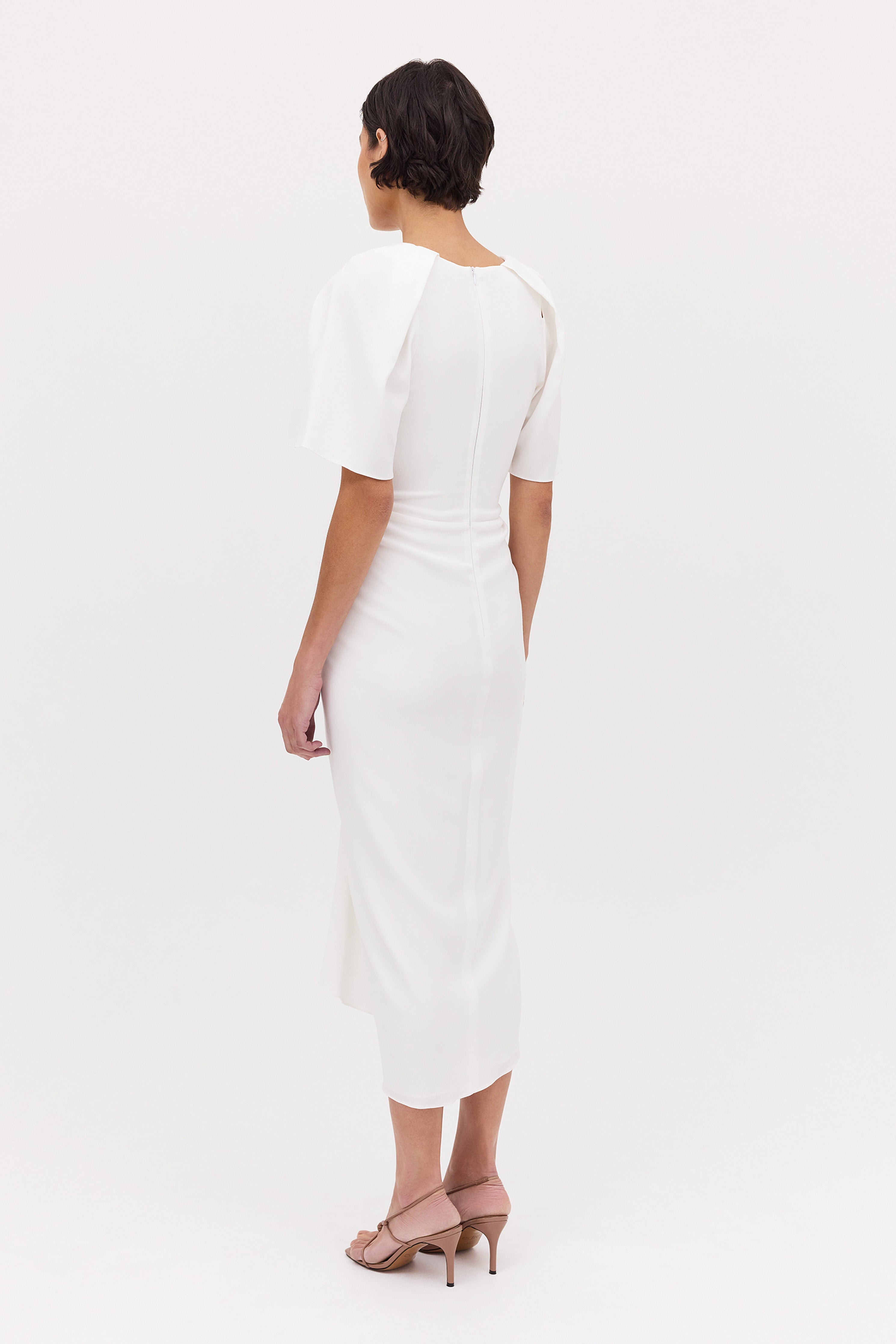 An Ivory Satin update of our classic Bellini dress. This flattering, figure-hugging silhouette, cut with gathers through the centre front, balanced with a narrow v-neck and puff blouson relaxed sleeve, elongates the body and draws the eye to give the illusion of a small waist. Finishing below the knee and just above the calf, the drape through the front skirt conceals a split to just above the knee. The dress fastens through the centre back with an invisible zip to the back neck.