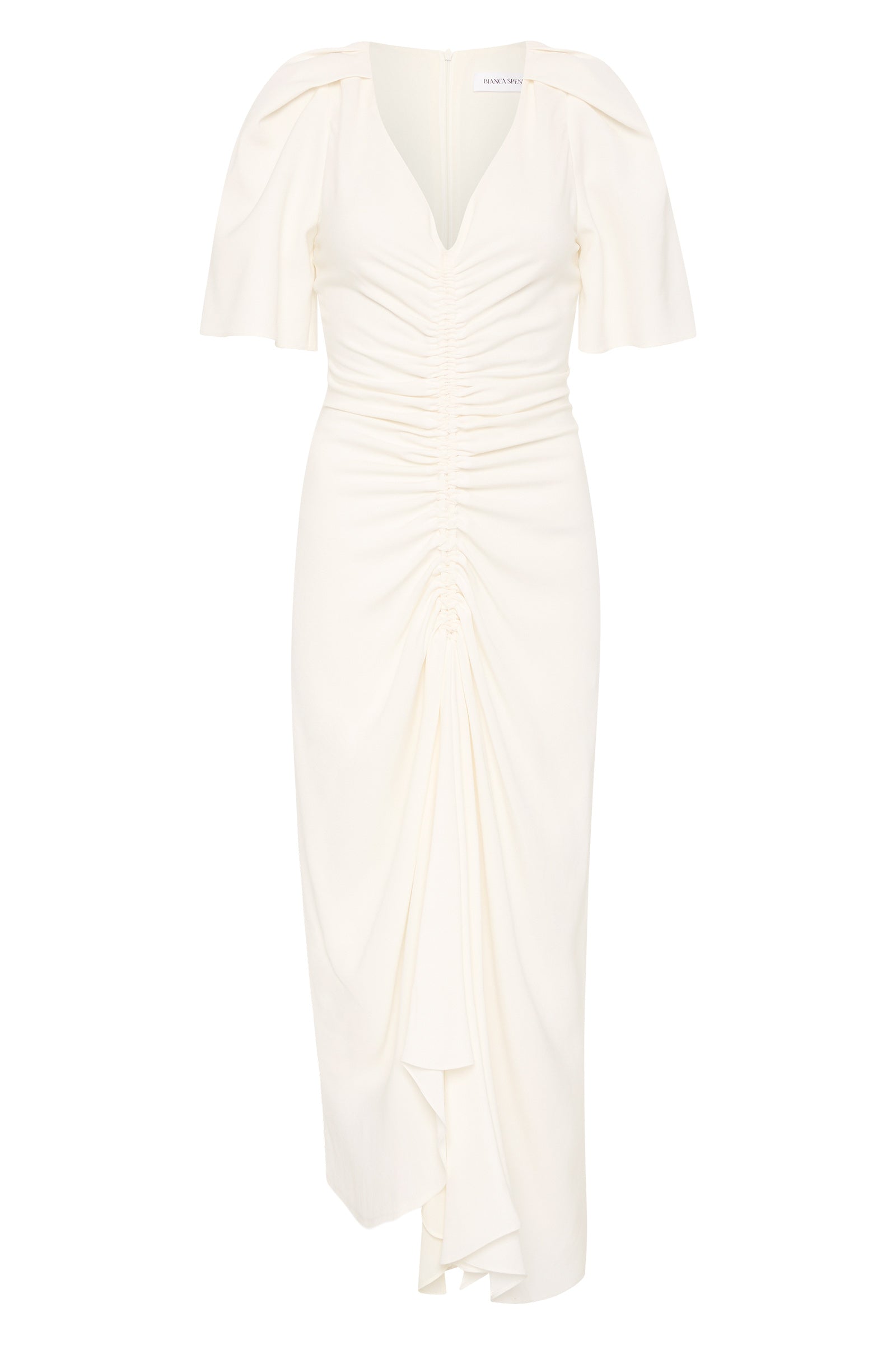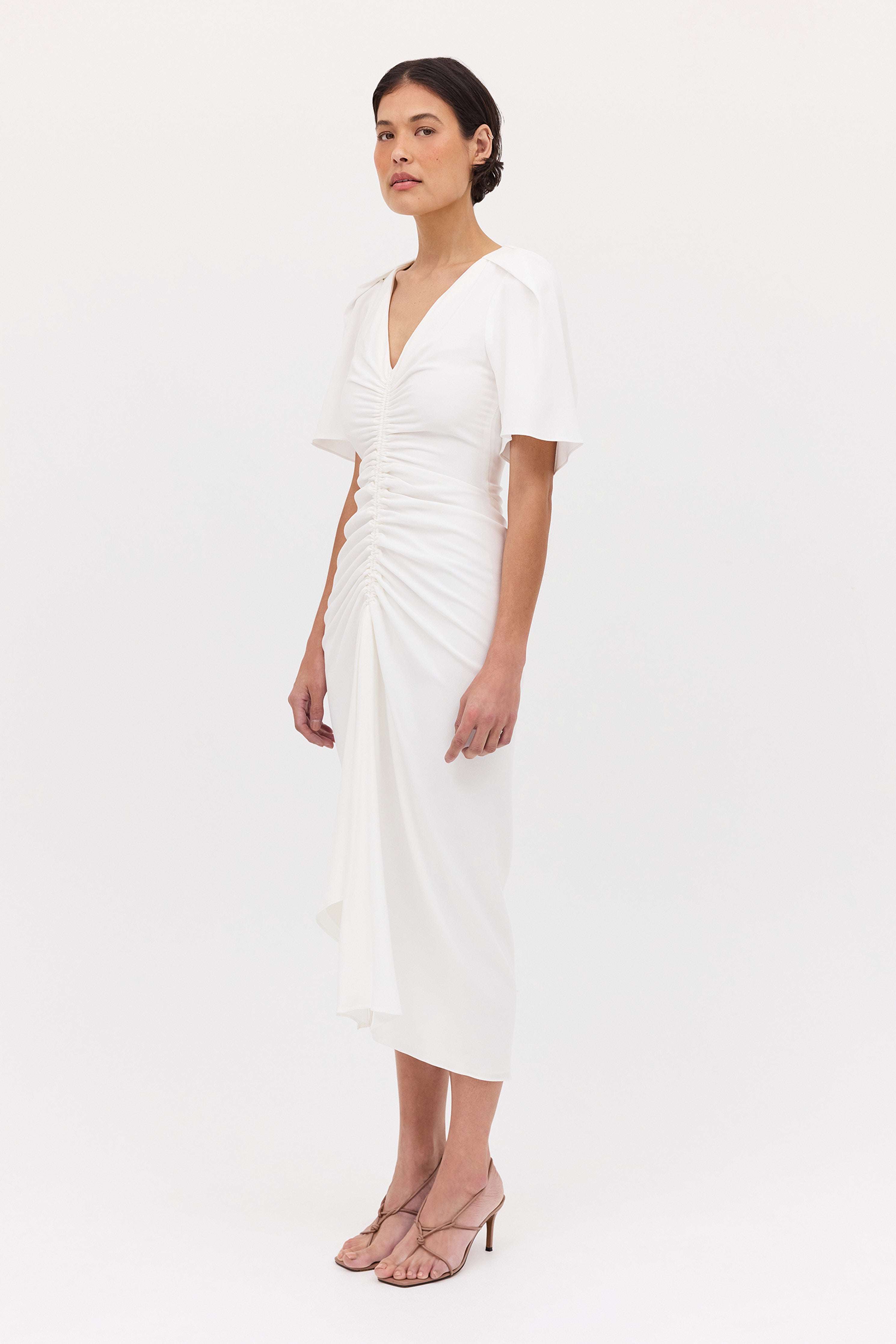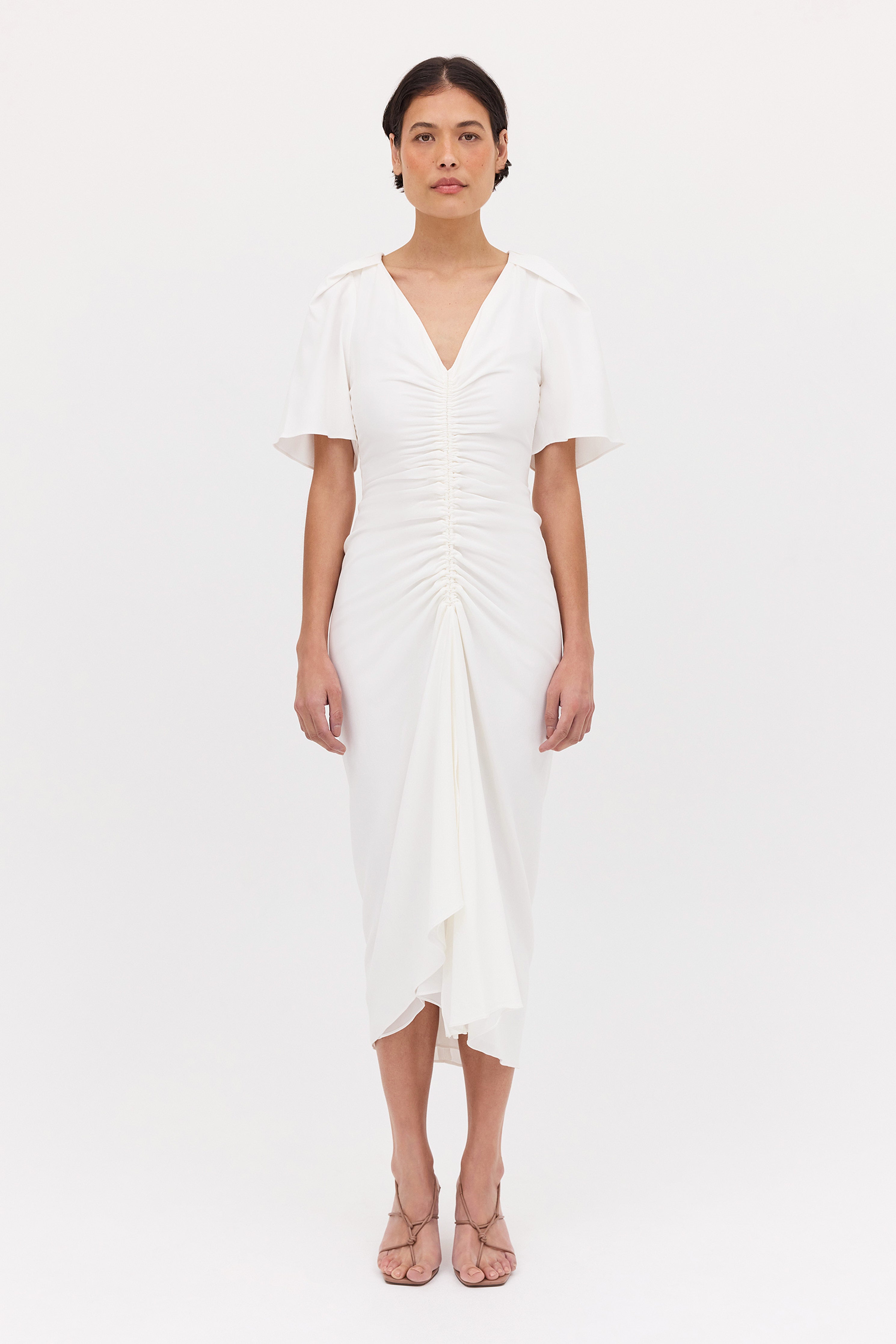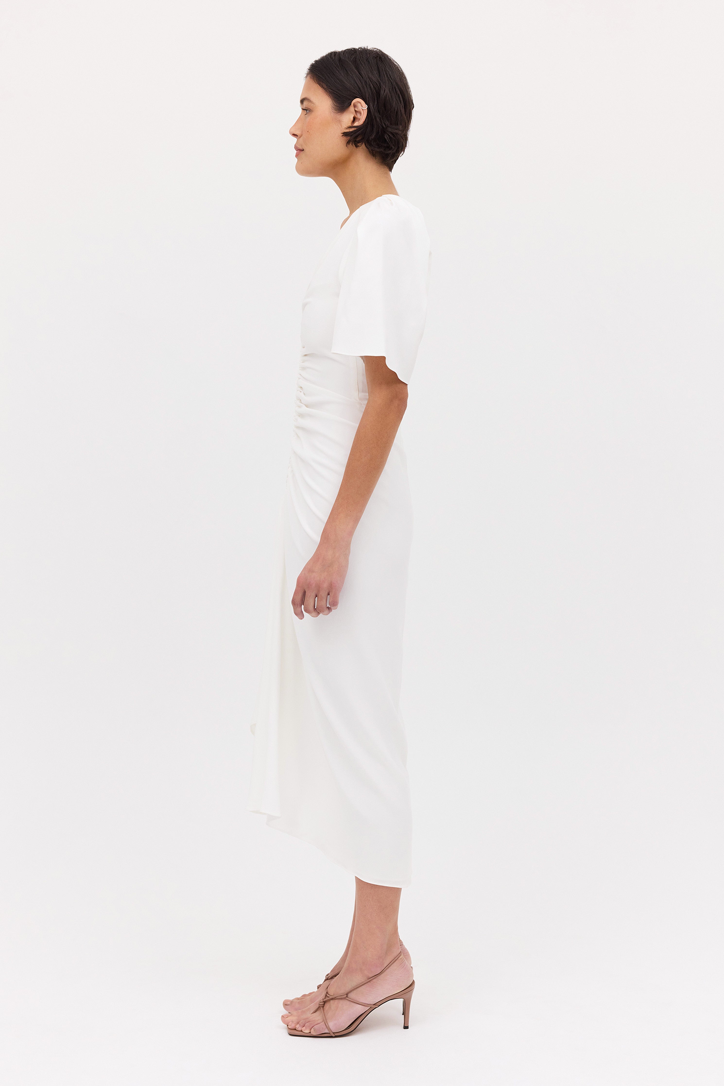An Ivory Satin update of our classic Bellini dress. This flattering, figure-hugging silhouette, cut with gathers through the centre front, balanced with a narrow v-neck and puff blouson relaxed sleeve, elongates the body and draws the eye to give the illusion of a small waist. Finishing below the knee and just above the calf, the drape through the front skirt conceals a split to just above the knee. The dress fastens through the centre back with an invisible zip to the back neck.