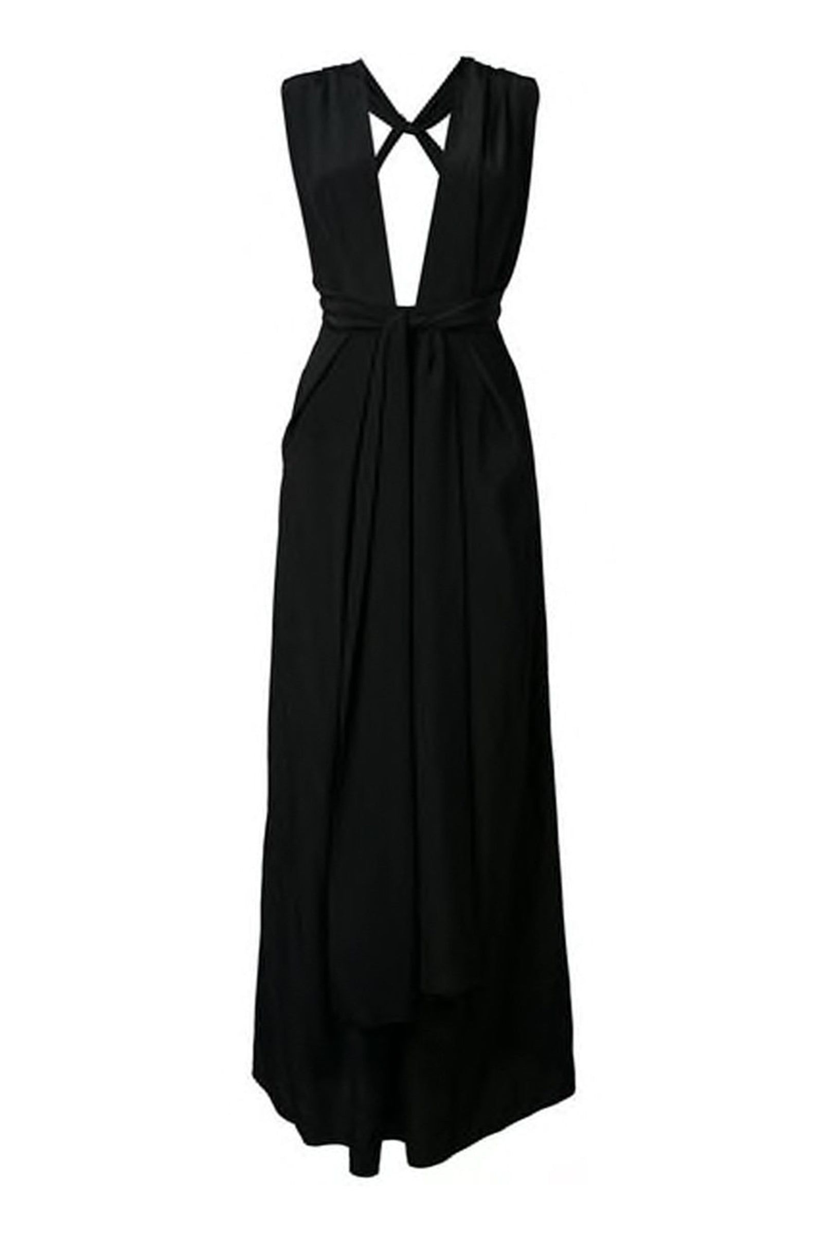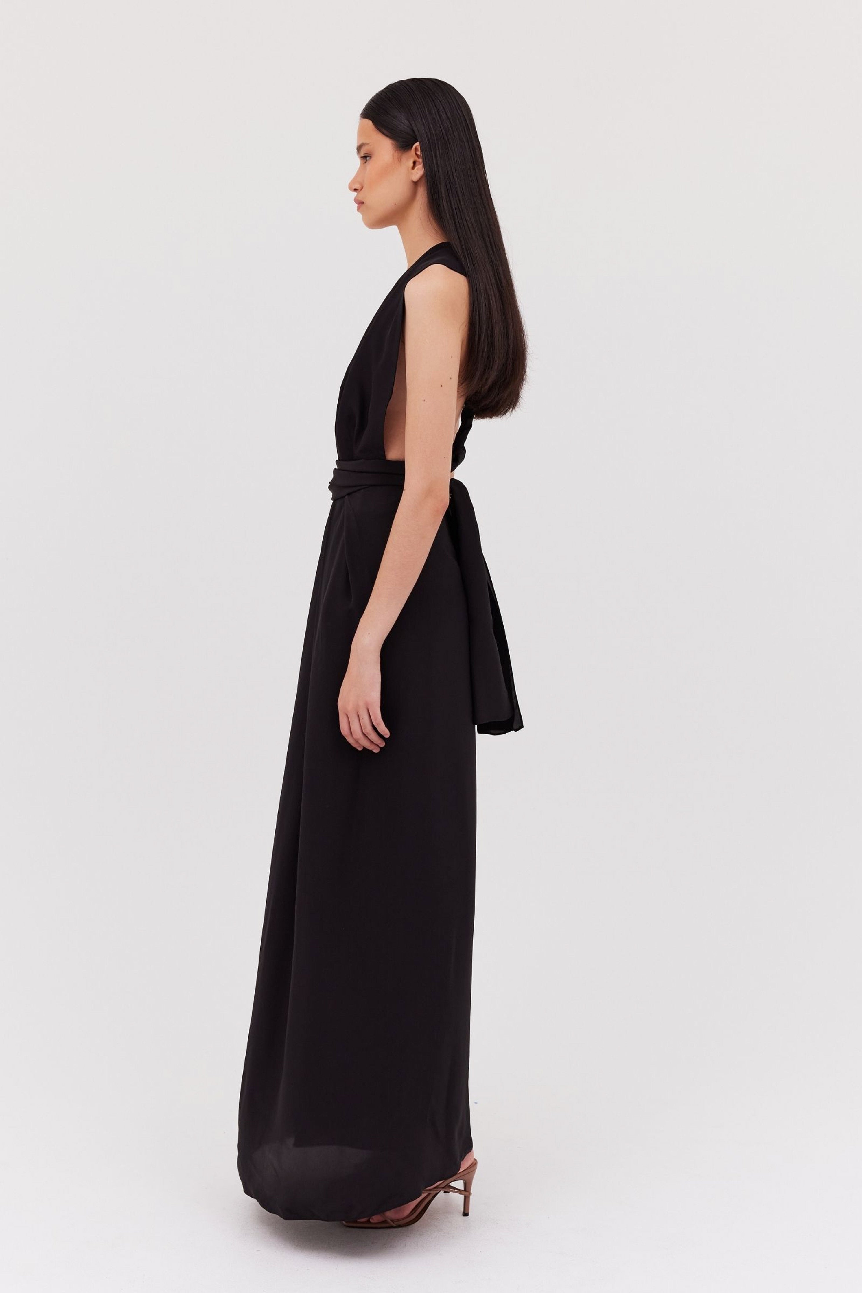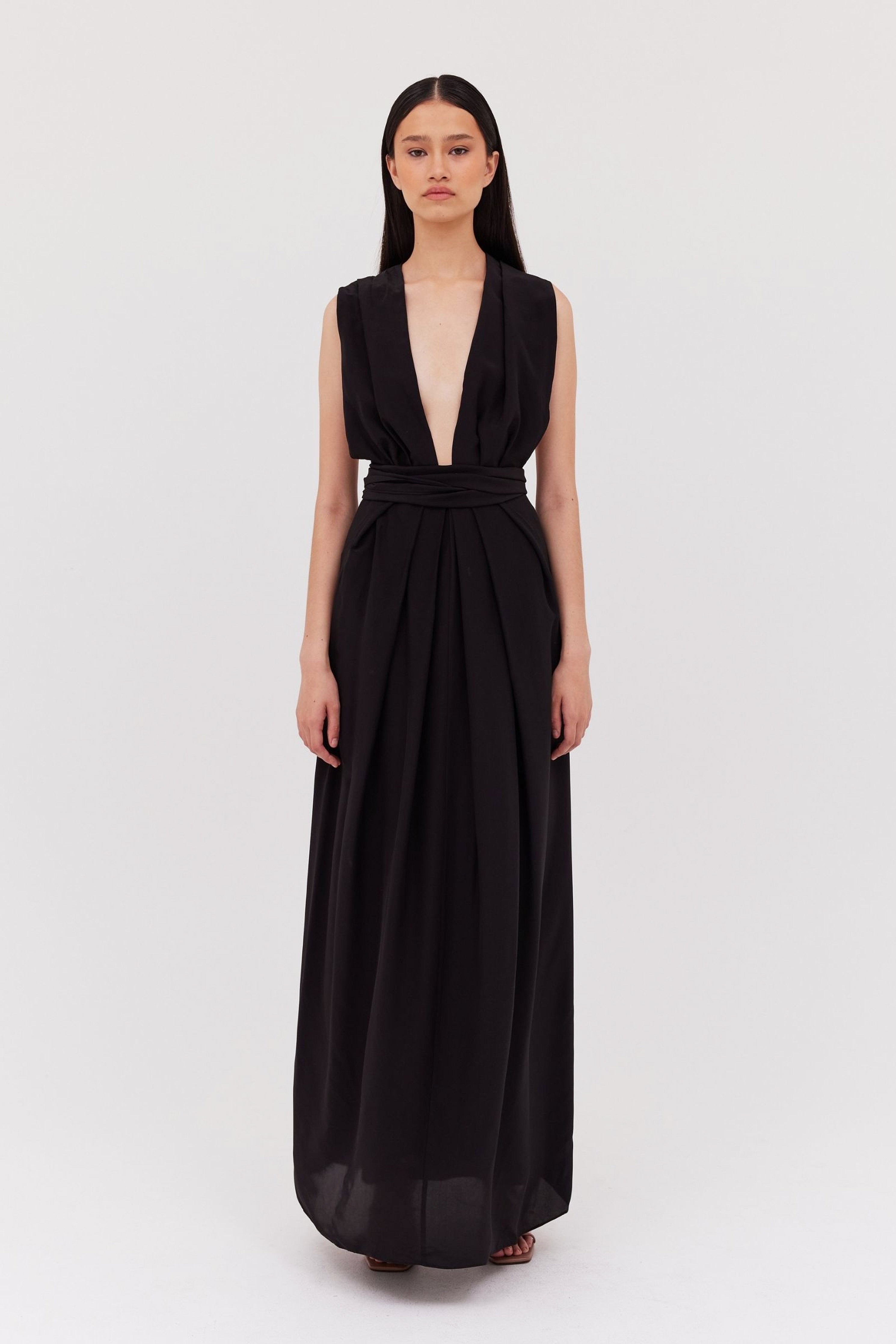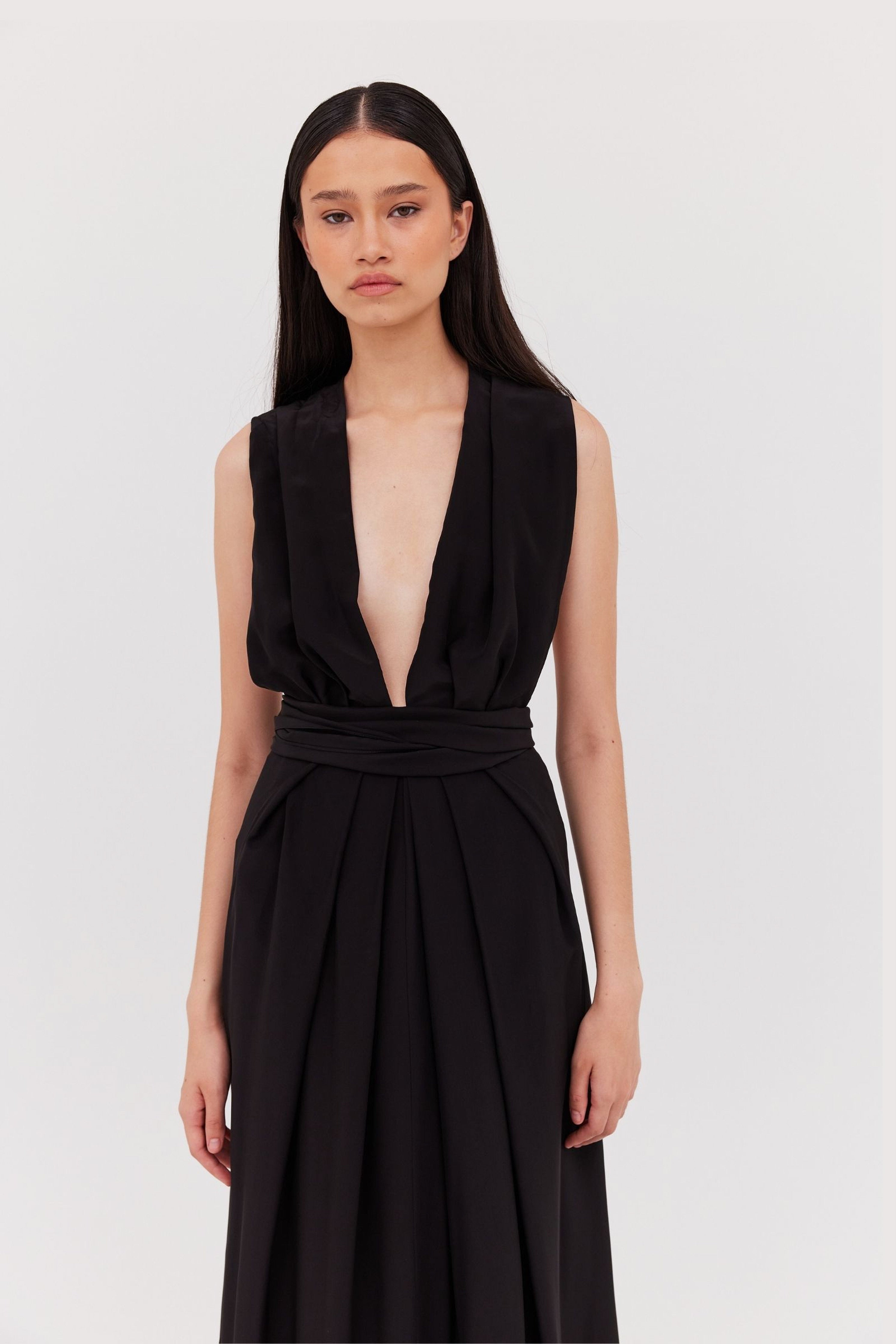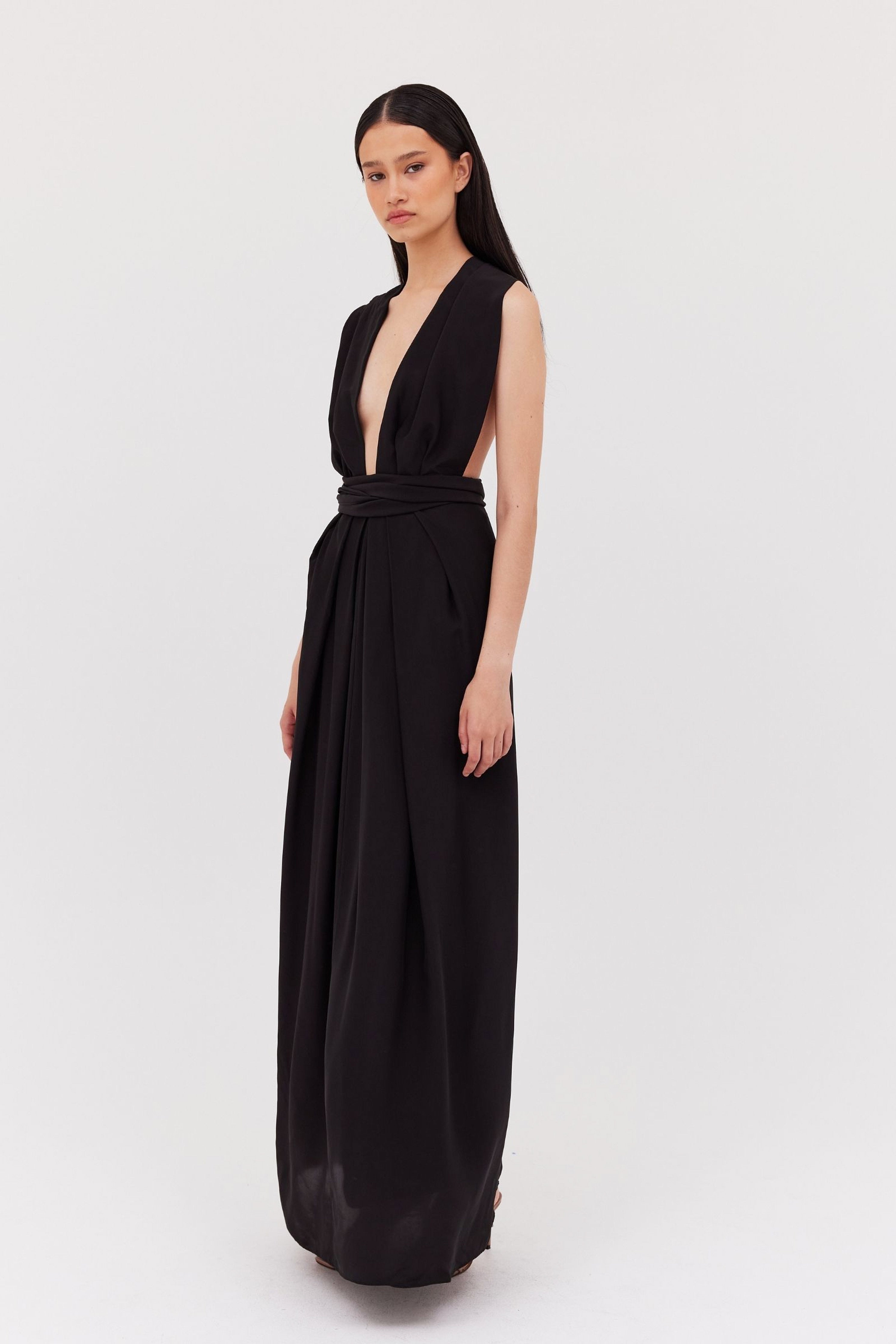 In regal black, this gown summons confidence with its deep plunge and luxurious crepe de chine silk that falls in the folds. A courageous, full-length piece with a carefully cinched waist that will leave you feeling, gorgeous.