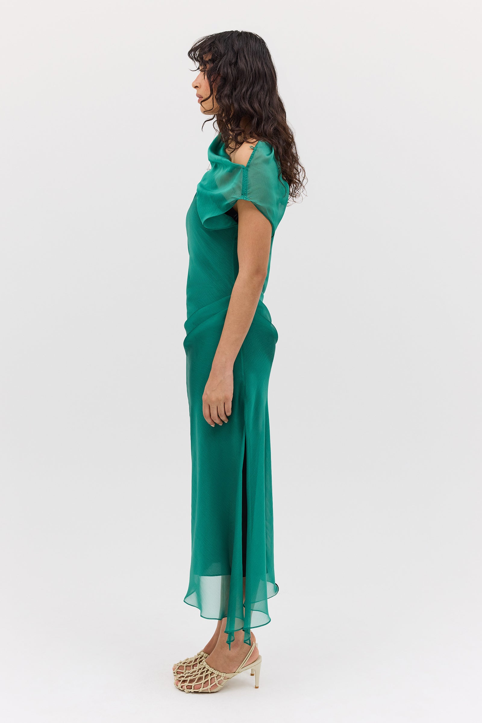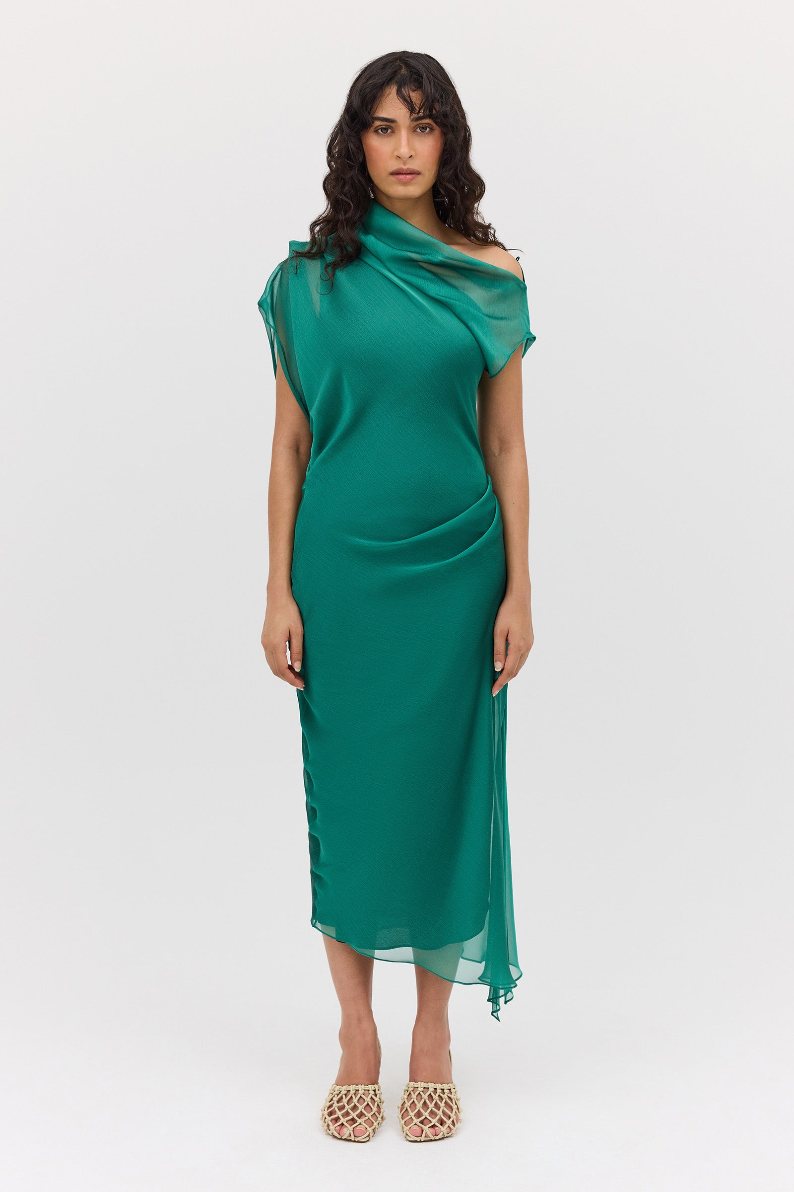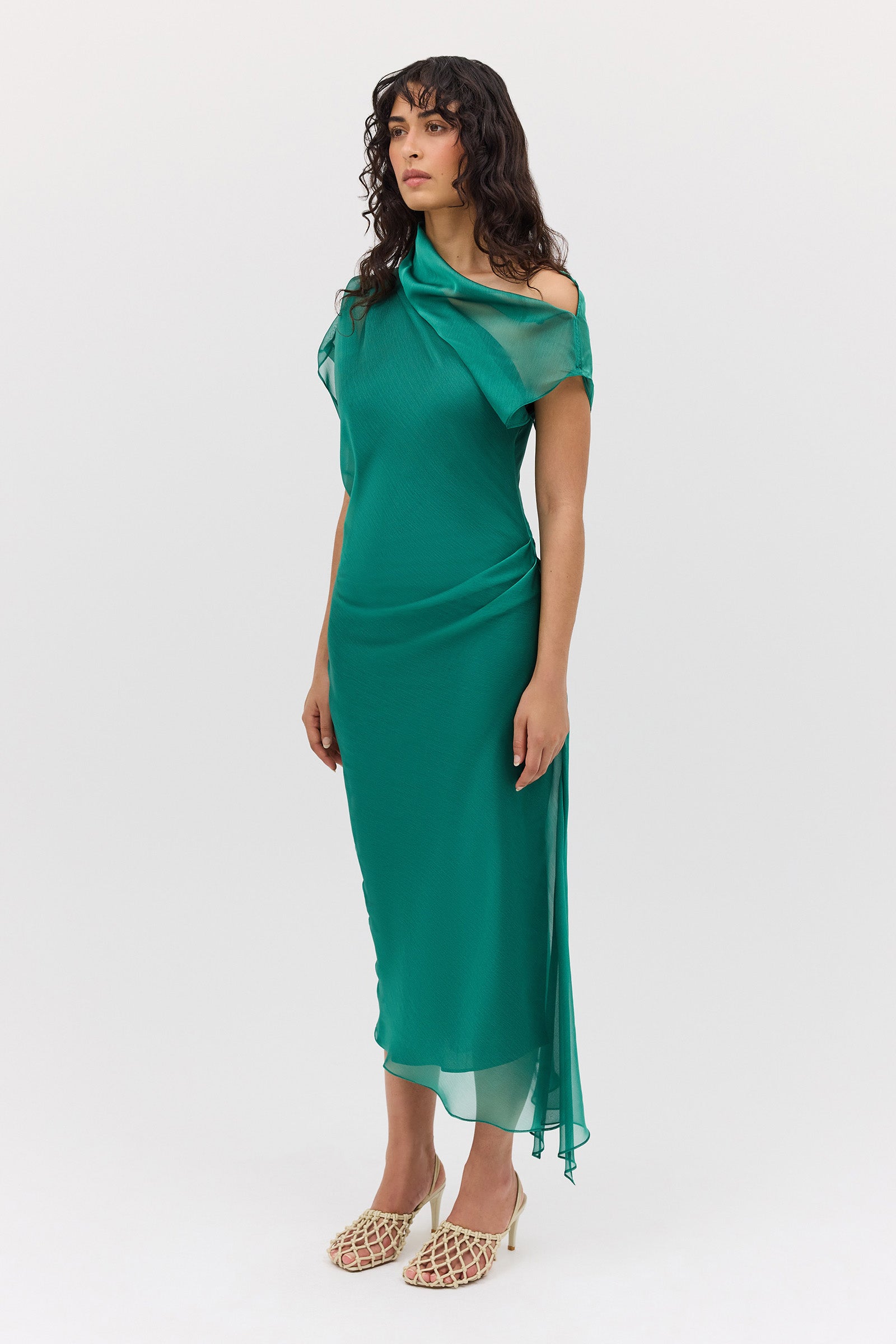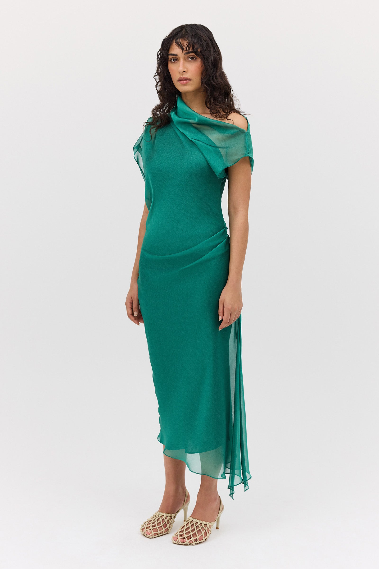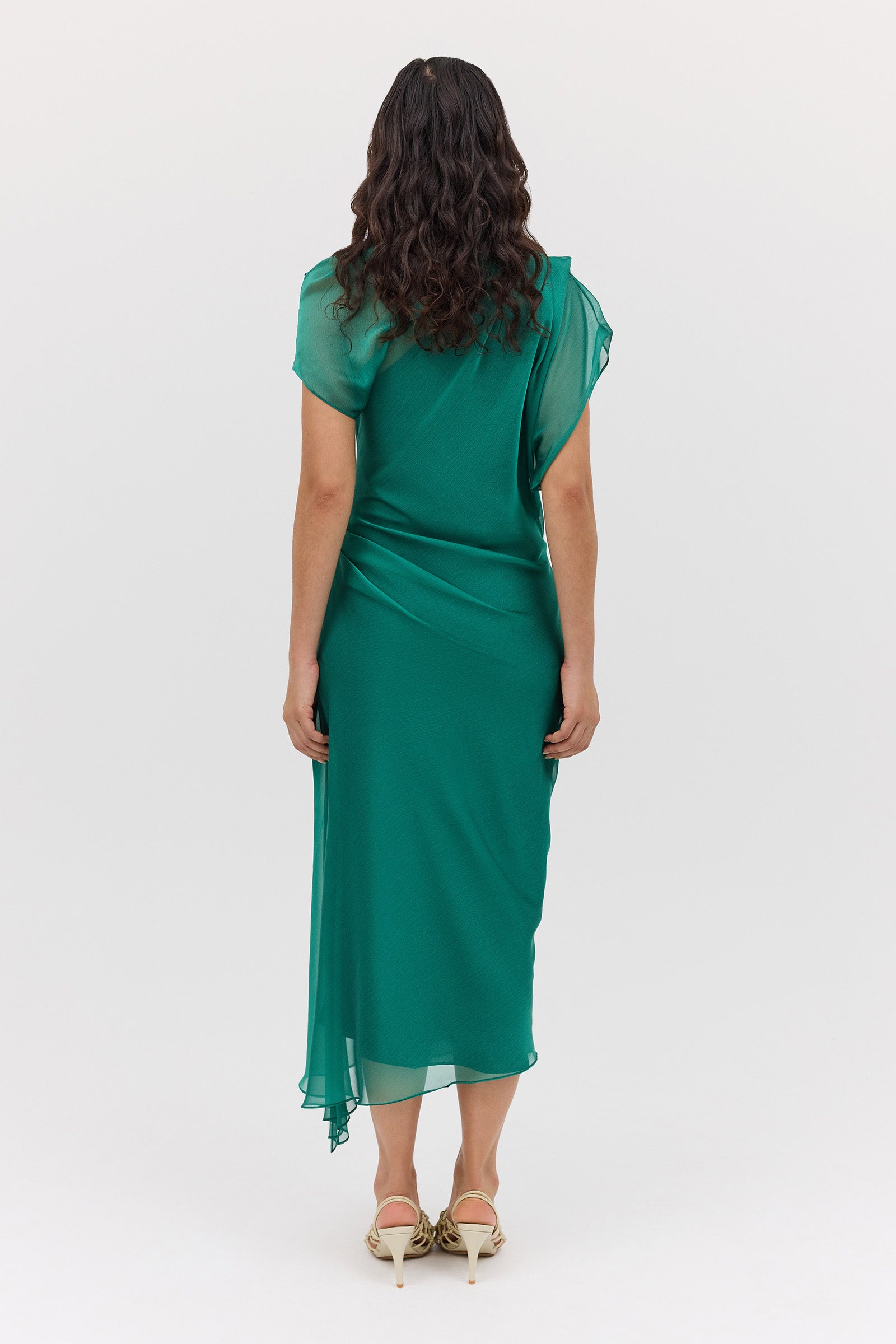 Introducing the Forest Chiffon Decode Dress. Crafted from a delicate satin chiffon with subtle sheen. The asymmetrical shoulder design amplifies the intimate notion of revelation and concealment. Signature origami-like folds and tucks allow the design to skim the form of the body, and add intricacy to the voluminous sleeve detailing. Fluid yet sculptural, the Decode Dress allows ease of movement for an unrestricted way of wear.