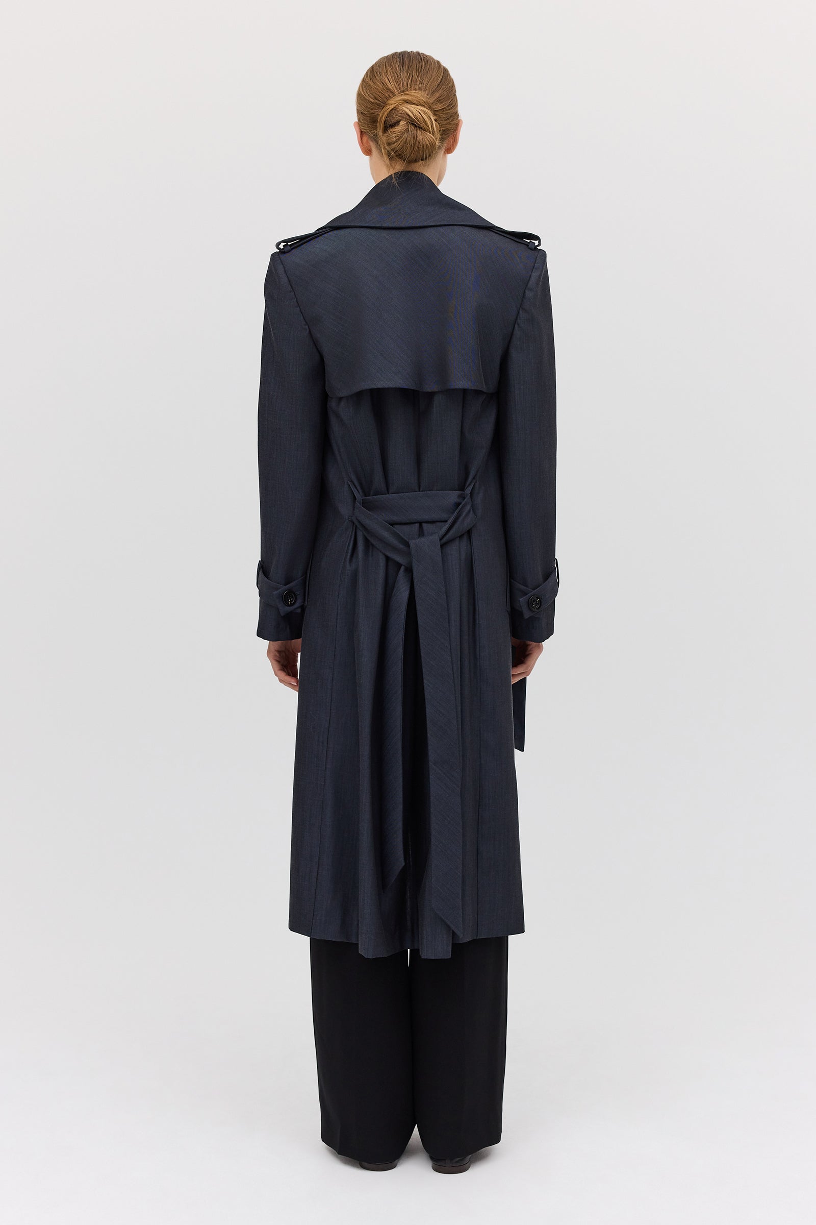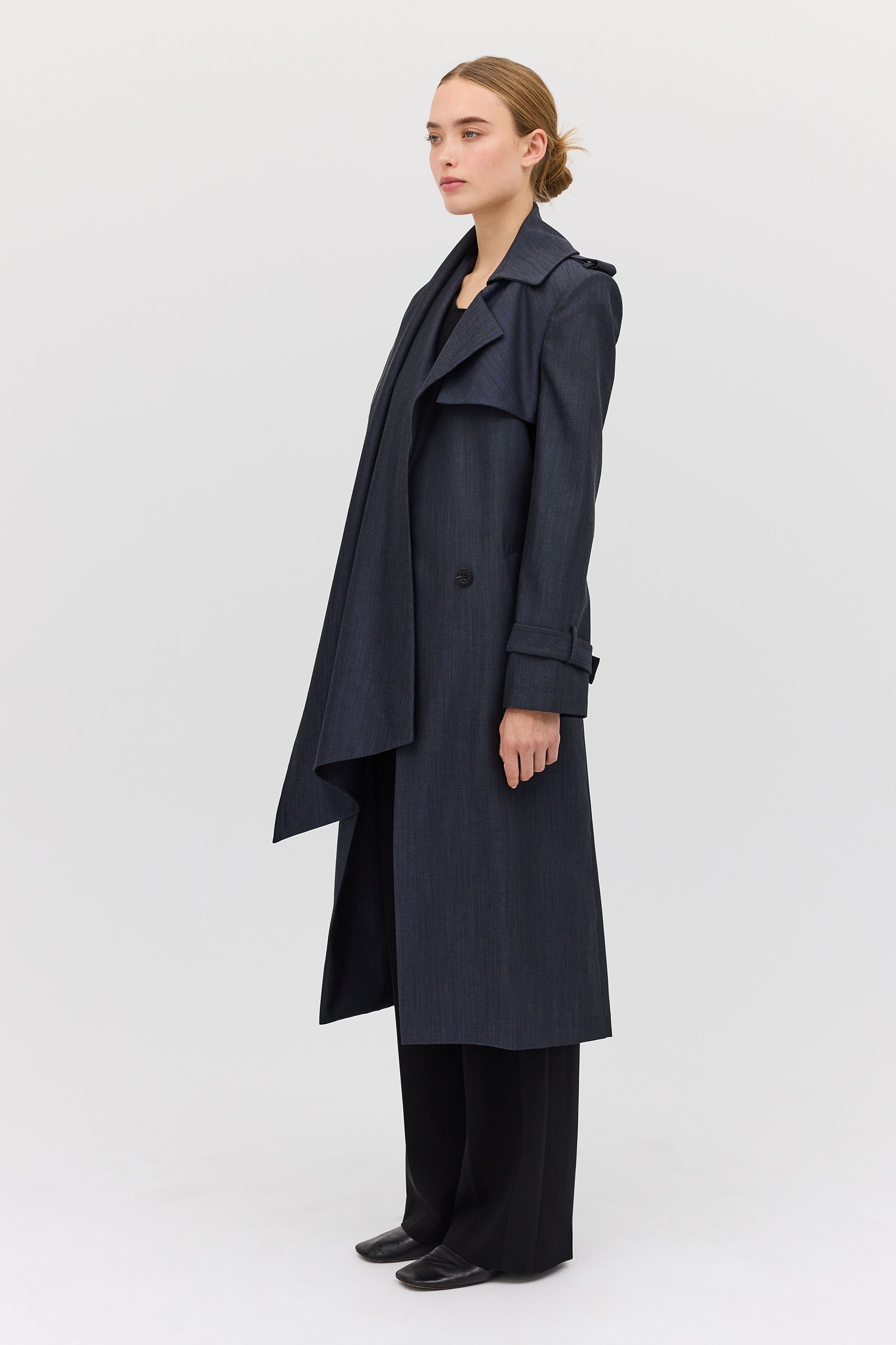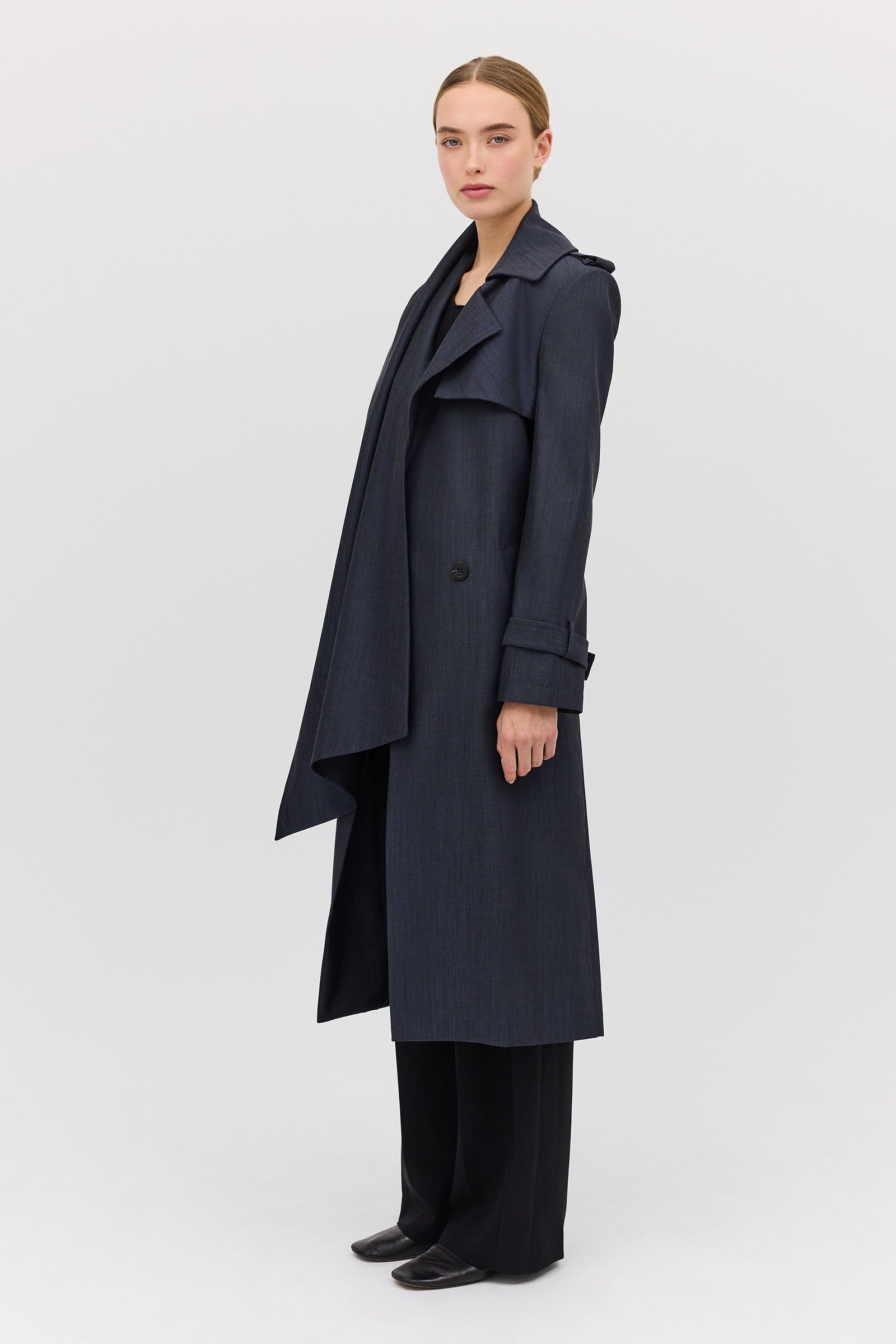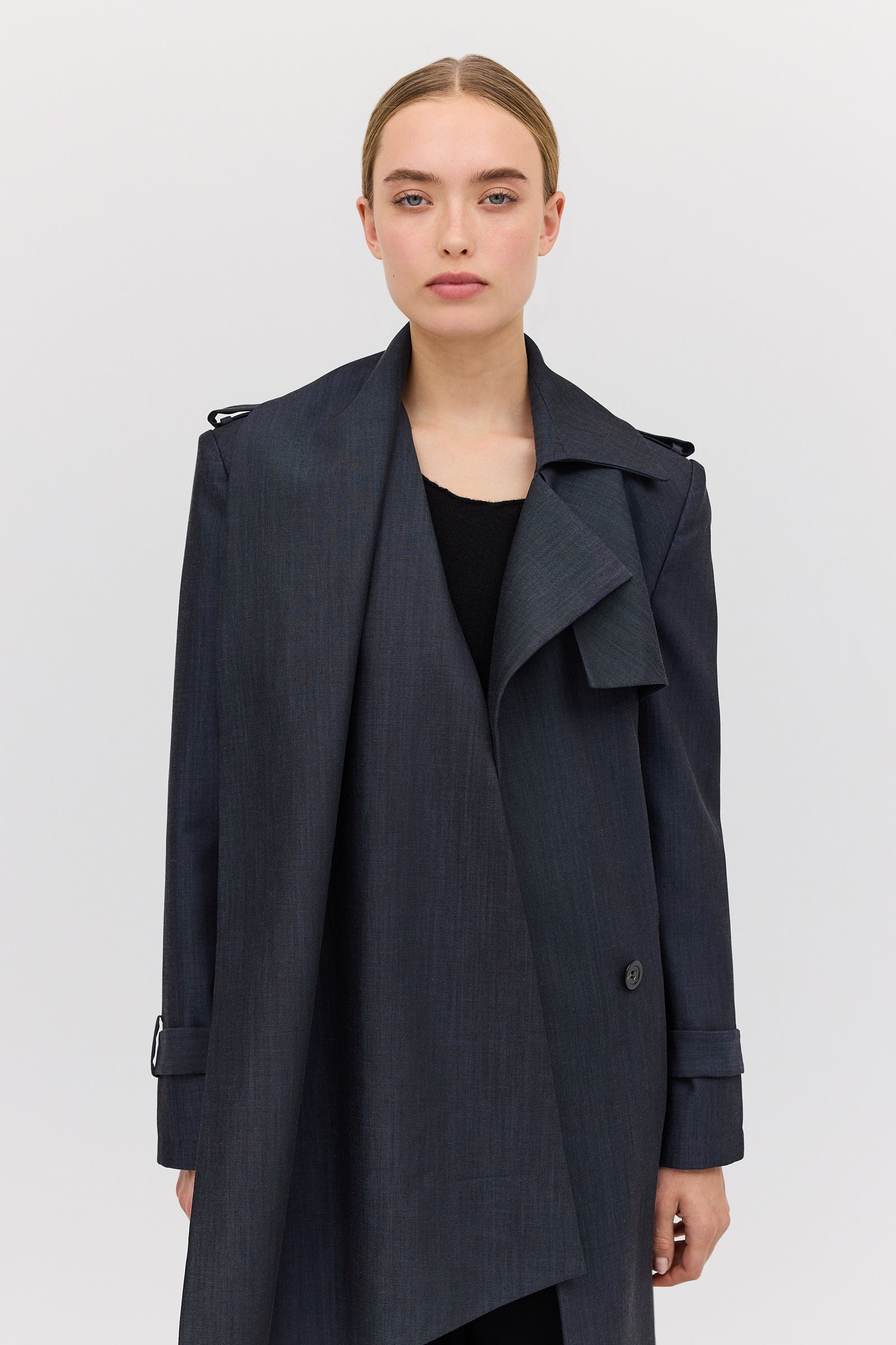 The Midnight Suiting l Veil Trench is a new season styling essential. Designed as the perfect transeasonal layering piece, with a sense of air and breathability present in the softly tailored details. An intentionally voluminous, enveloping style to allow for ease of movement as you go about your day-to-day. Featuring functional front pockets and shell button closures. The long, slightly wide sleeve features traditional tab detailing at the cuff as the final detail.