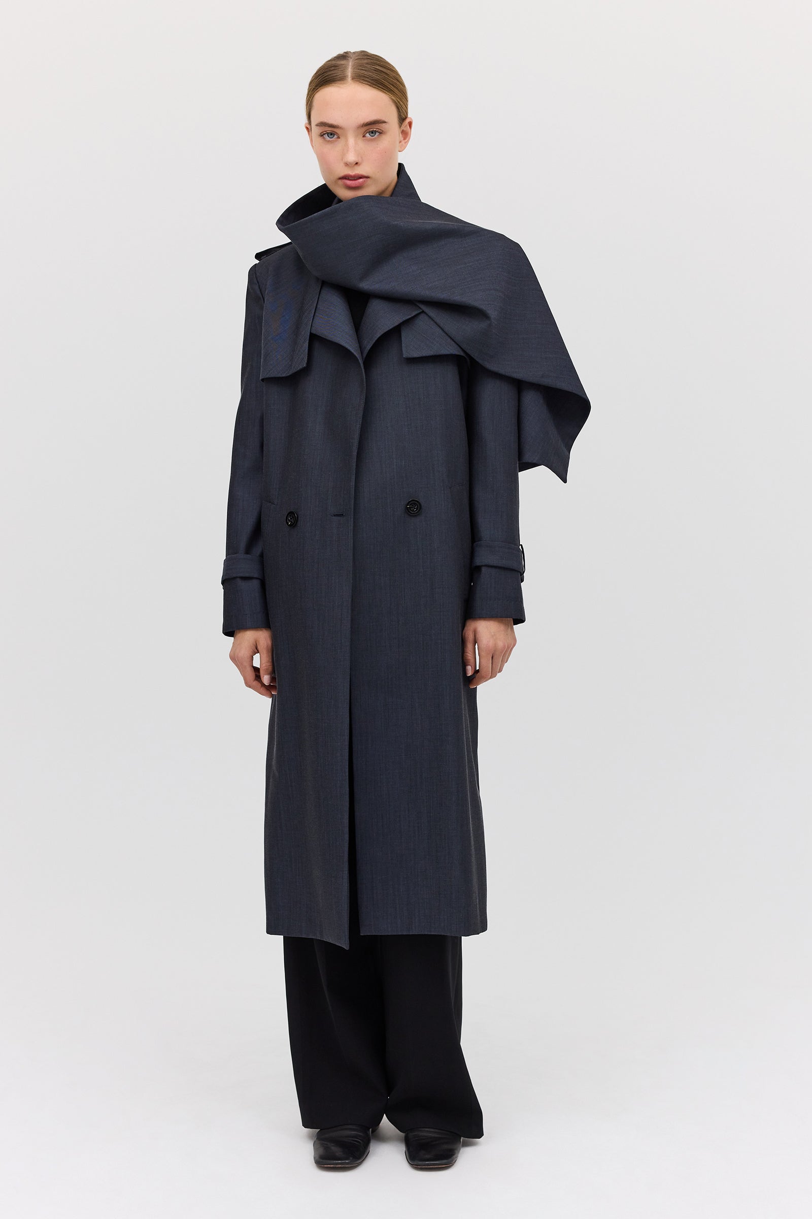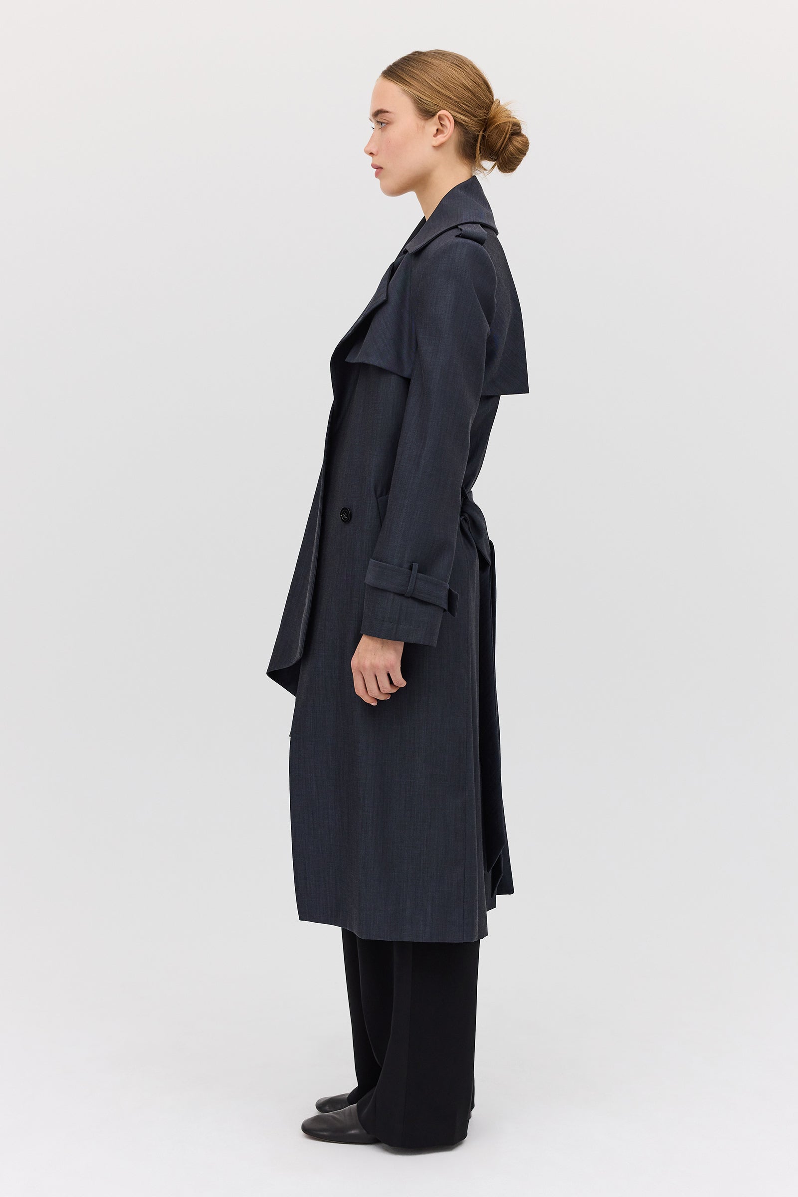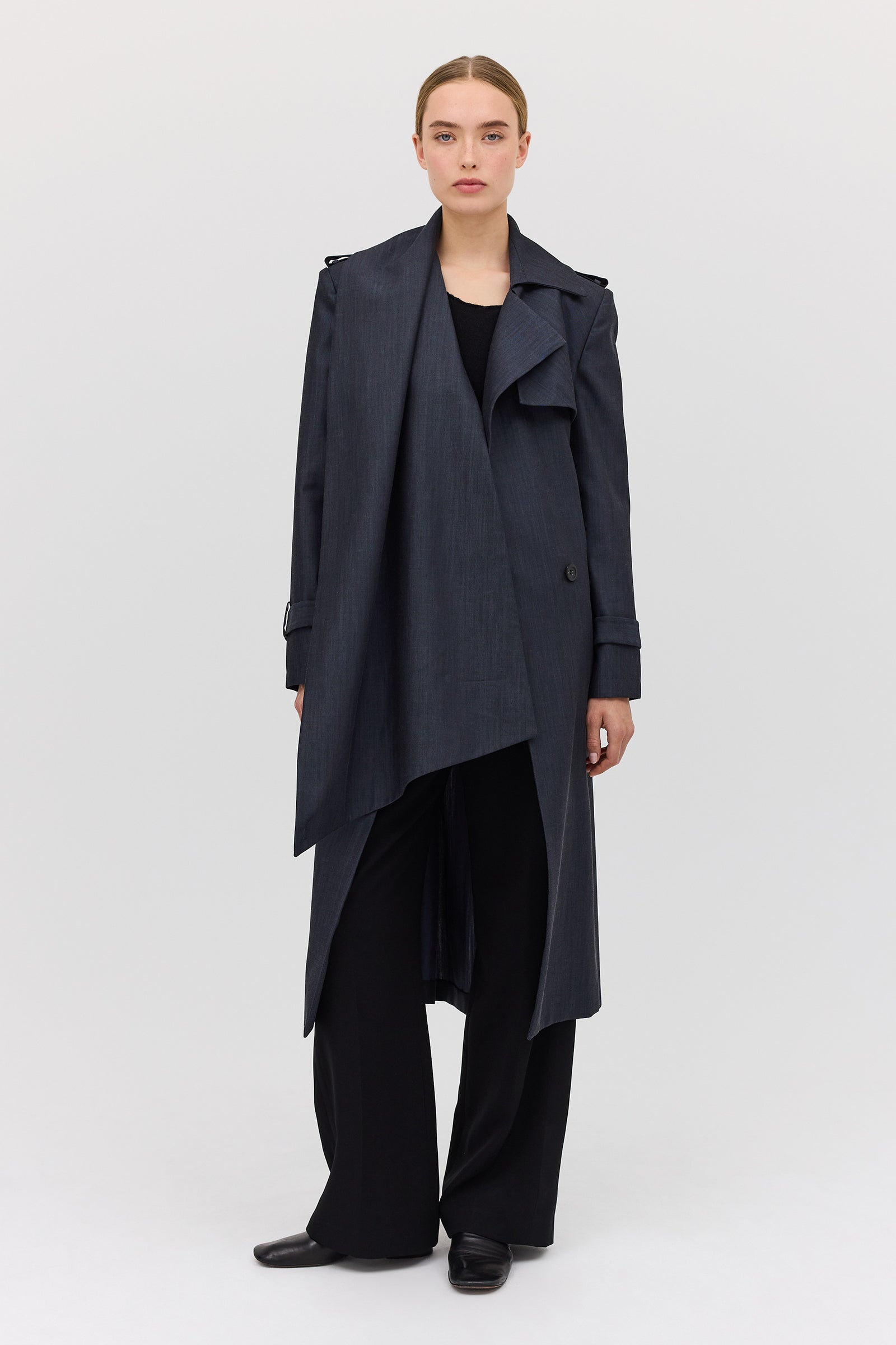 The Midnight Suiting l Veil Trench is a new season styling essential. Designed as the perfect transeasonal layering piece, with a sense of air and breathability present in the softly tailored details. An intentionally voluminous, enveloping style to allow for ease of movement as you go about your day-to-day. Featuring functional front pockets and shell button closures. The long, slightly wide sleeve features traditional tab detailing at the cuff as the final detail.