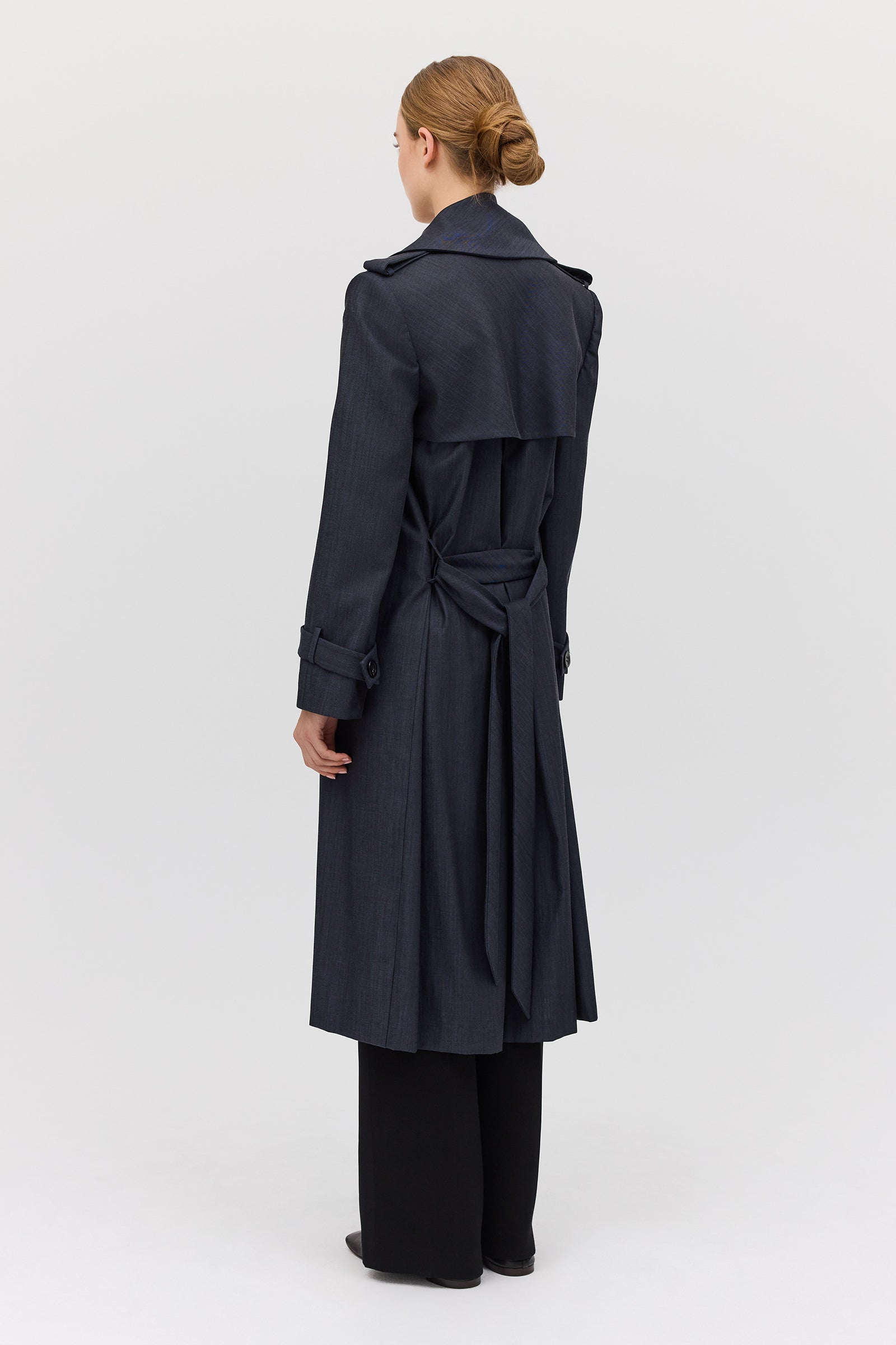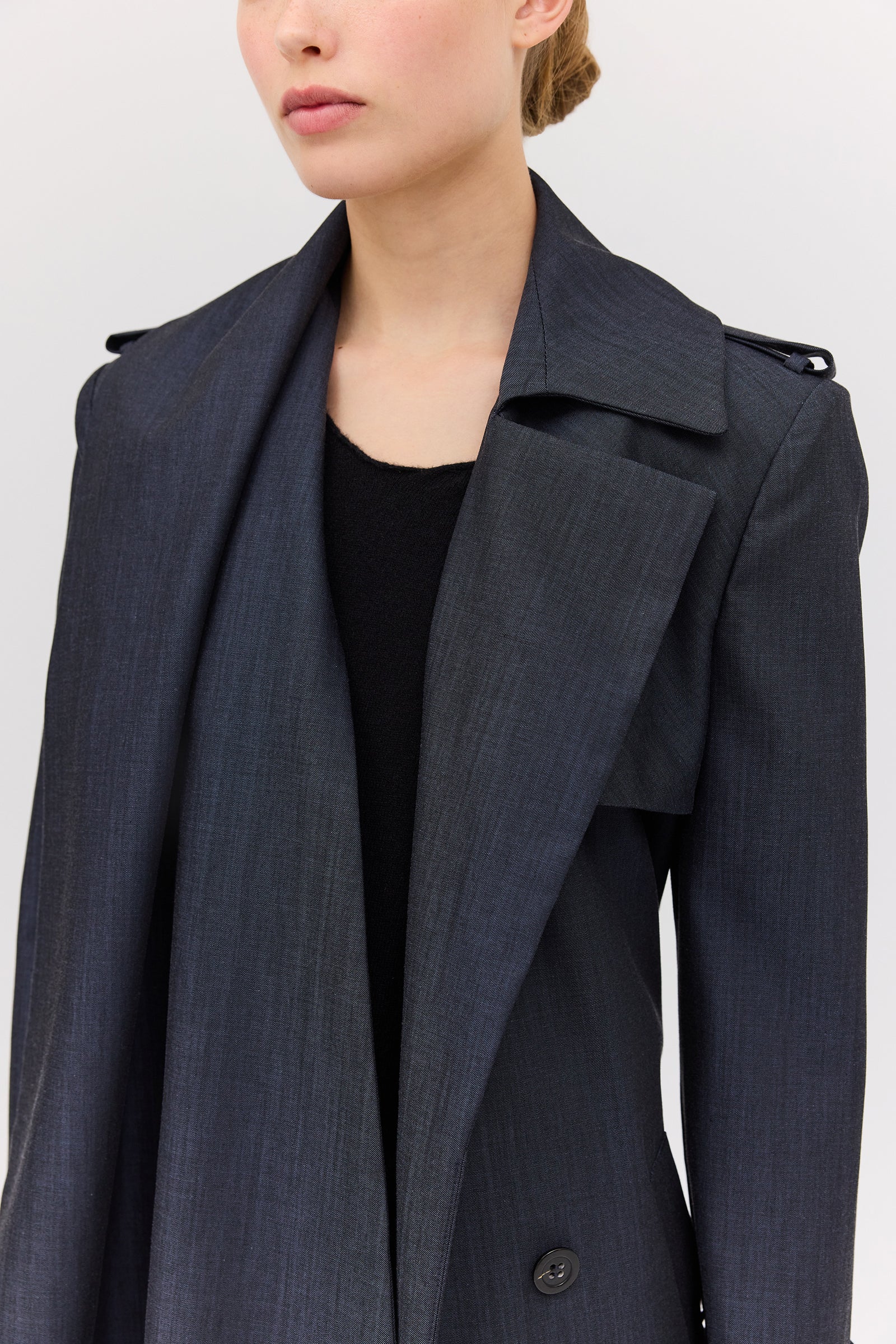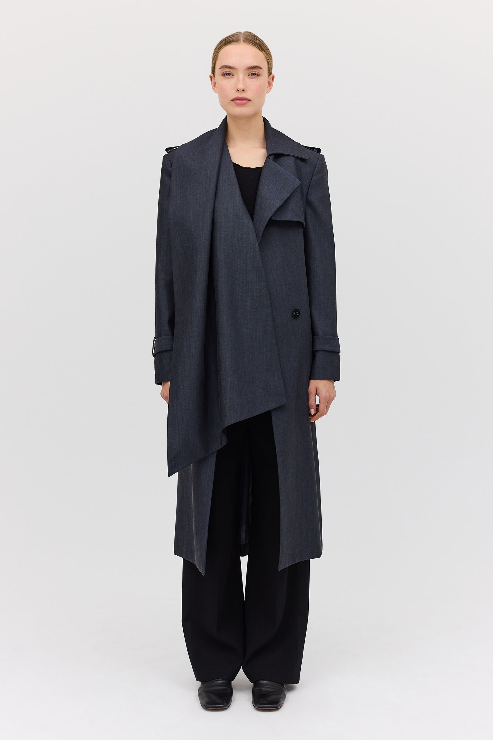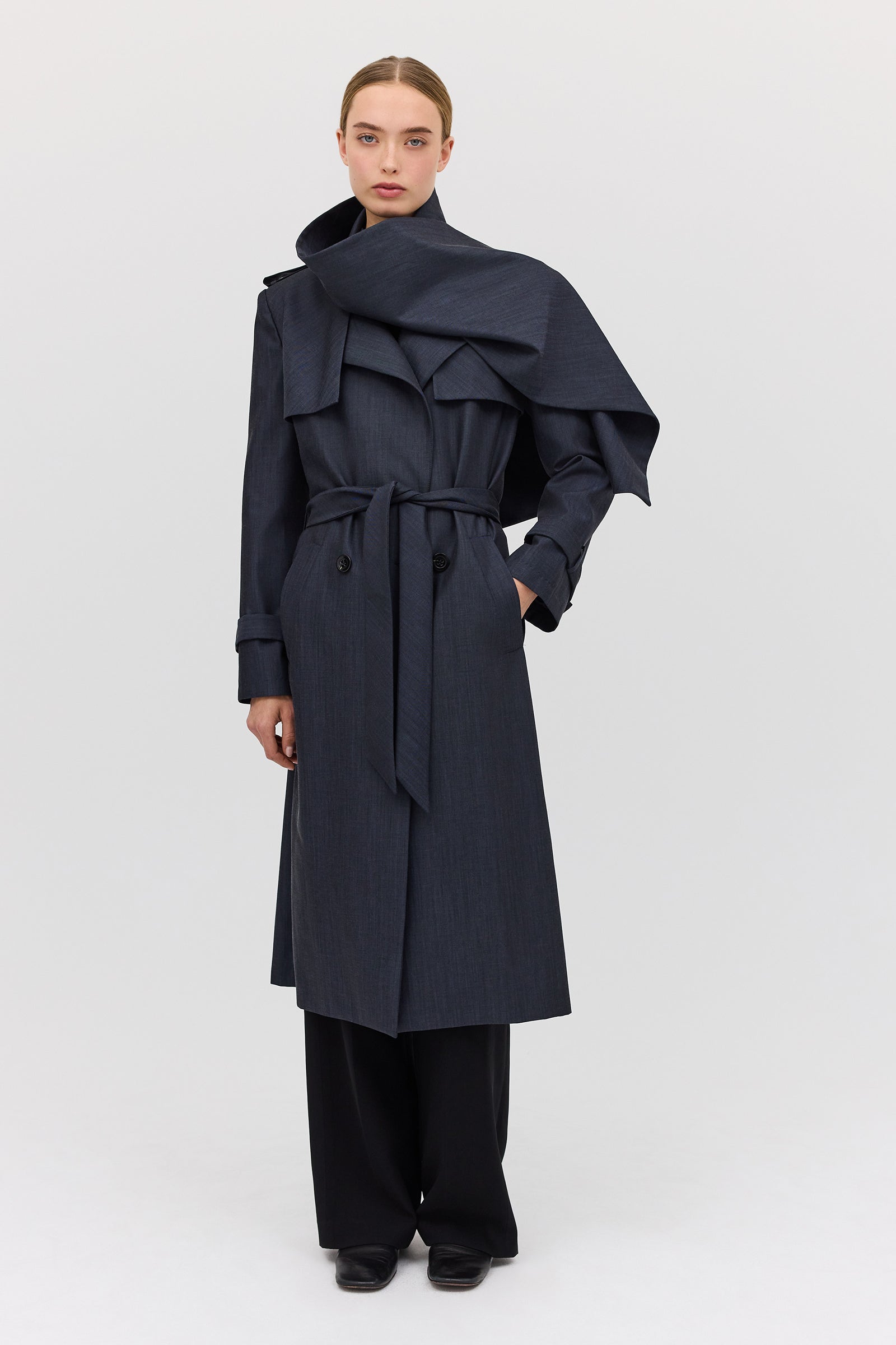 The Midnight Suiting l Veil Trench is a new season styling essential. Designed as the perfect transeasonal layering piece, with a sense of air and breathability present in the softly tailored details. An intentionally voluminous, enveloping style to allow for ease of movement as you go about your day-to-day. Featuring functional front pockets and shell button closures. The long, slightly wide sleeve features traditional tab detailing at the cuff as the final detail.