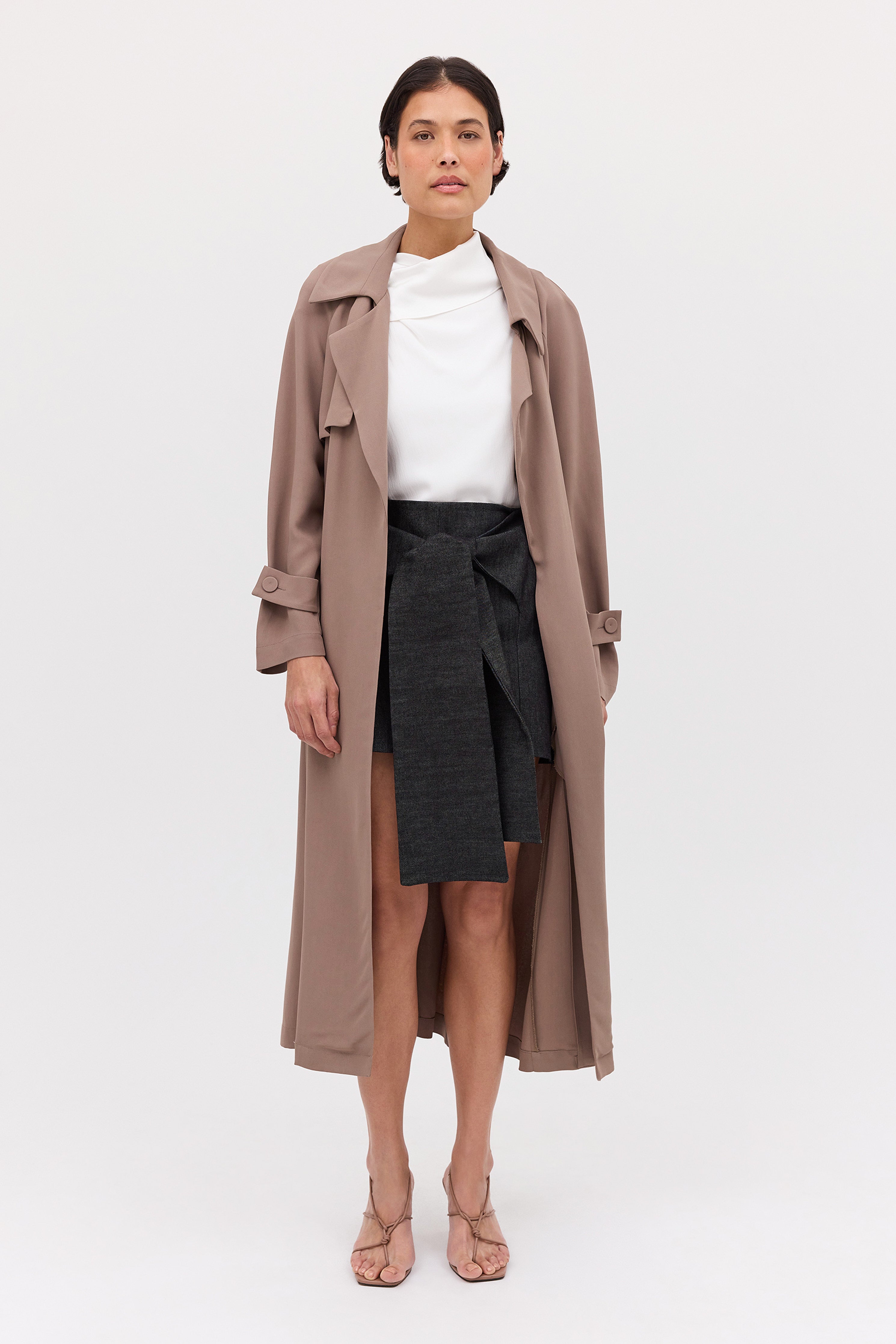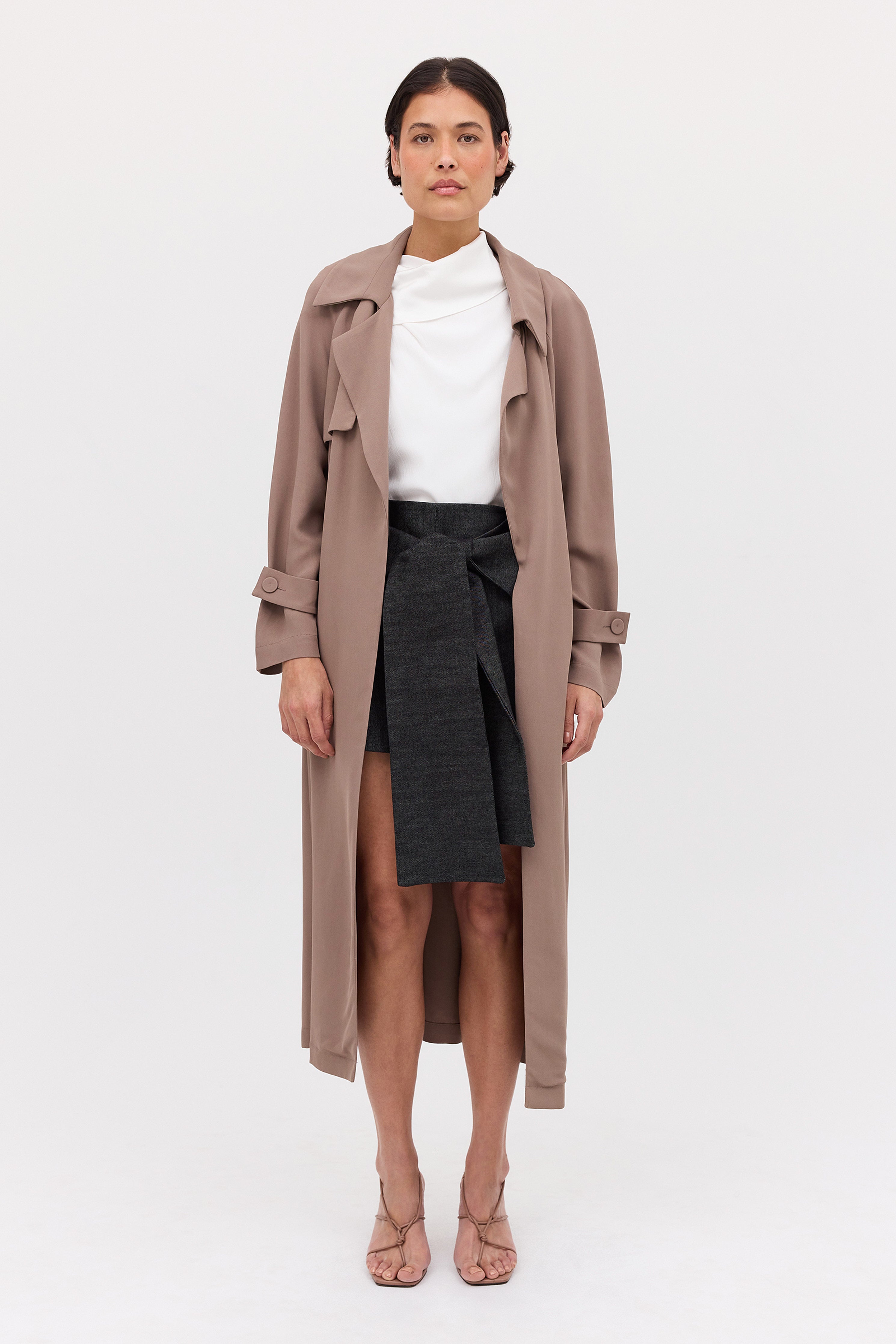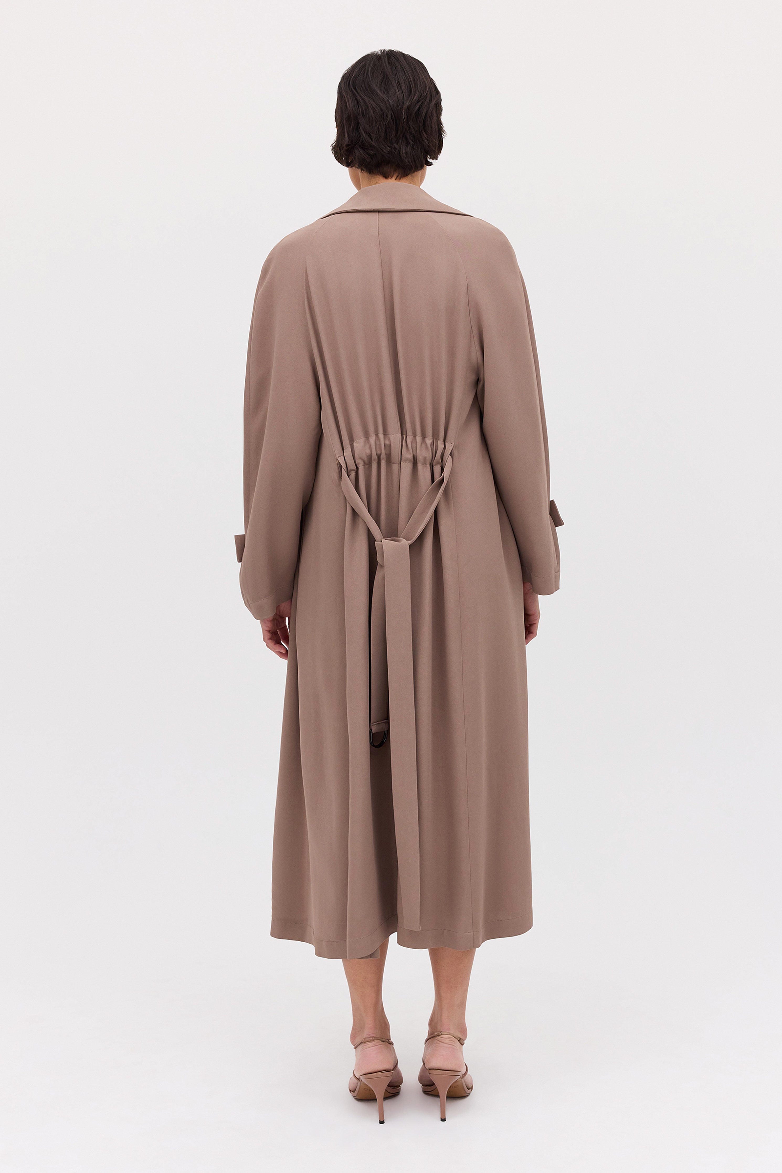 A timeless classic- The Henri Trench. This midi-length trench coat features a channel through the back waist with a self-belt and D-ring fastening. Crafted in fluidly draped taupe suiting, making it the perfect lightweight trench.