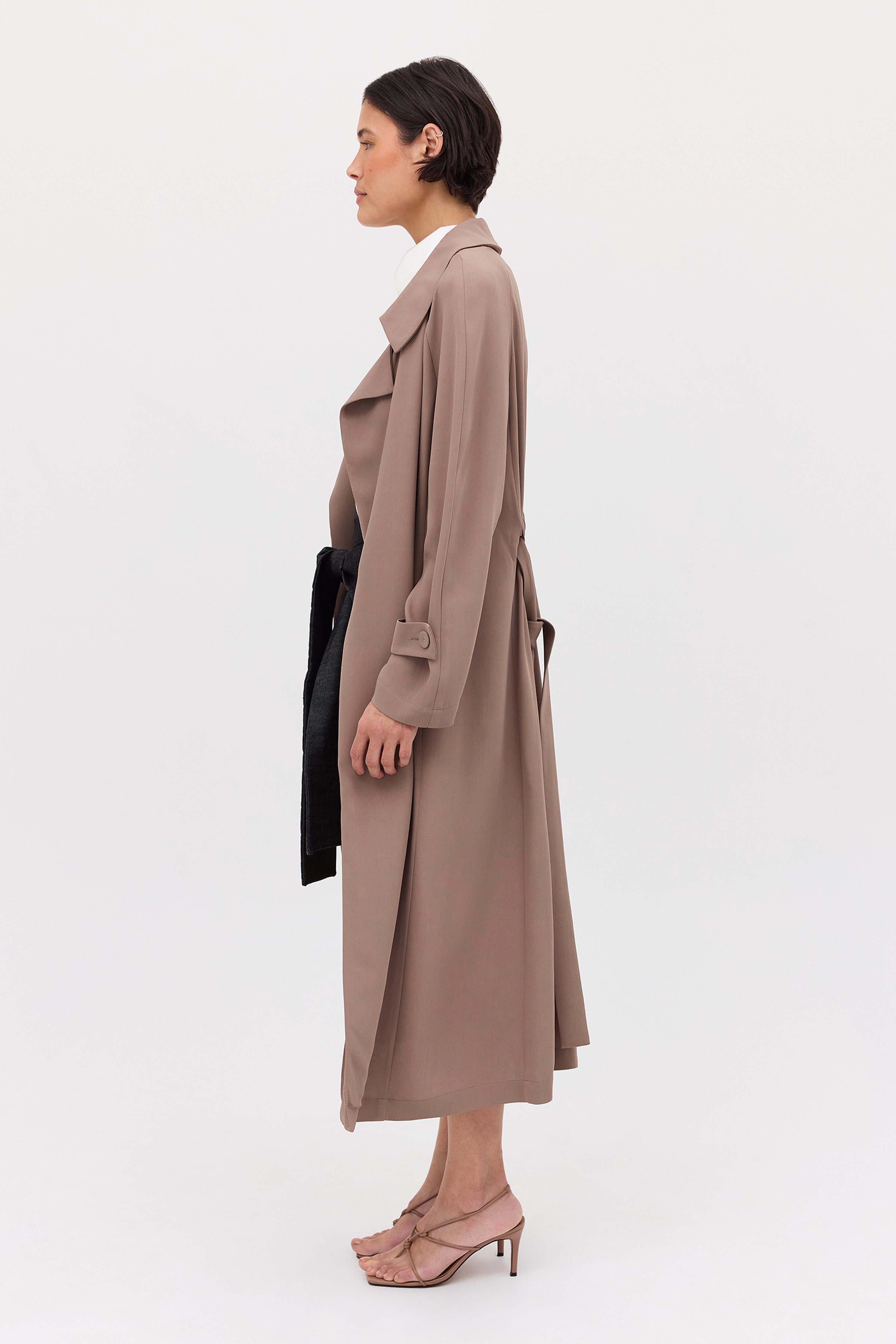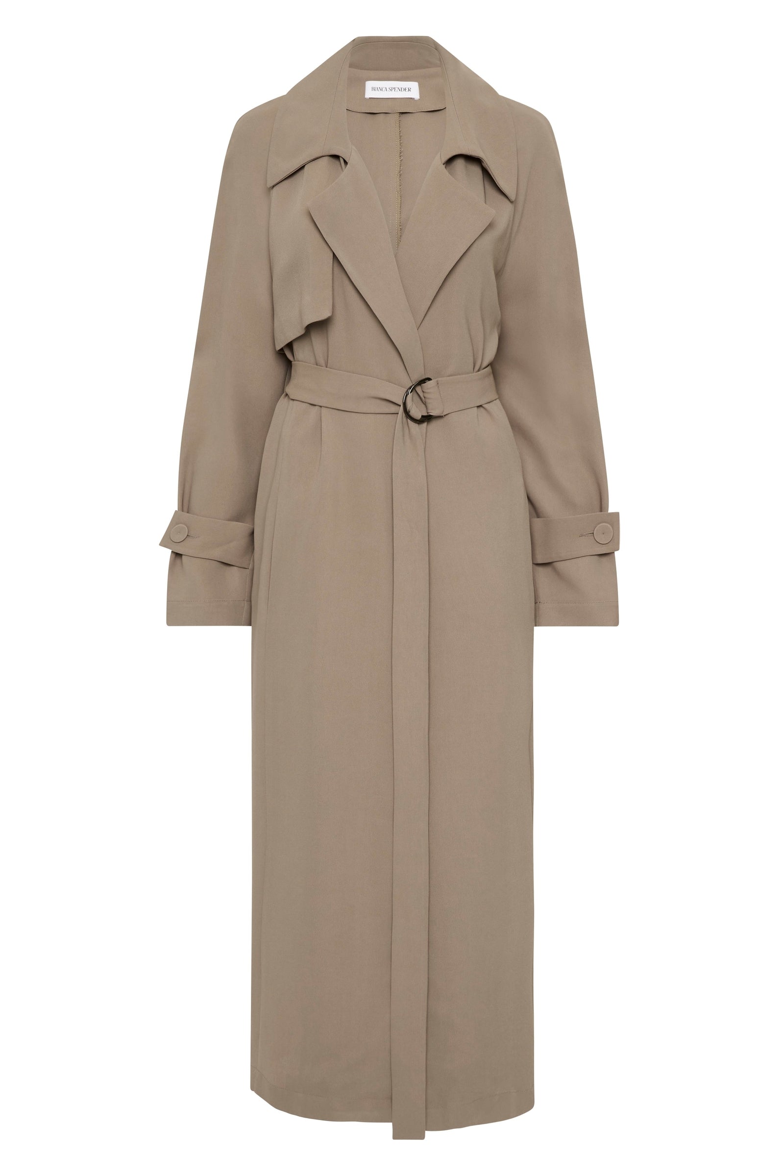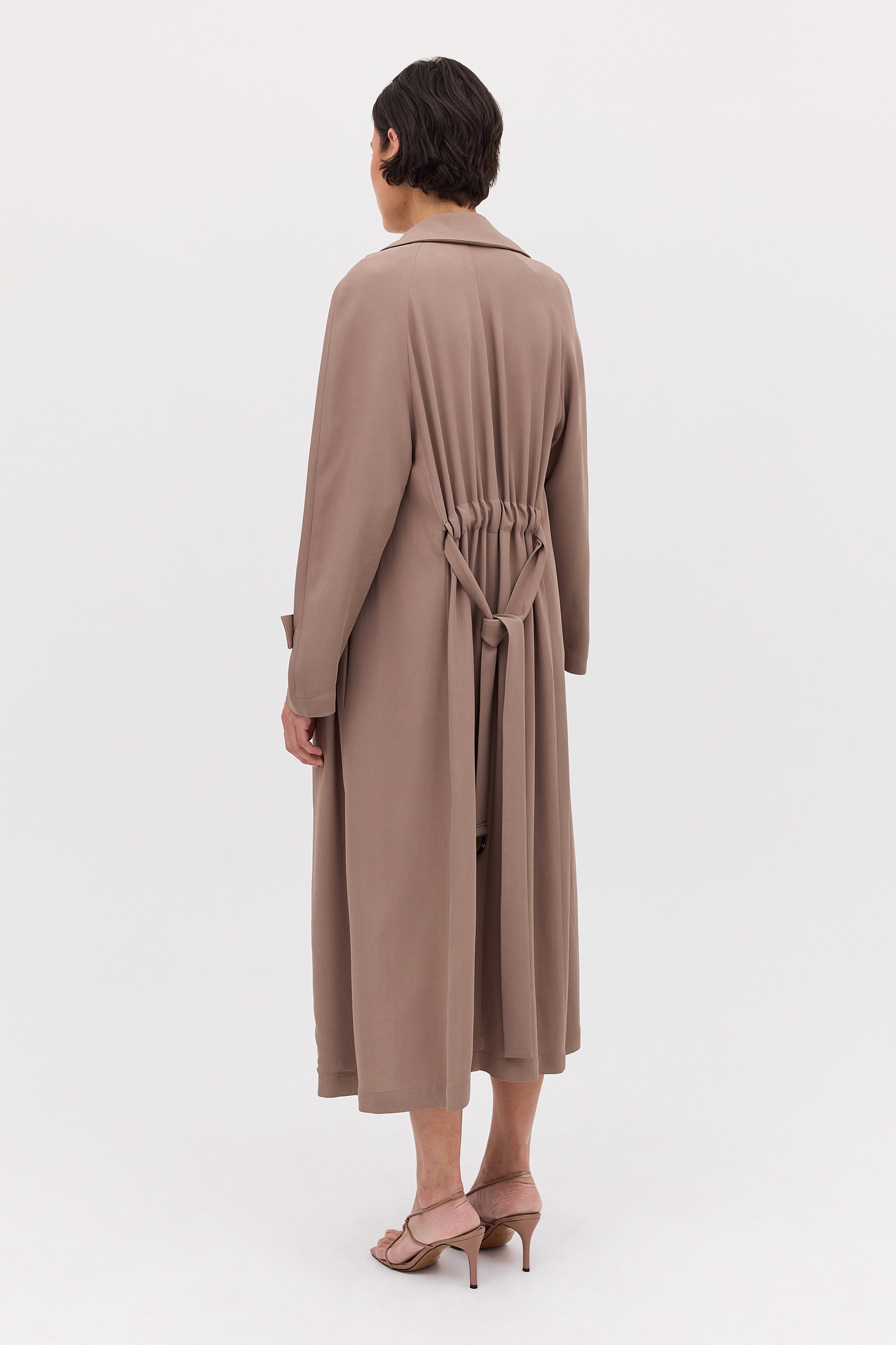 A timeless classic- The Henri Trench. This midi-length trench coat features a channel through the back waist with a self-belt and D-ring fastening. Crafted in fluidly draped taupe suiting, making it the perfect lightweight trench.
