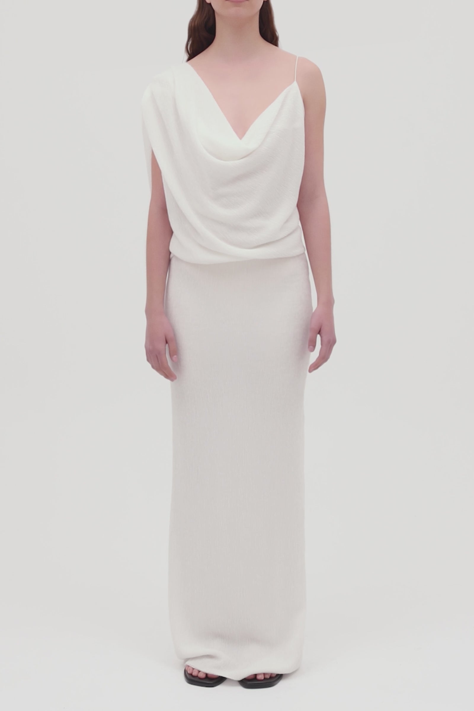 A new interpretation of our bestselling Liquid silhouette, now reimagined as a full-length dress in lightweight Japanese crinkle. Sculptural drape and soft asymmetry define the form - the cowl neckline falls effortlessly across the body, while the single strap and fluid folds create a sense of quiet drama.