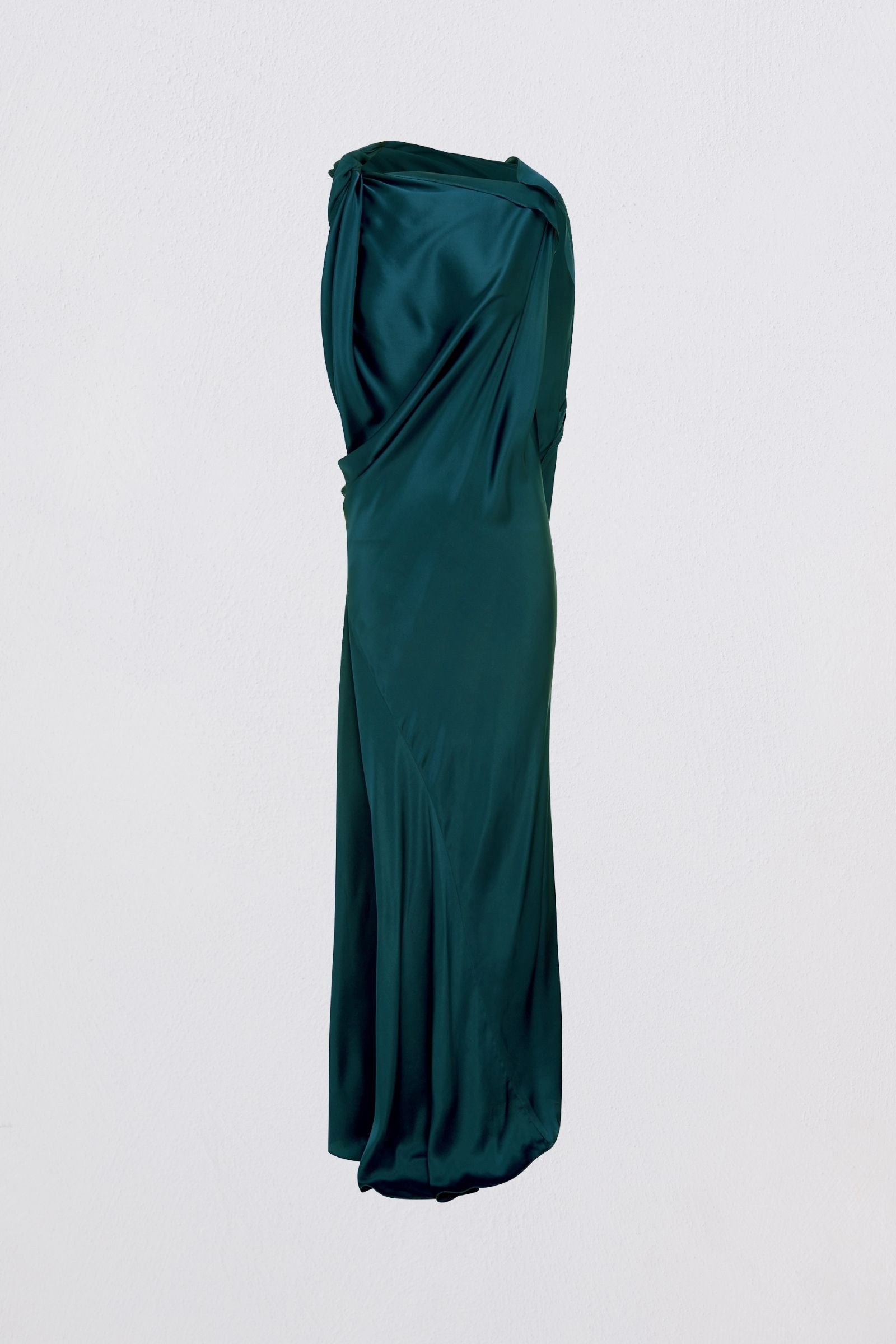 The Roma Gown is draped from a single length of cloth. Twisted and folded to accentuate and elongate the body, this stunning style is cut in our seasonless Petrol silk. With its draped bodice and contouring stitching across the skirt, the Roma Gown is an unforgettable piece. A reversible style that can be worn either way.