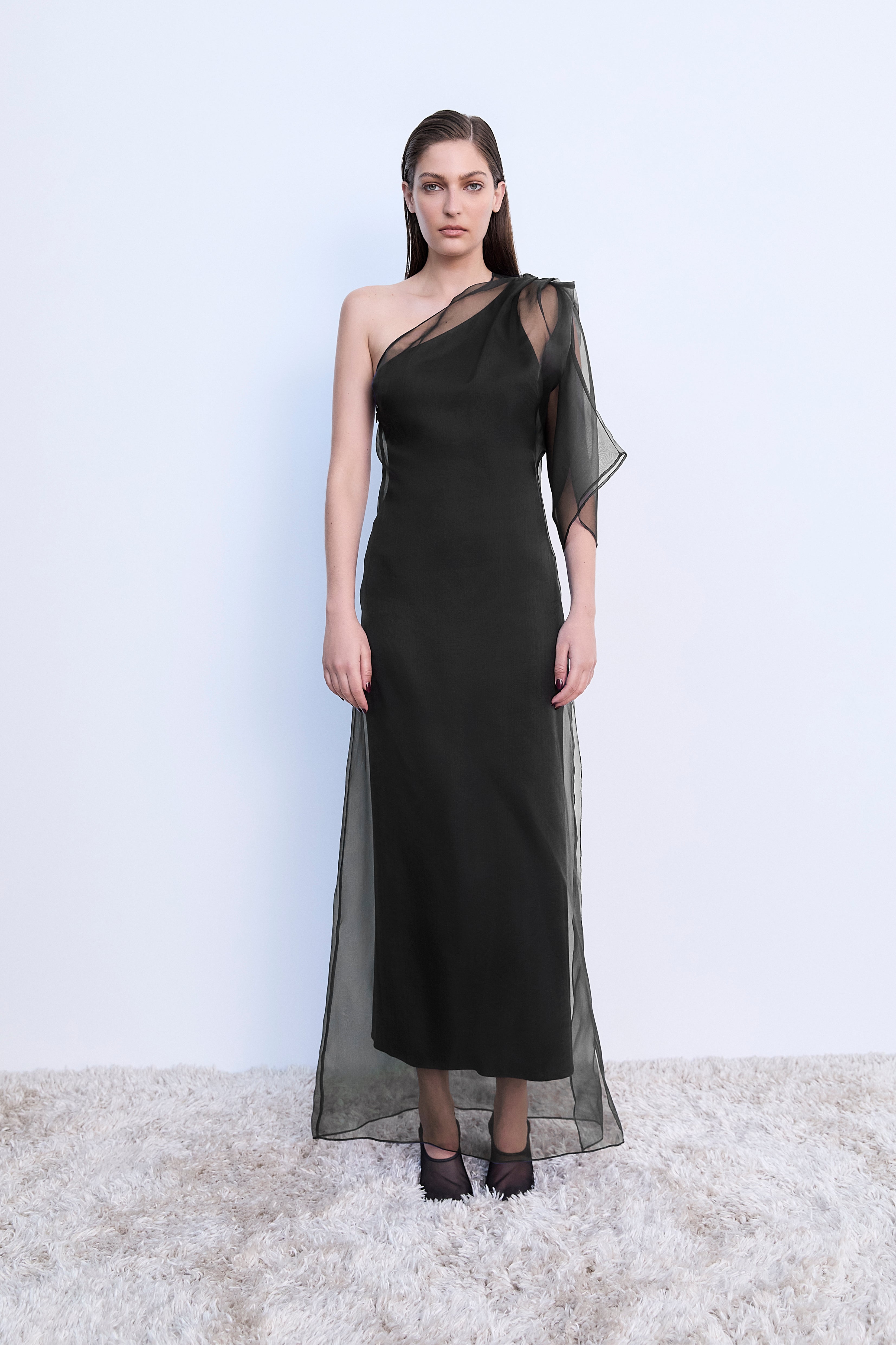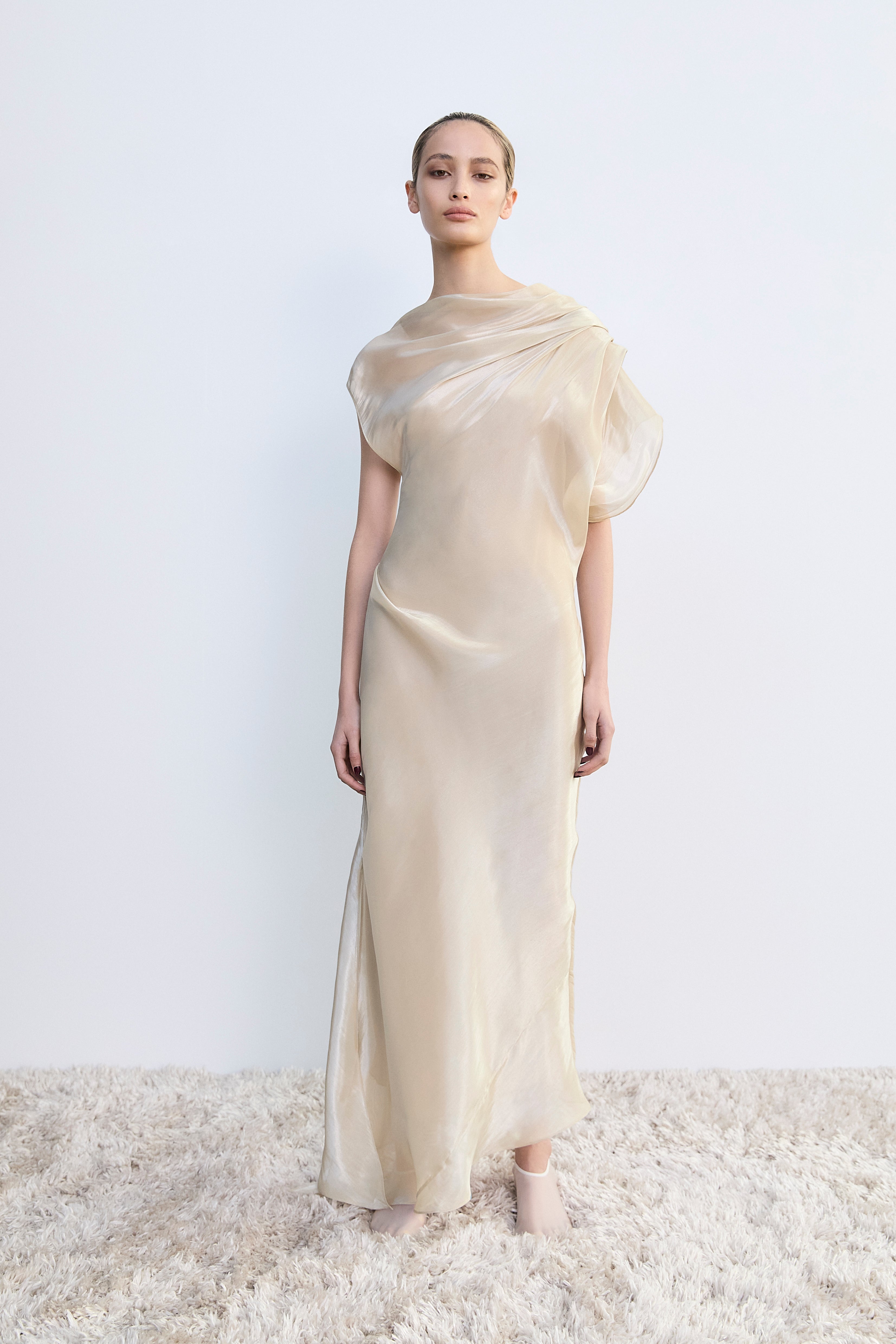 CHAMPAGNE LIQUID ORGANZA DECODE DRESS
