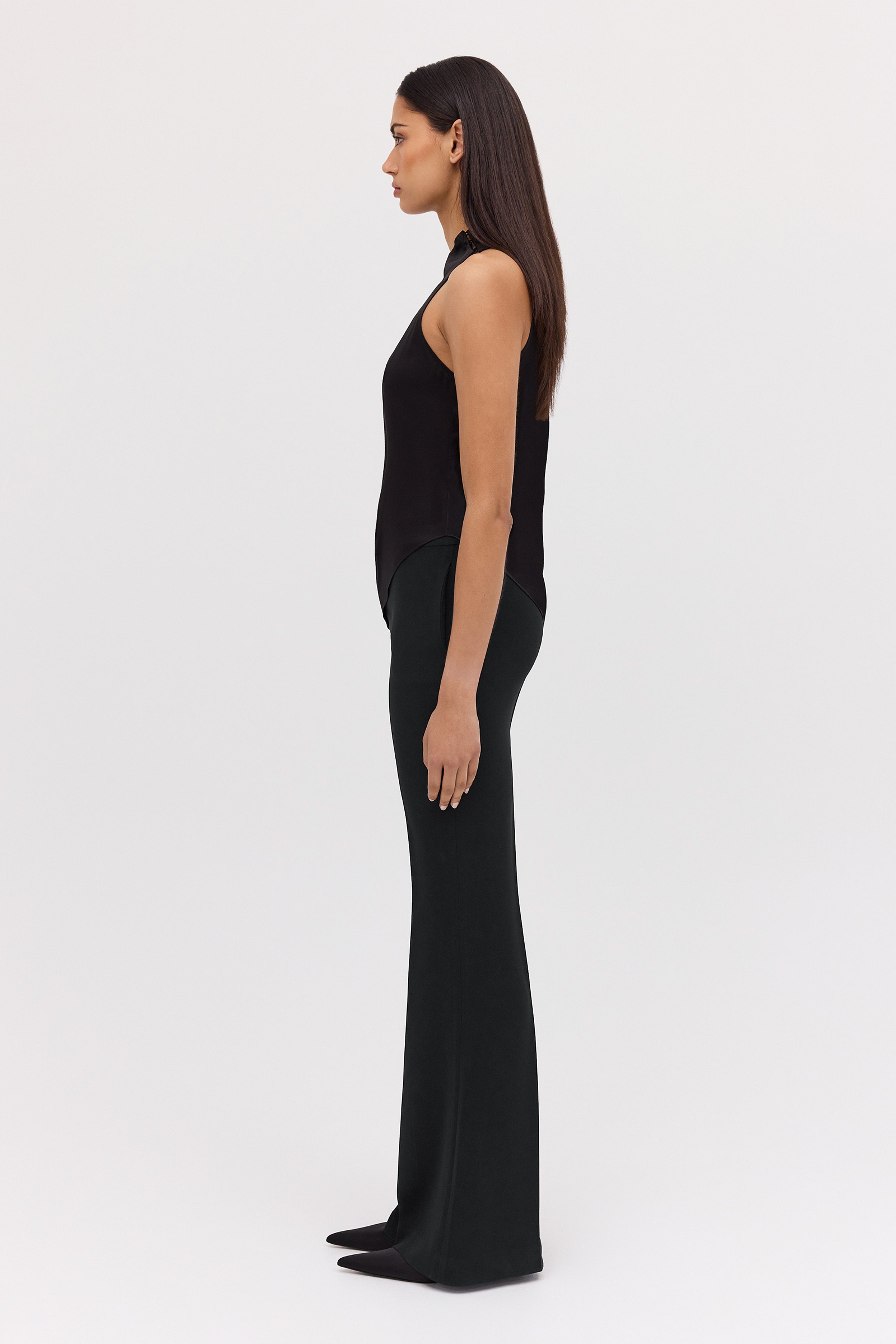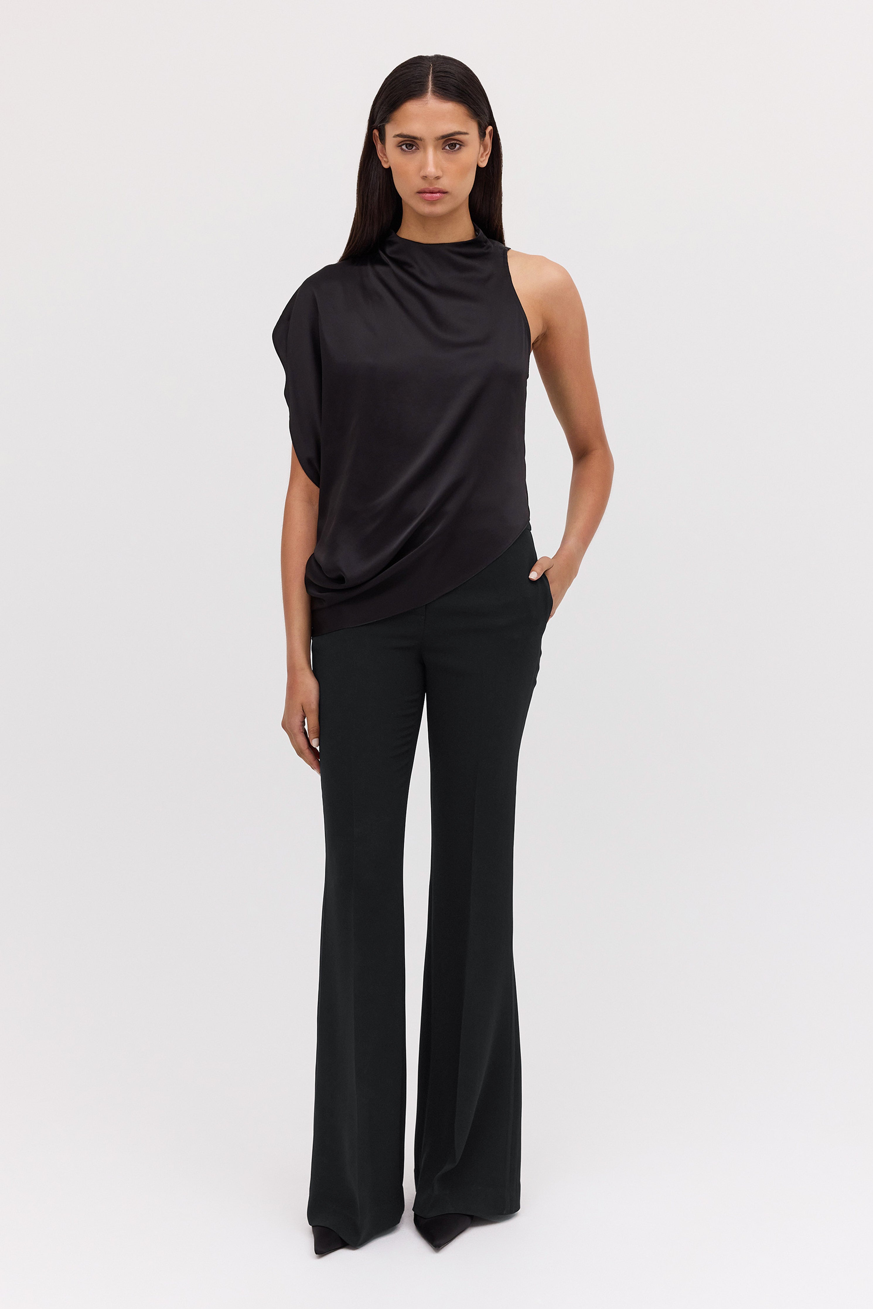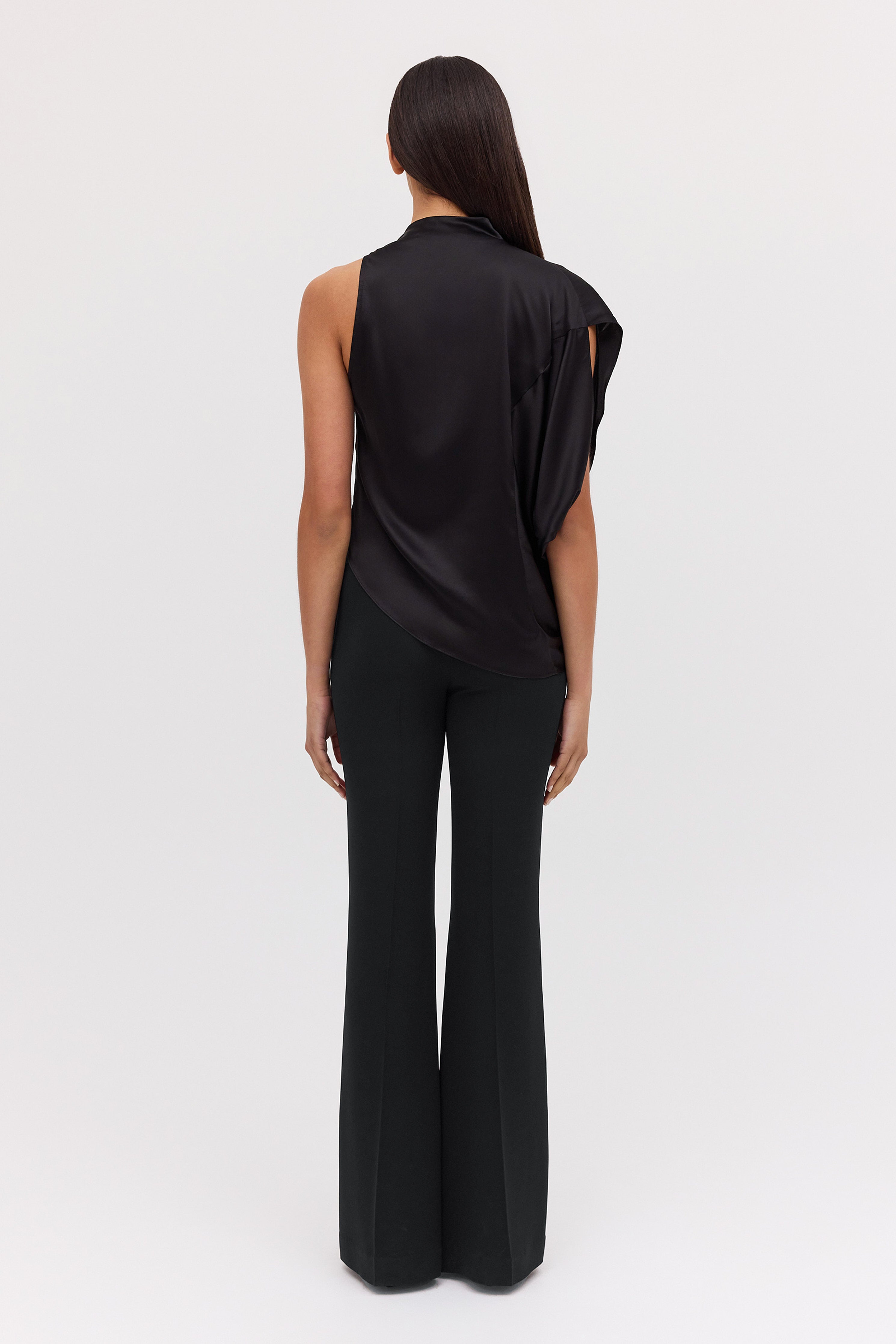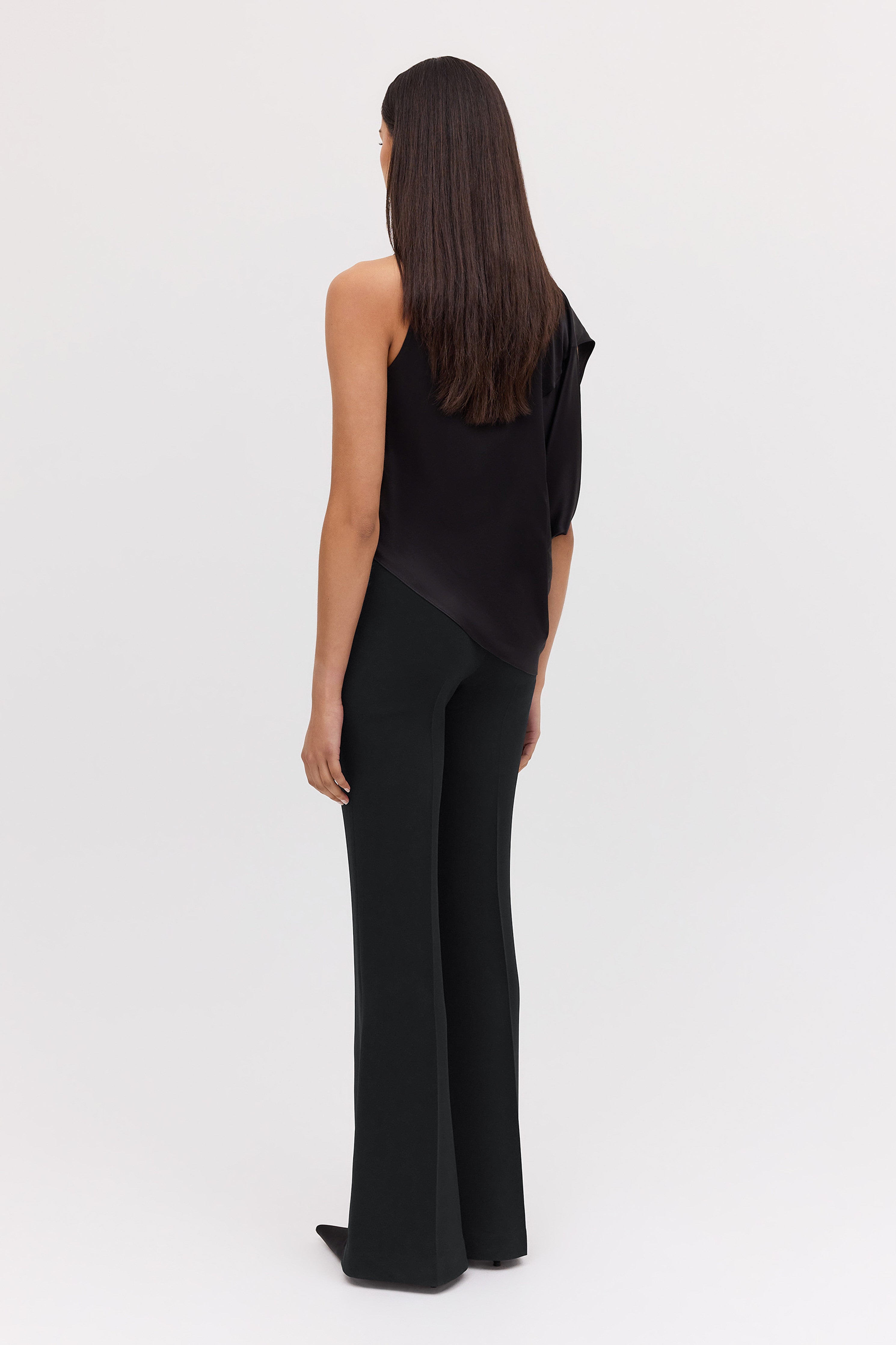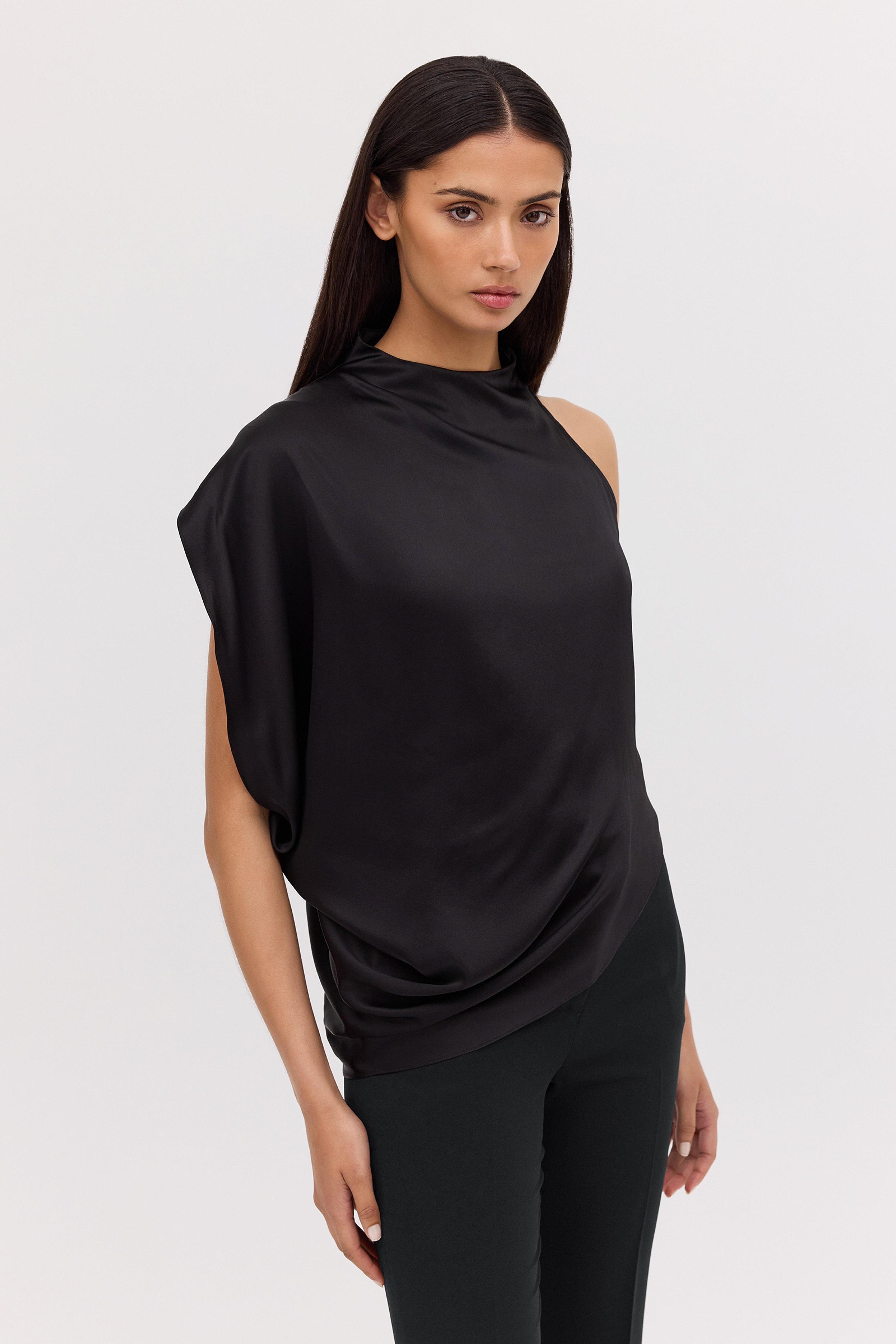 A modern classic. The Black Satin Infinite Top is a fresh take on the timeless white t-shirt. Featuring an asymmetrical one-shoulder design, that fluidly drapes into an asymmetrical hemline, giving a relaxed, effortlessly chic appearance. Covered buttons on the right shoulder add the final touch, showing that chic is all in the details.