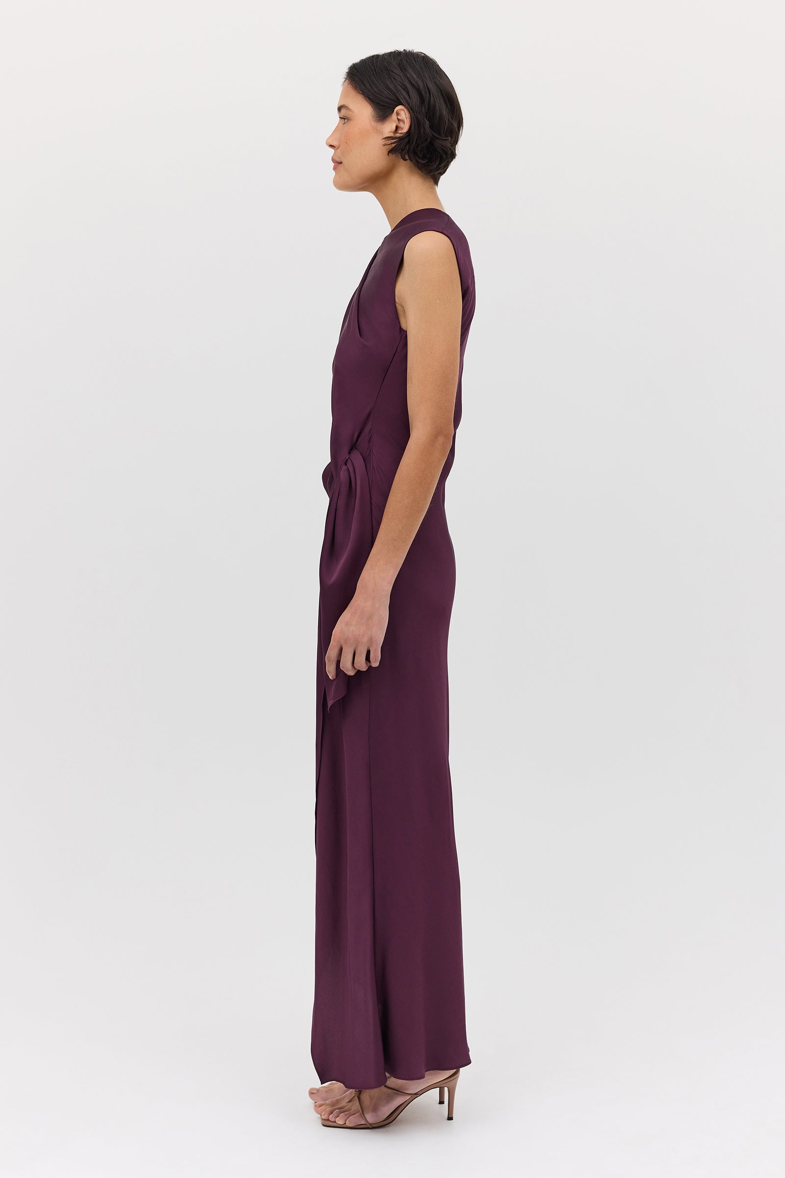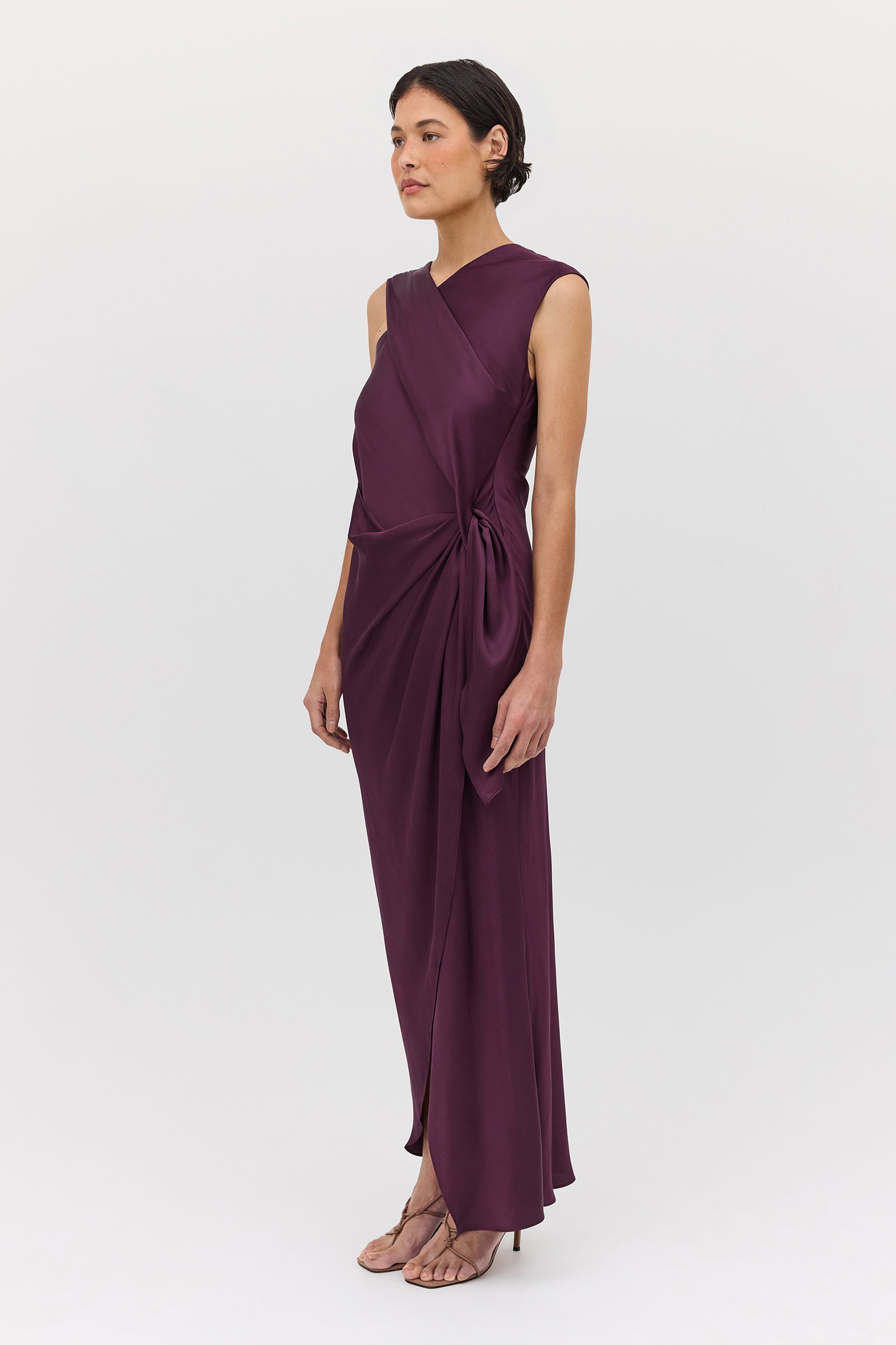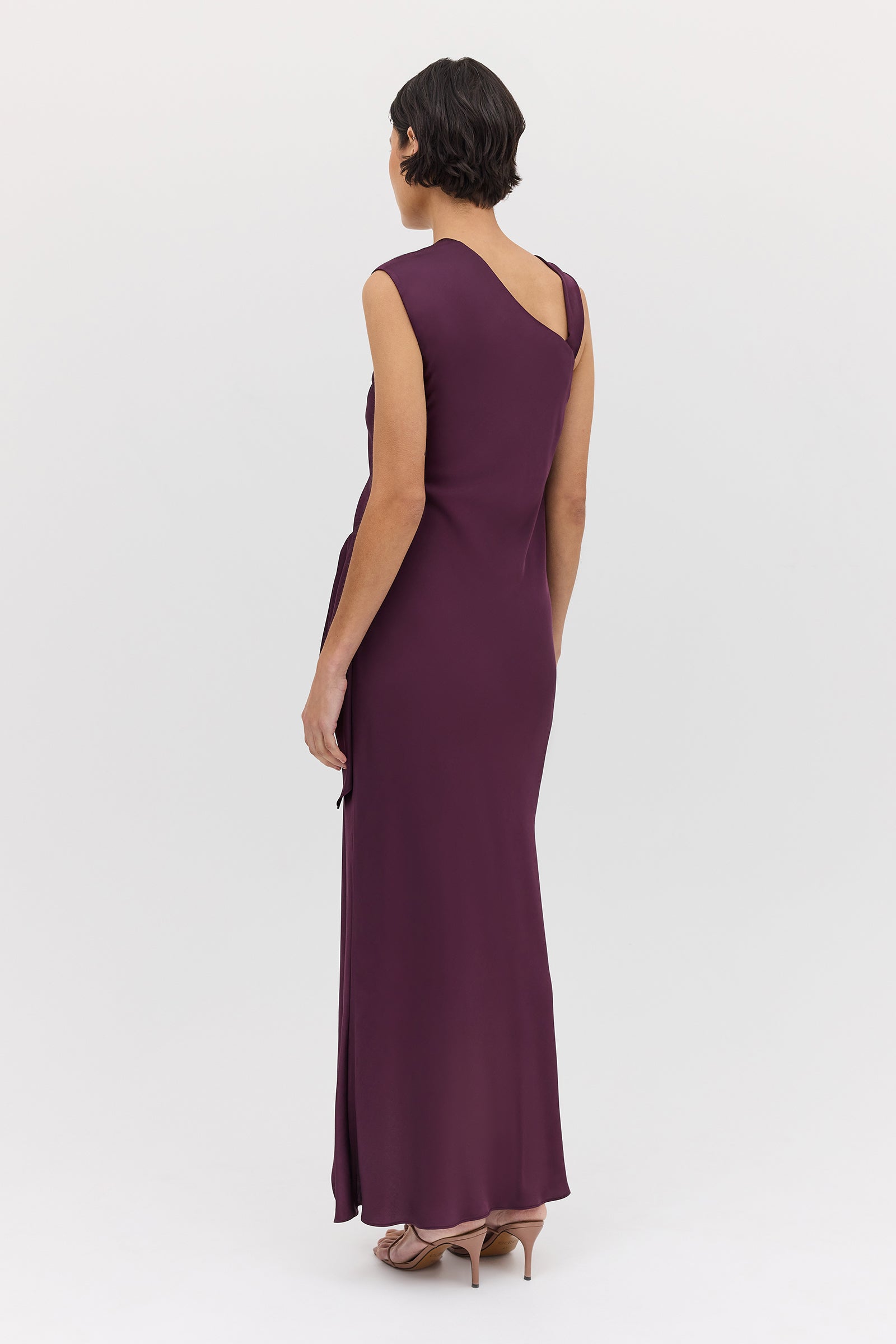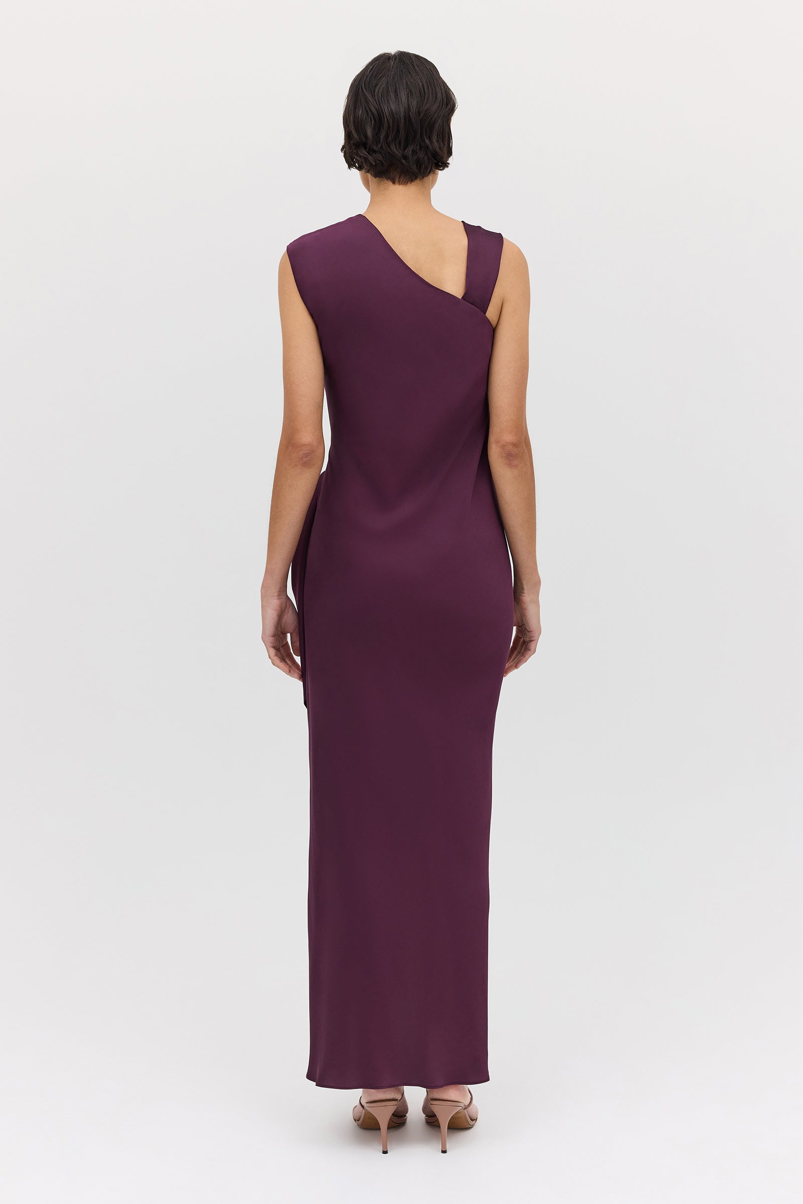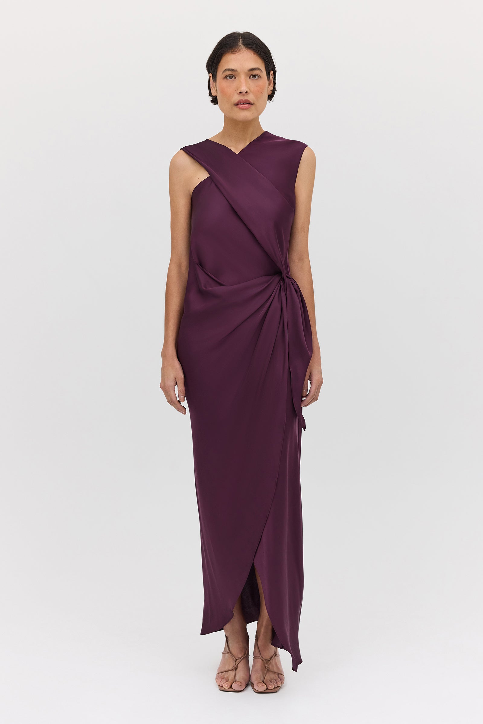 Living in a dream. The Deviation Gown dress radiates in jewel-toned Aubergine Satin. With its gathered detail, asymmetric panels, and flowing ribbons, this style will take your breath away.