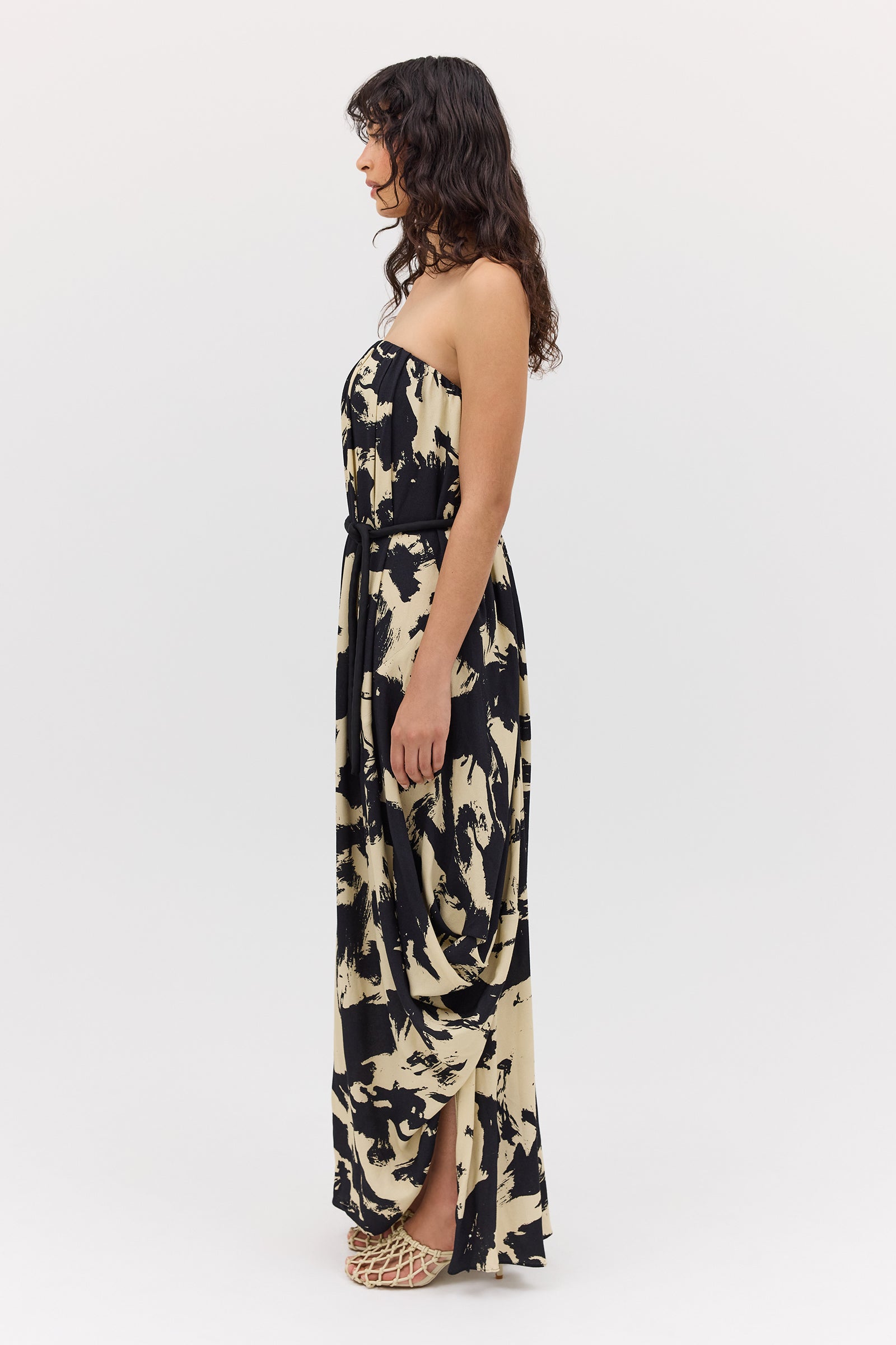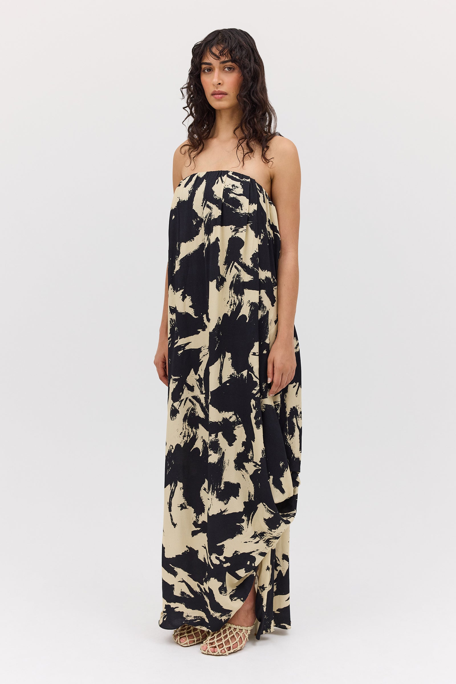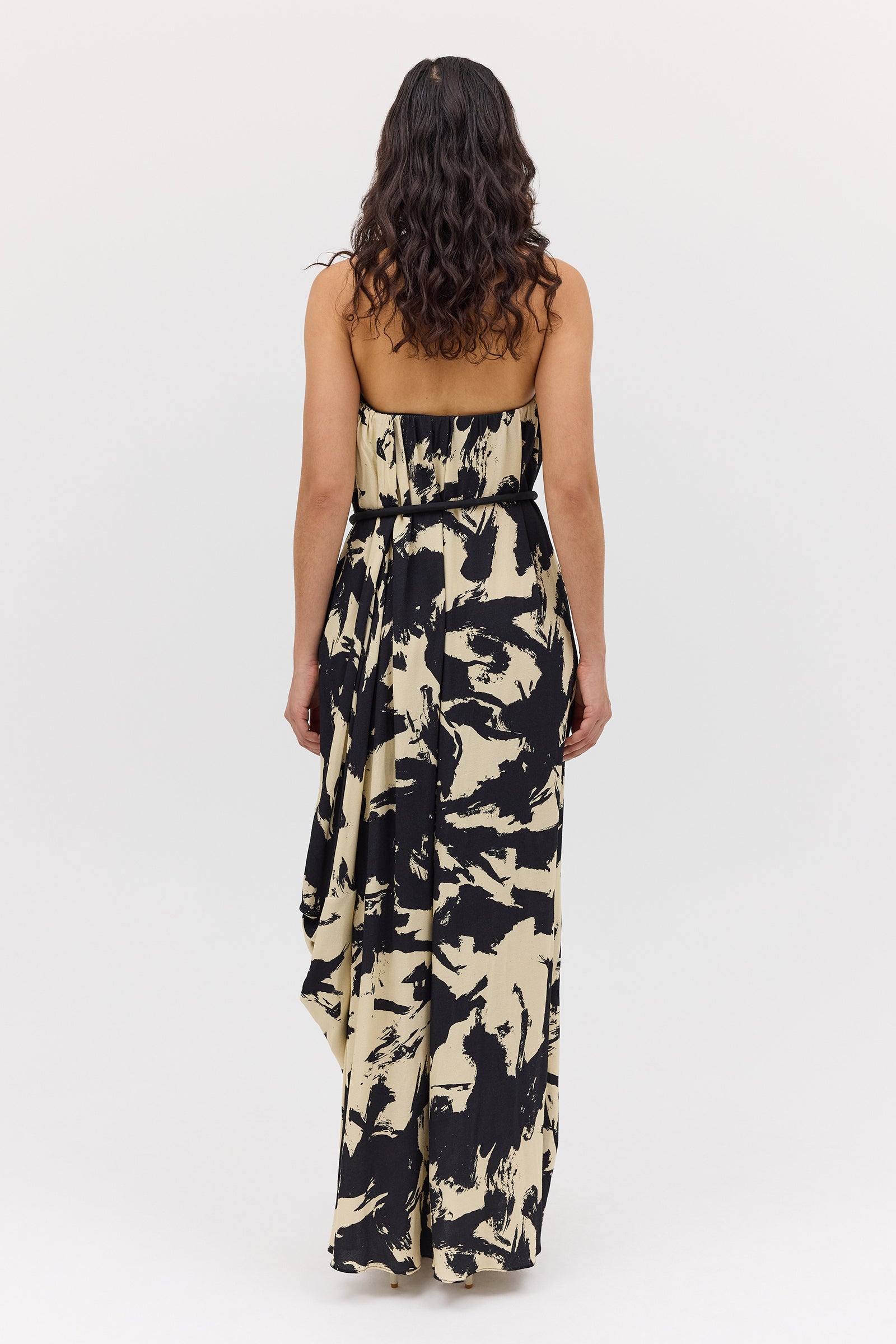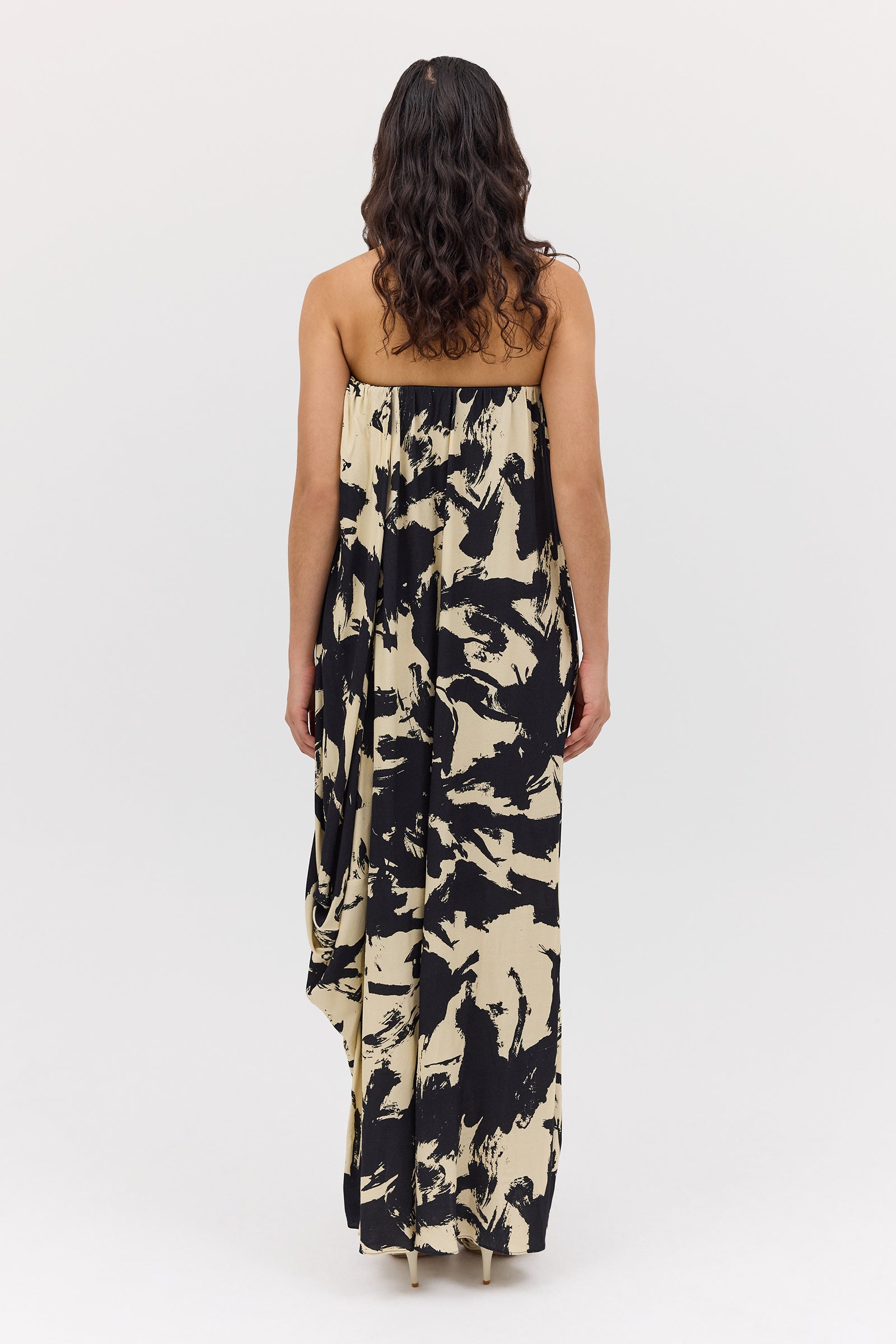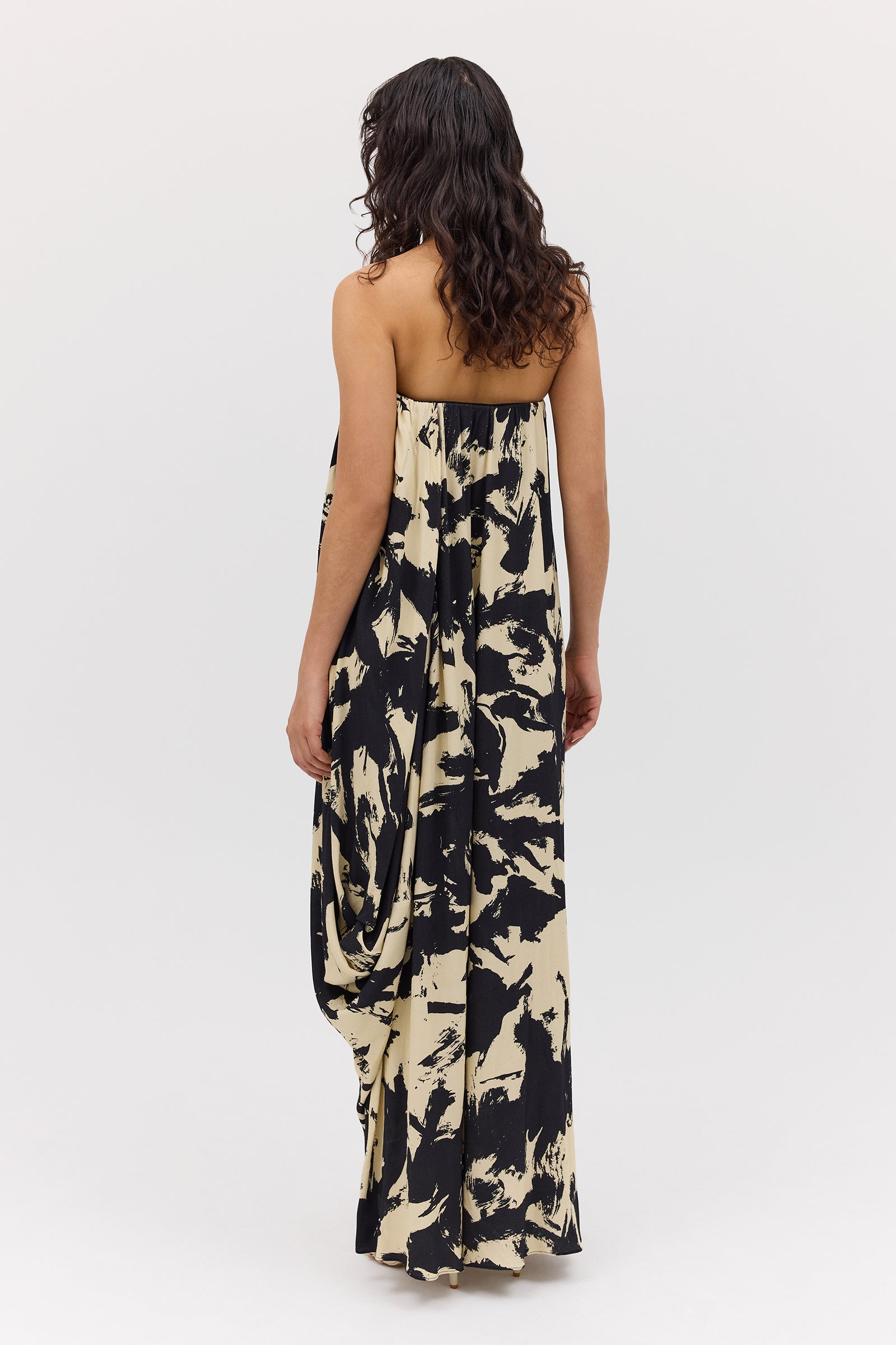 An ode to expressive volume, the Black Bloom Crepe Symphony Gown captures the essence of dramatic ease. Cut in an exclusive in-house floral print, the strapless silhouette envelopes the body with sweeping curves and architectural softness.