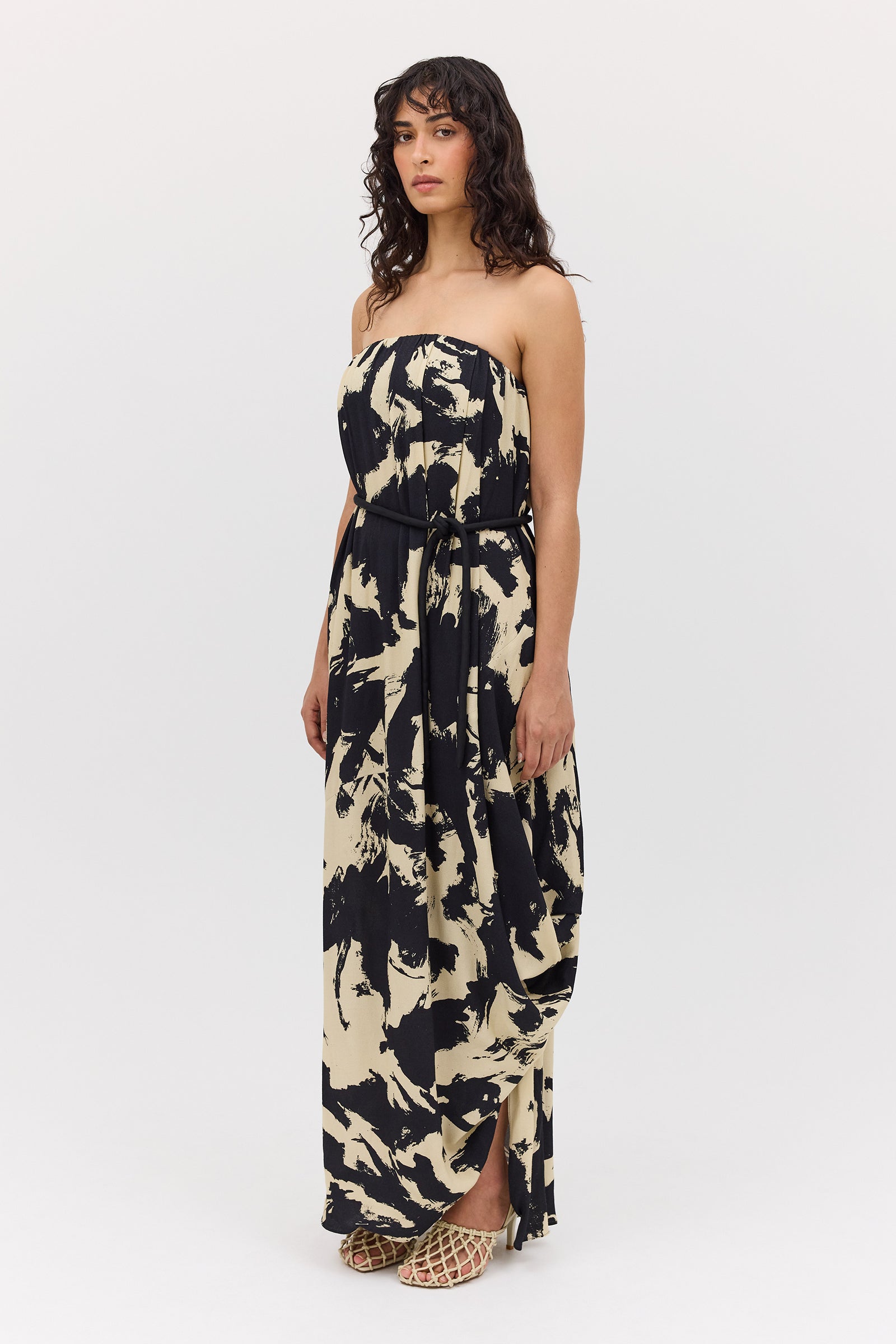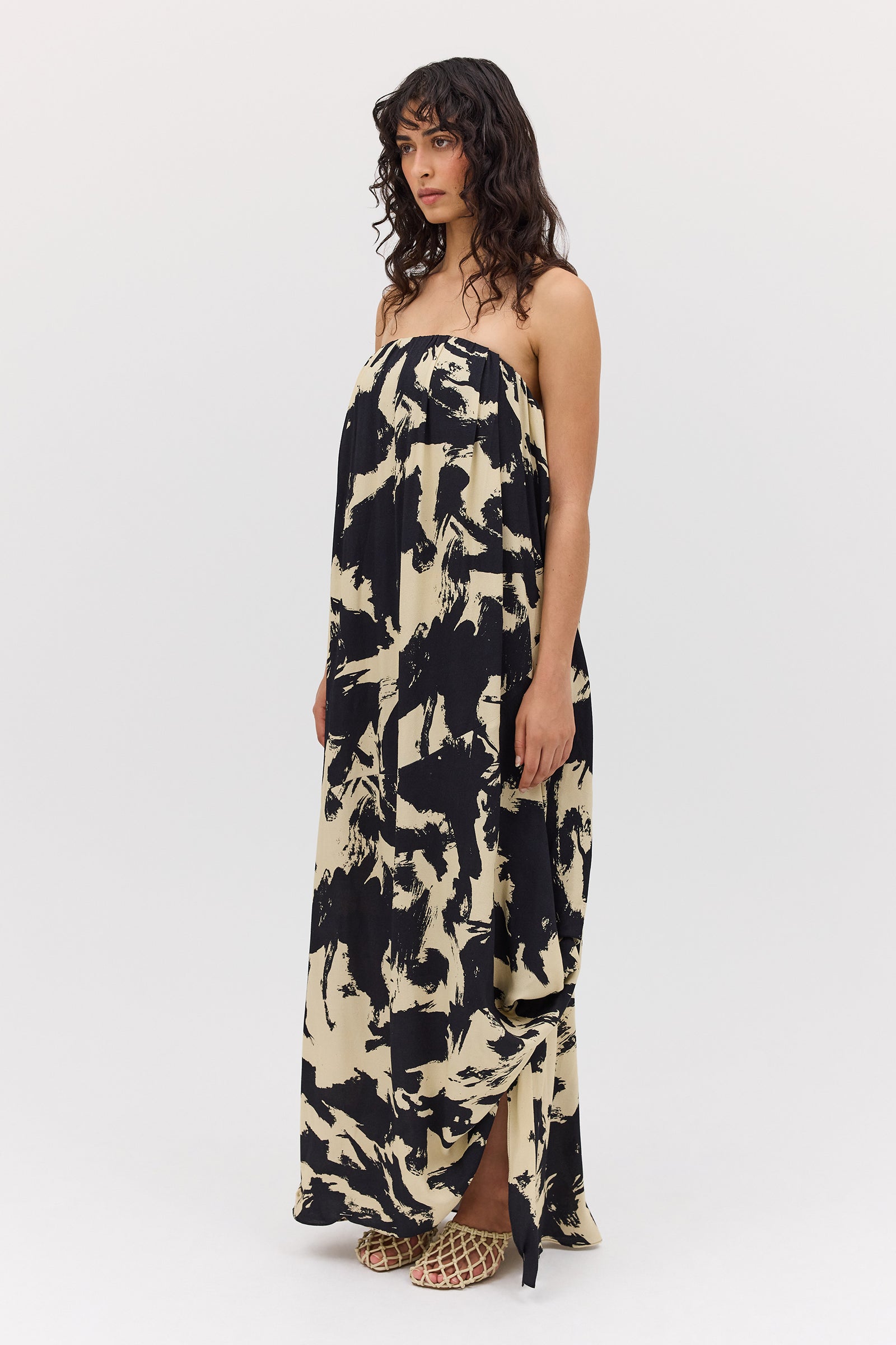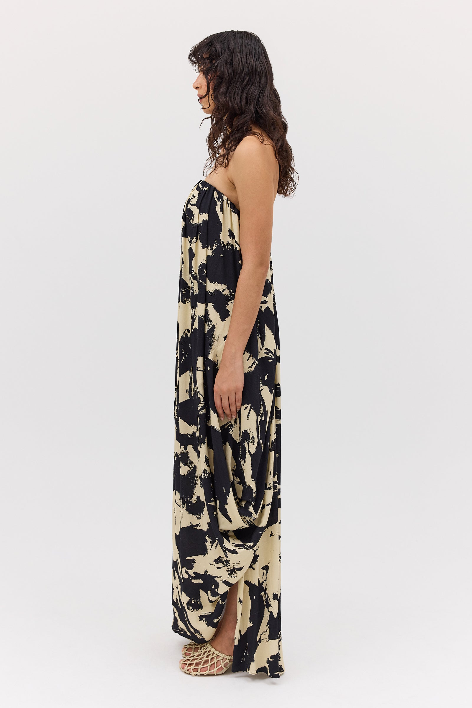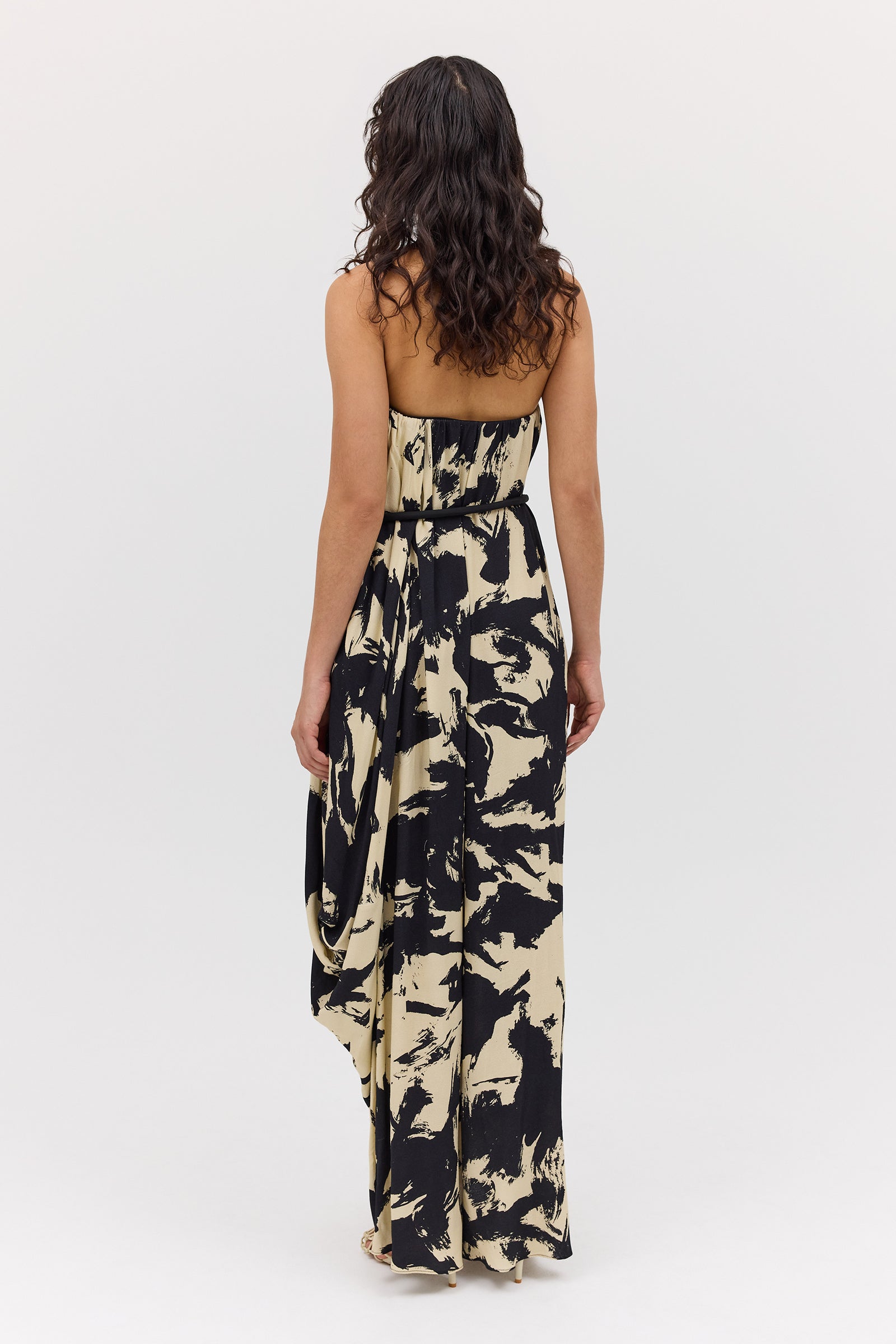 An ode to expressive volume, the Black Bloom Crepe Symphony Gown captures the essence of dramatic ease. Cut in an exclusive in-house floral print, the strapless silhouette envelopes the body with sweeping curves and architectural softness.