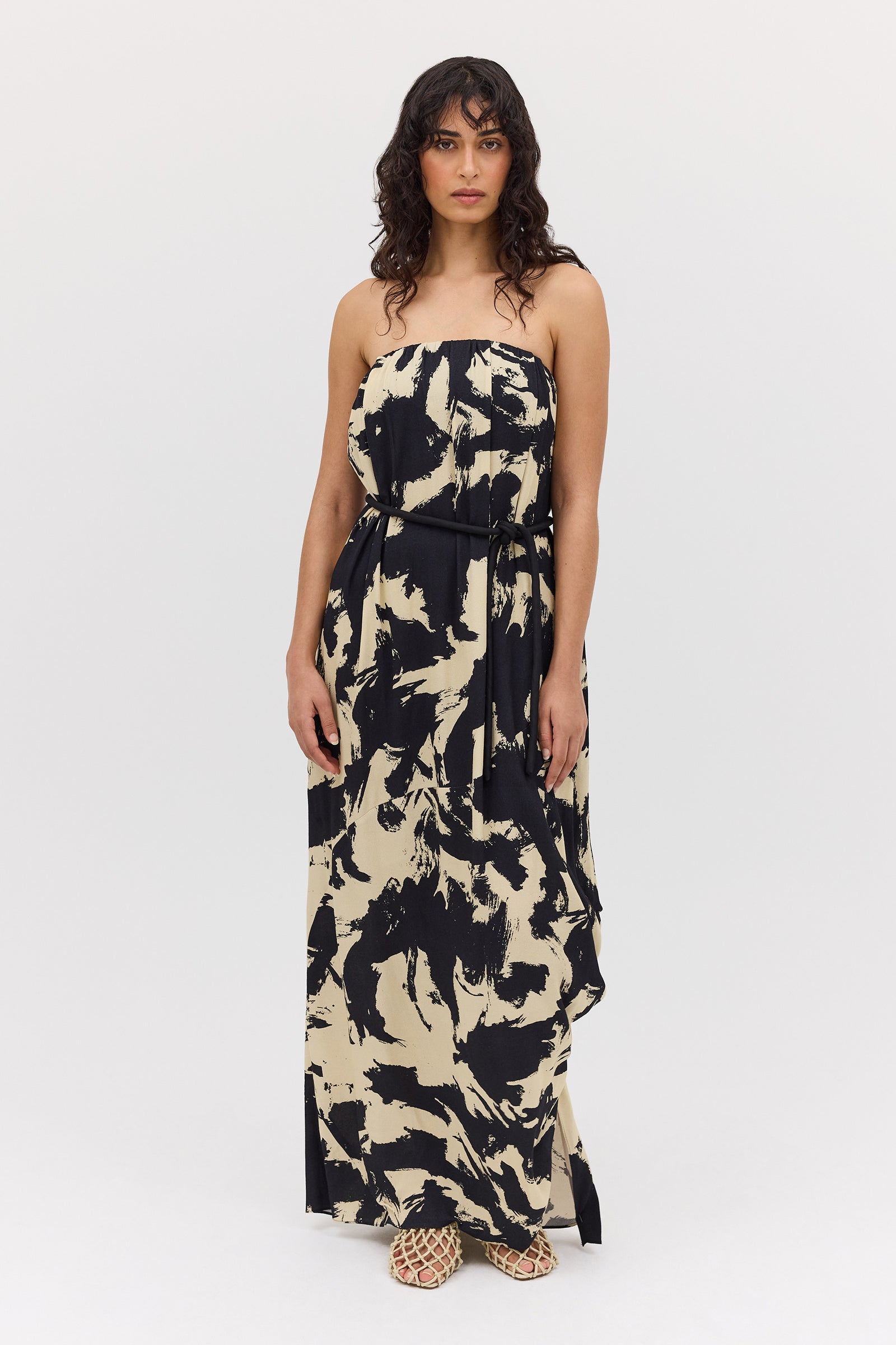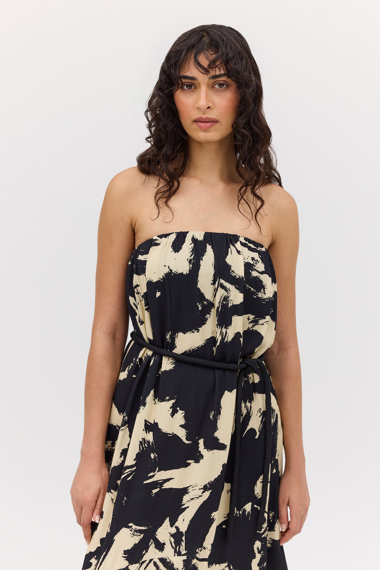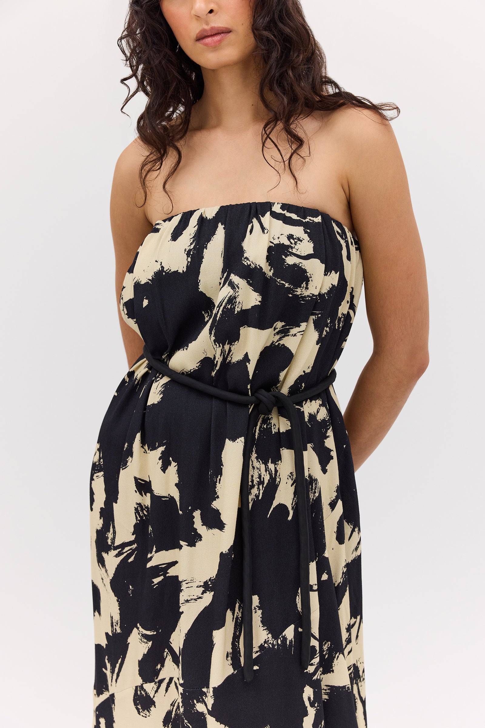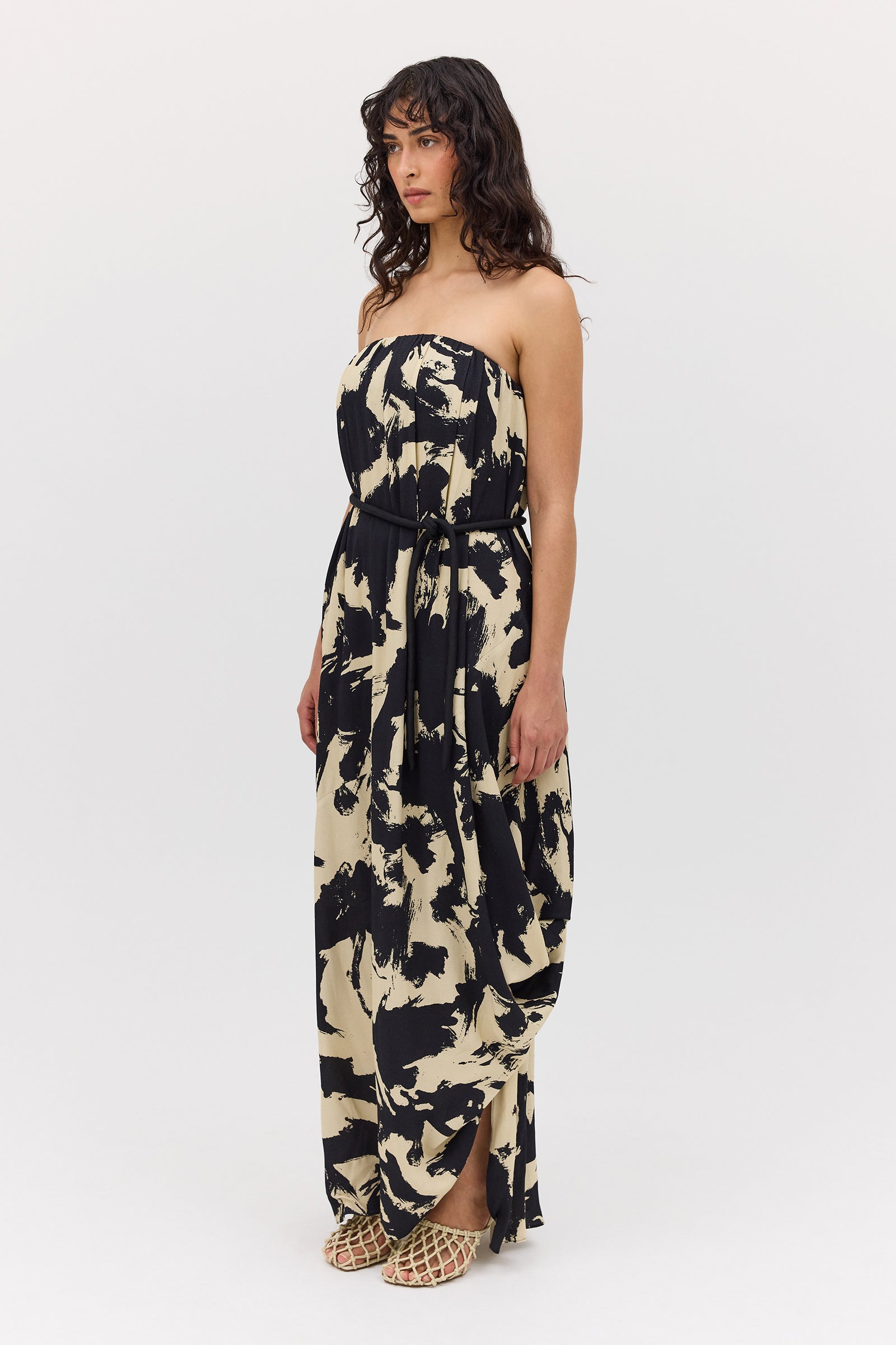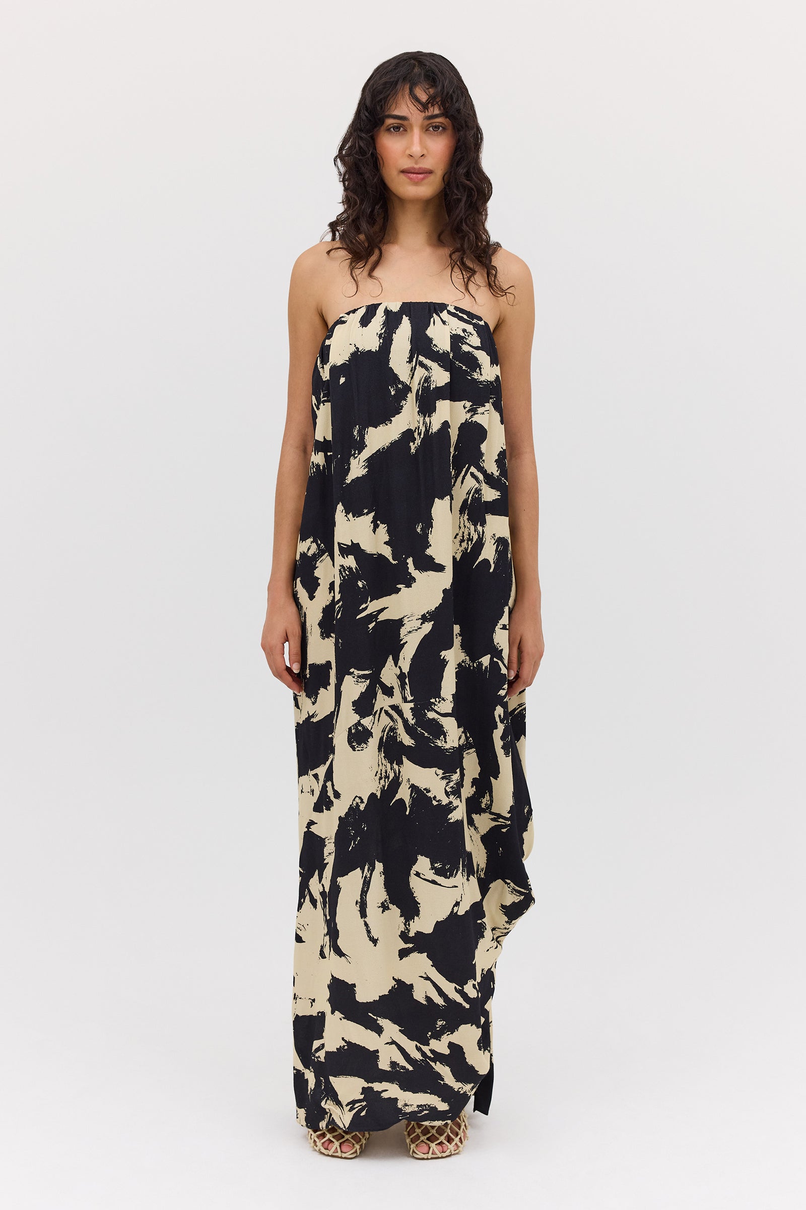 An ode to expressive volume, the Black Bloom Crepe Symphony Gown captures the essence of dramatic ease. Cut in an exclusive in-house floral print, the strapless silhouette envelopes the body with sweeping curves and architectural softness.
