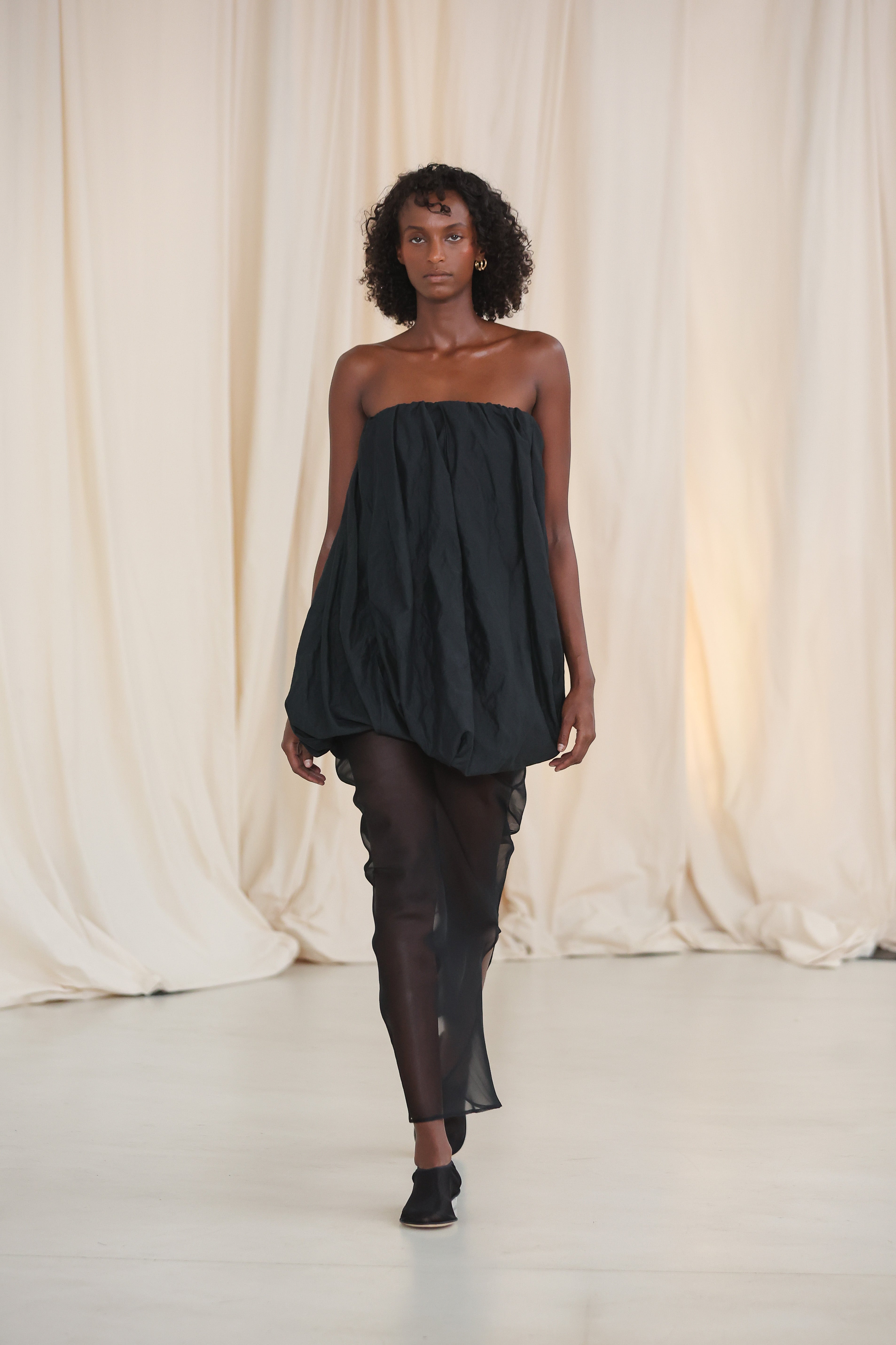 A reimagined take on the Bianca Spender Hazel silhouette, the Hazel Dress explores contrasts in texture and volume. The sculptural strapless bodice is rendered in crinkled cotton metal, gathering softly through the bust and dropping into a voluminous, organic bubble hem. A sheer silk organza skirt falls beneath the draped silhouette, adding ethereal lightness and a sense of movement.