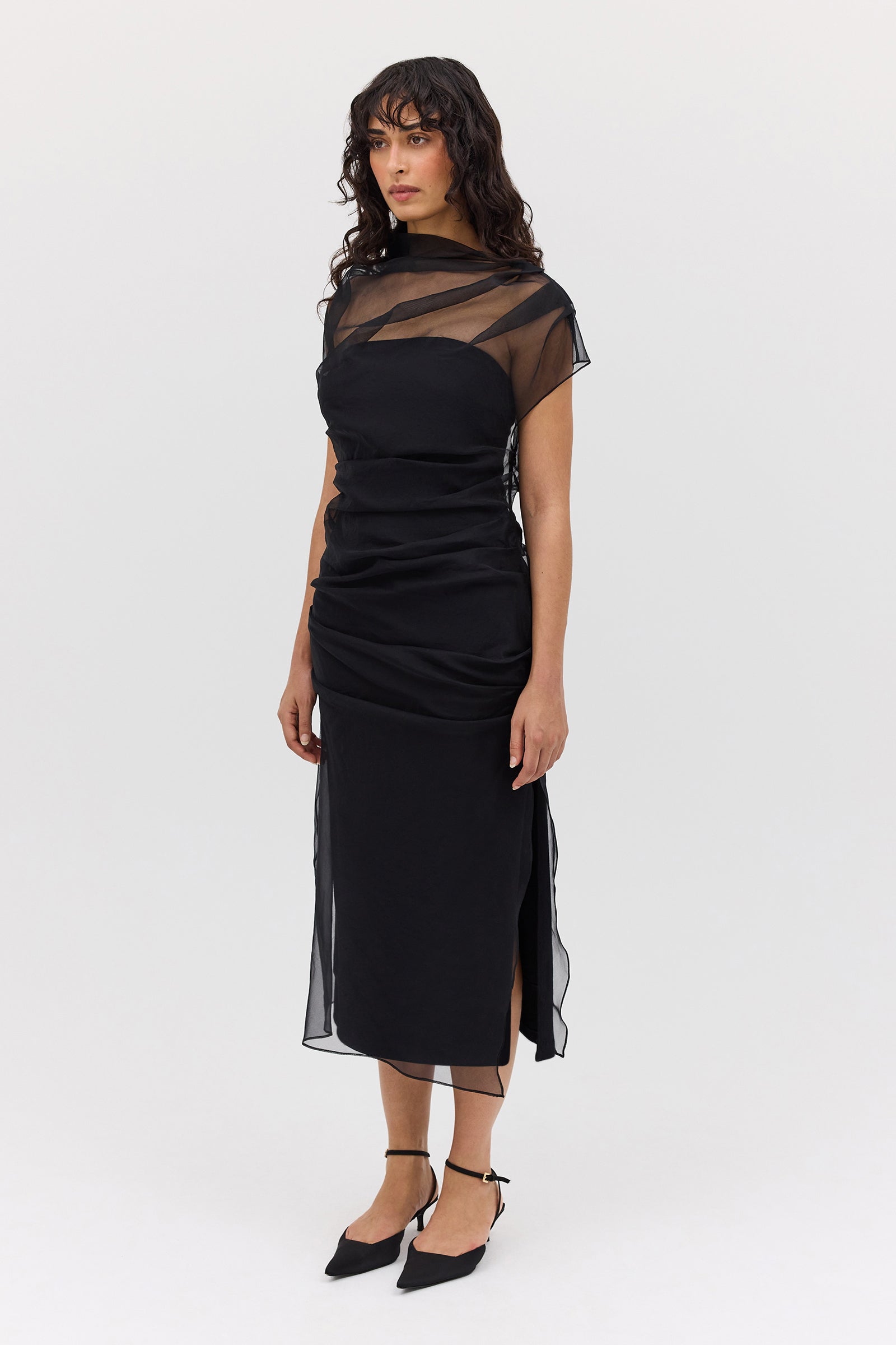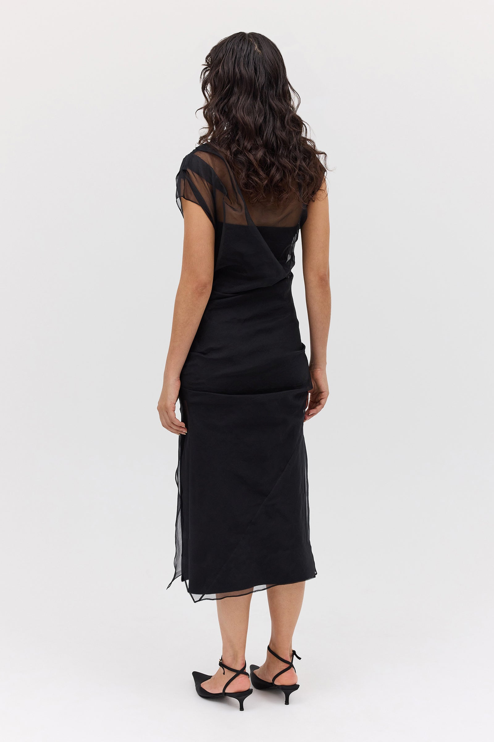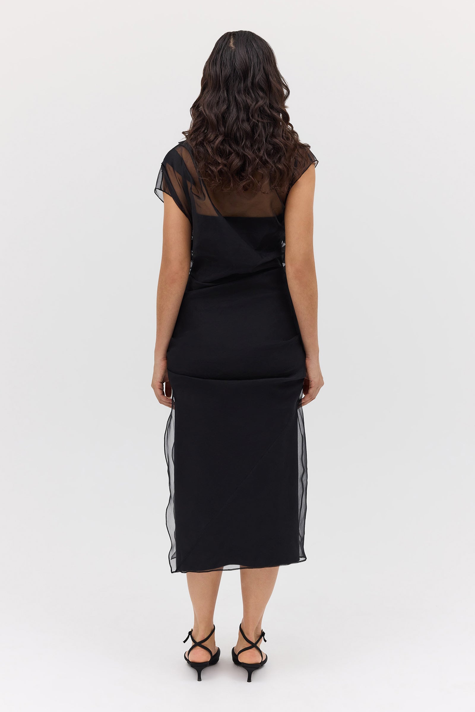 You asked and we've listened. Introducing the Black Organza Emulate Dress, based on the best-selling Emulate Bustier. The Emulate Dress plays on the idea of transparency, intimacy and femininity, wrapping you in folds and layers of delicate, sheer silk. The soft silhouette is offset with a satin viscose lining in the underlayer, allowing the dress to fluidly drape over the form.