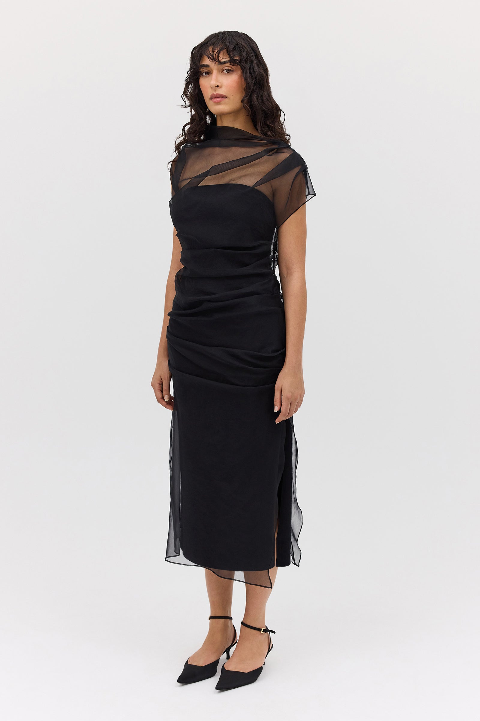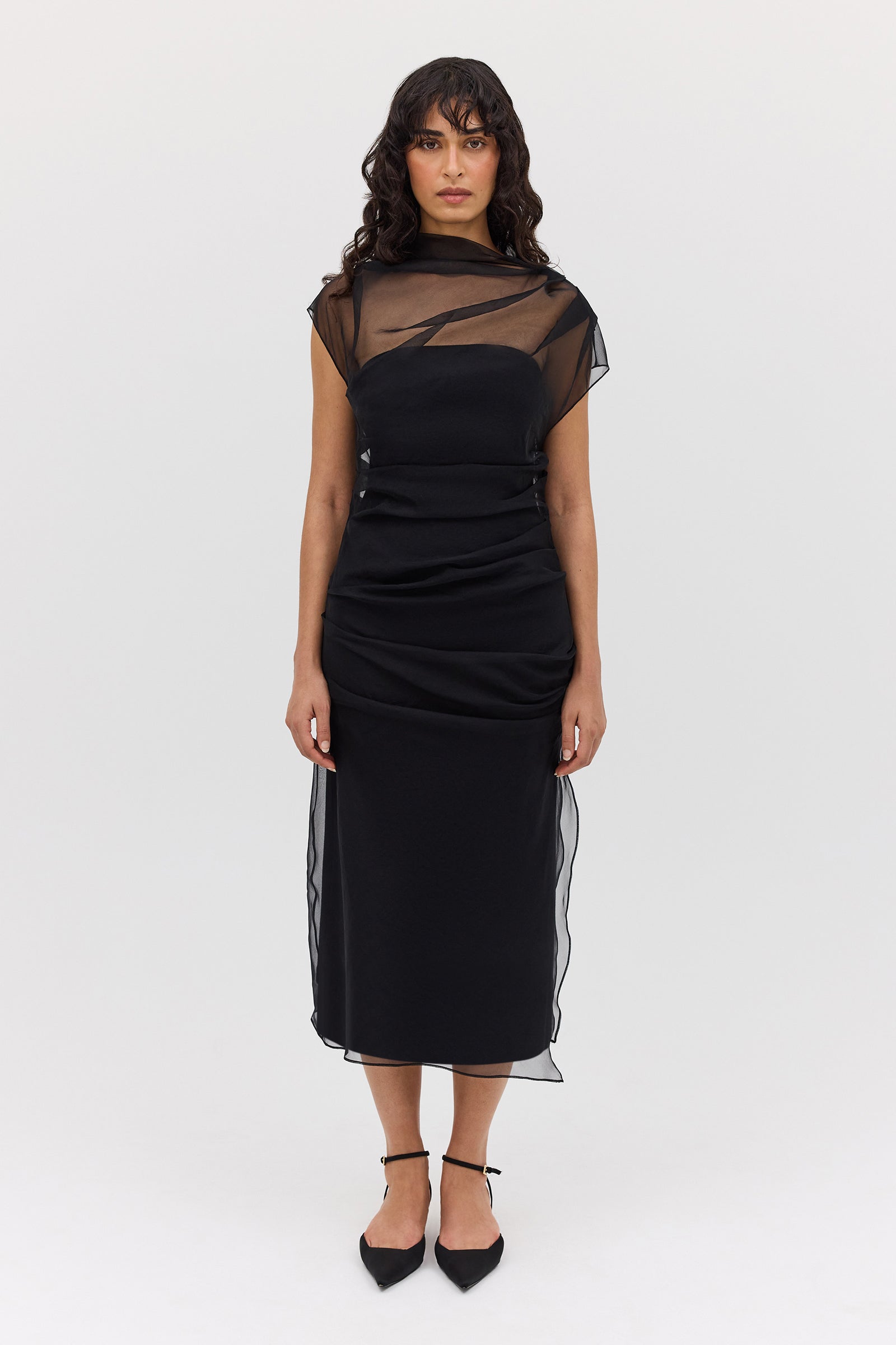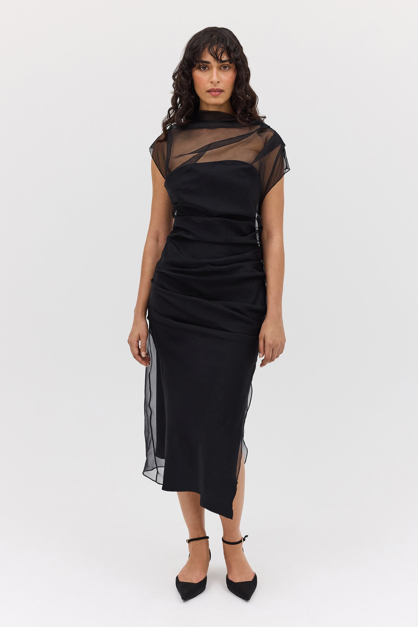 You asked and we've listened. Introducing the Black Organza Emulate Dress, based on the best-selling Emulate Bustier. The Emulate Dress plays on the idea of transparency, intimacy and femininity, wrapping you in folds and layers of delicate, sheer silk. The soft silhouette is offset with a satin viscose lining in the underlayer, allowing the dress to fluidly drape over the form.
