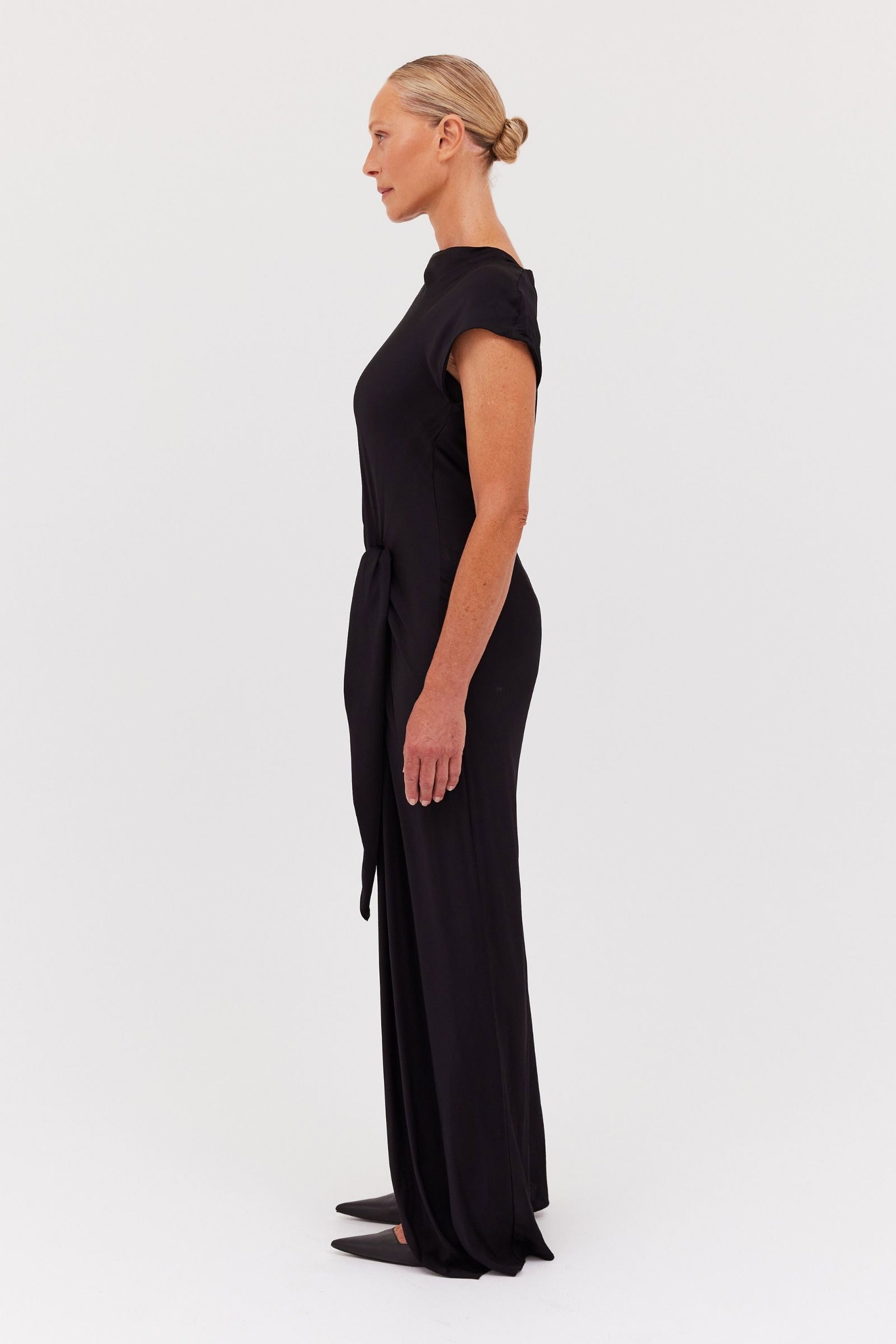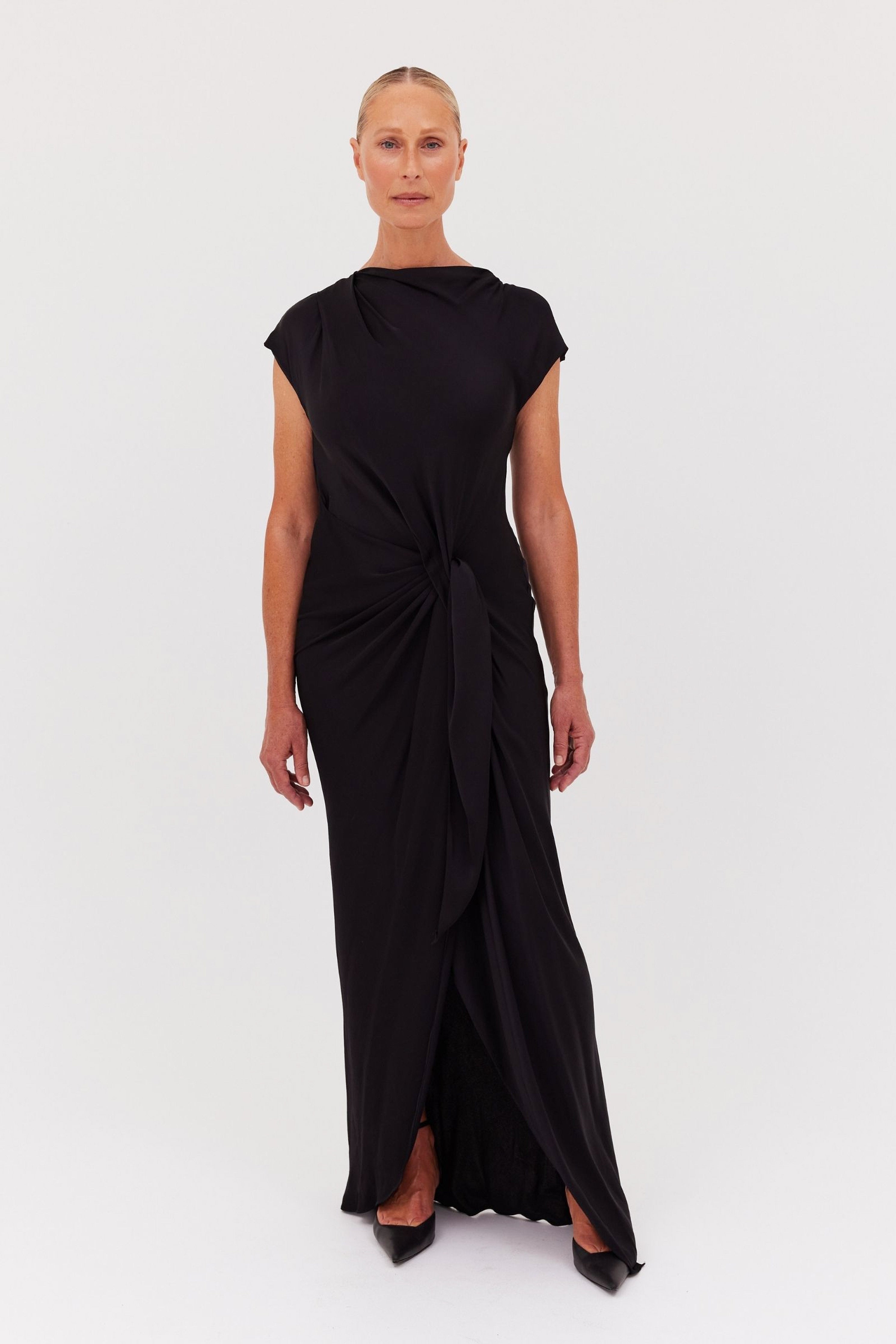 A striking column of draped Satin, the Eva dress is equal parts silver screen glamour and modern relaxed sophistication. A boat neck, capped sleeve and signature wrap waist drapery add drama. Semi-Fitted, and falling to just above the ankle, it can be worn with flat sandals or an elegant heel.