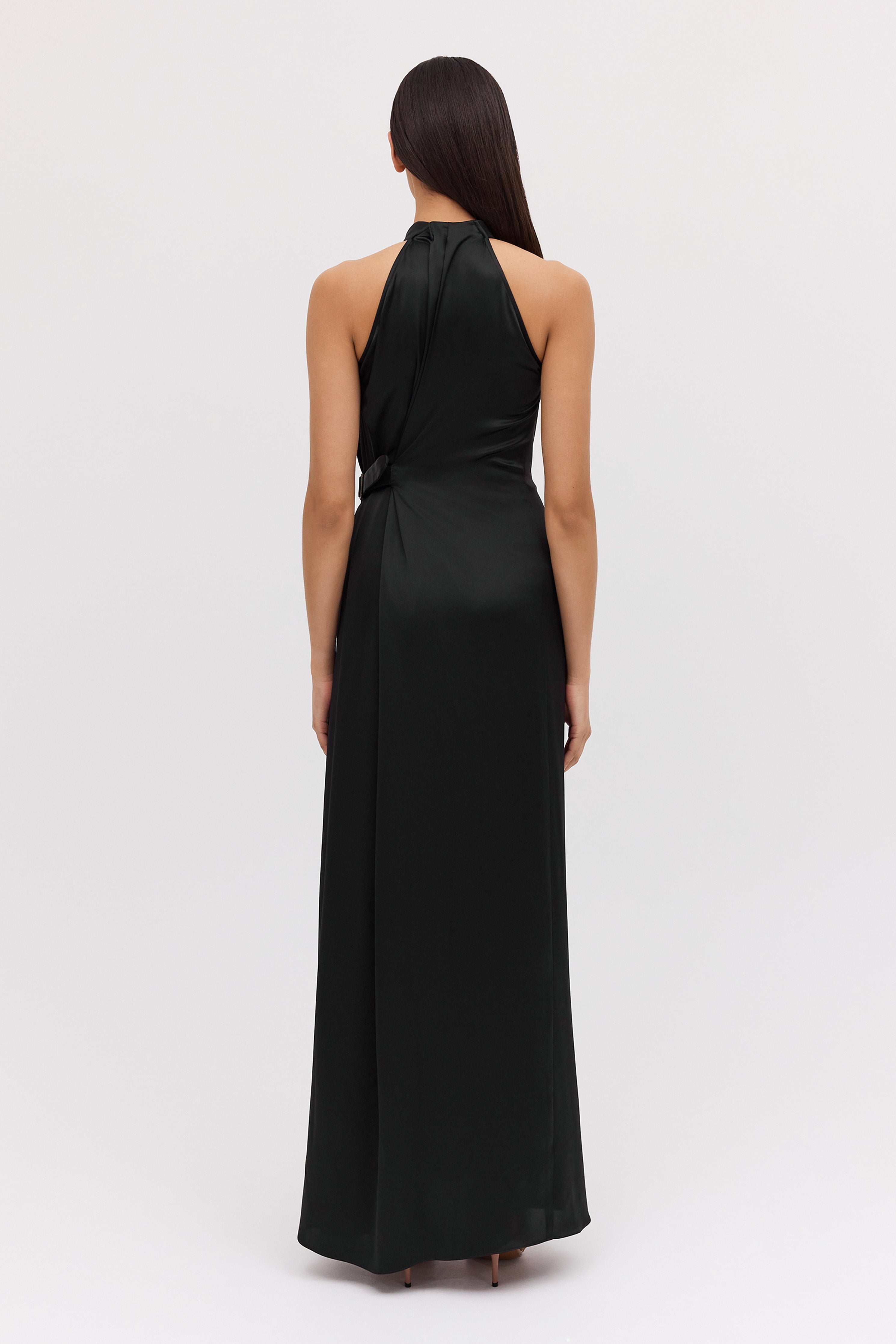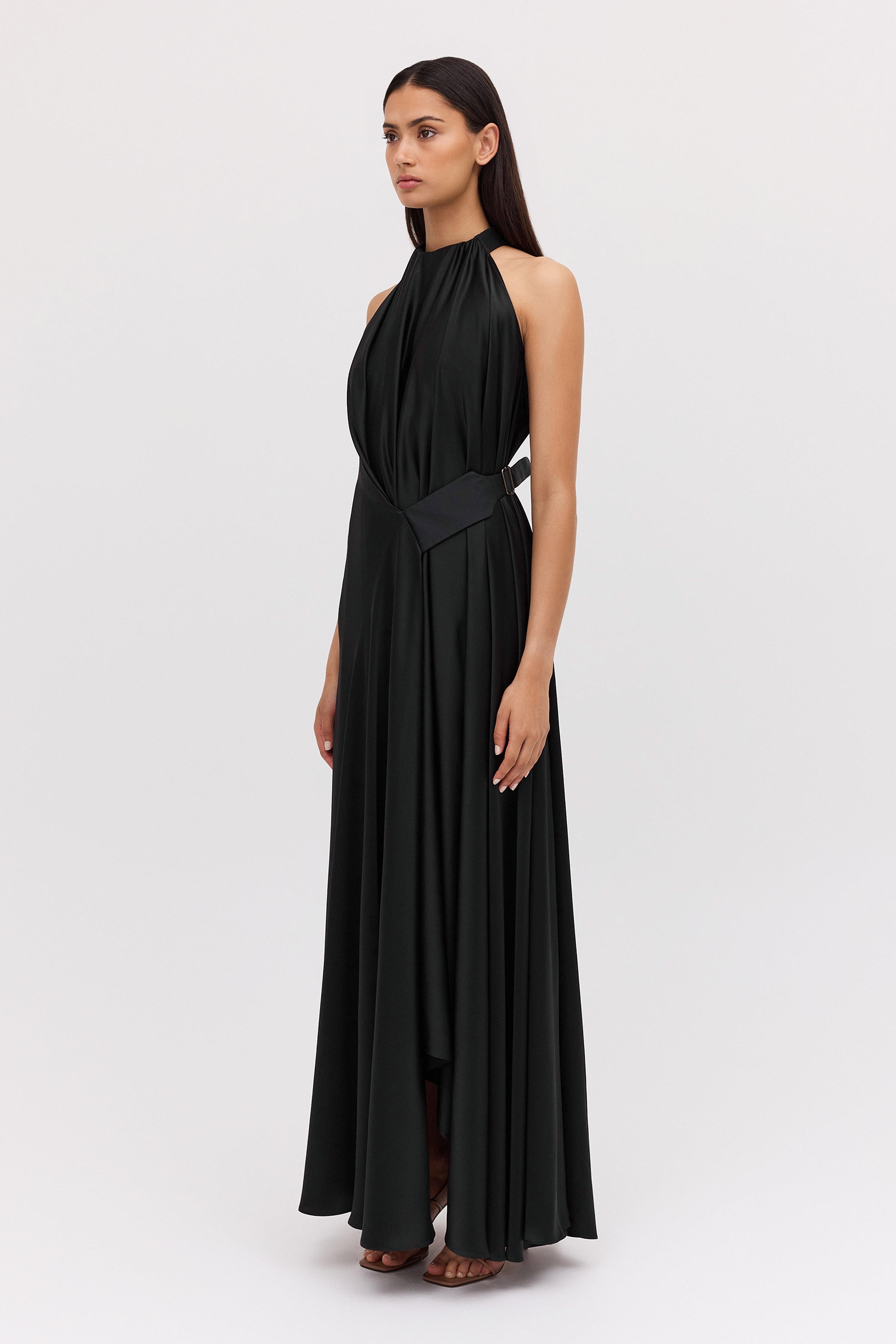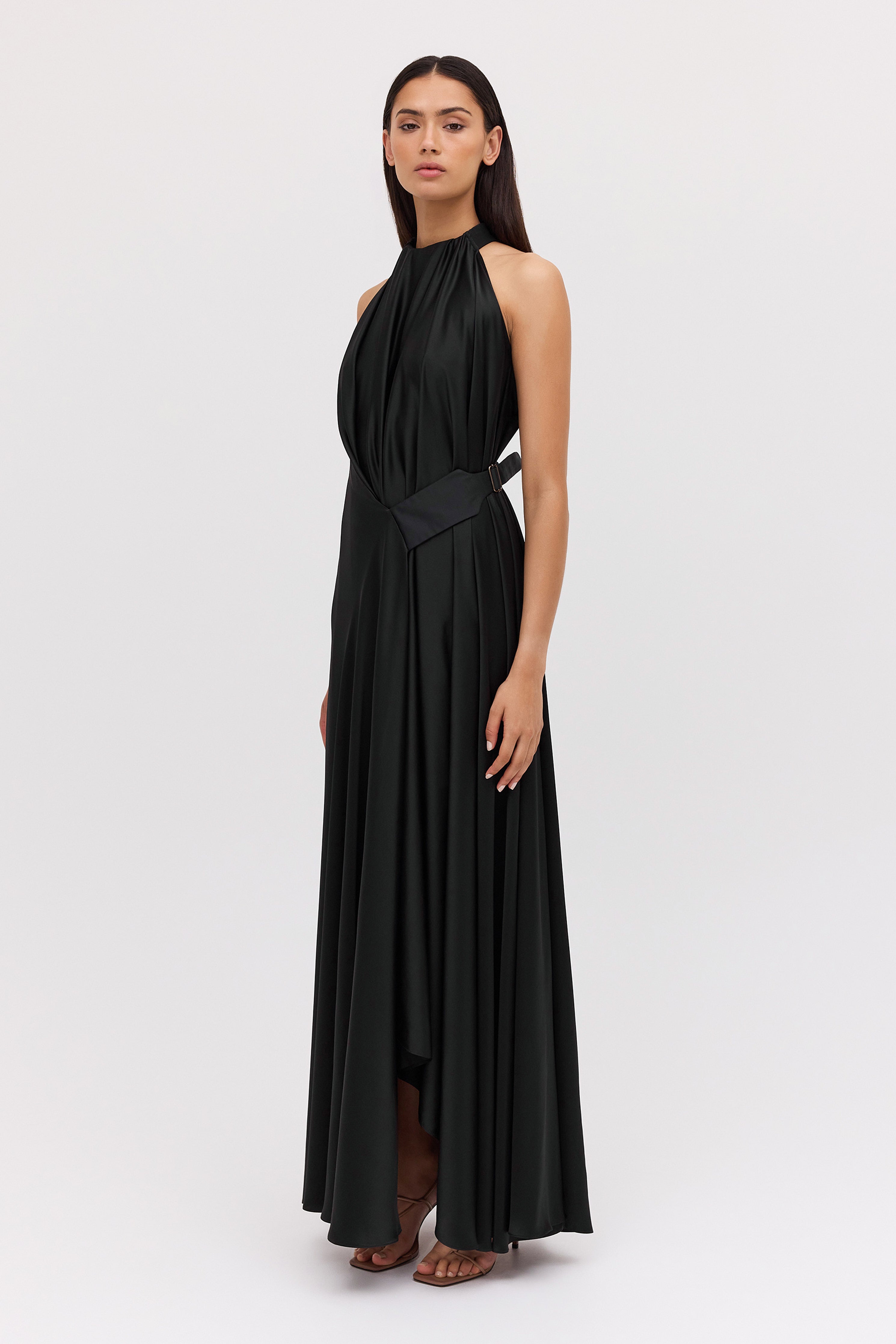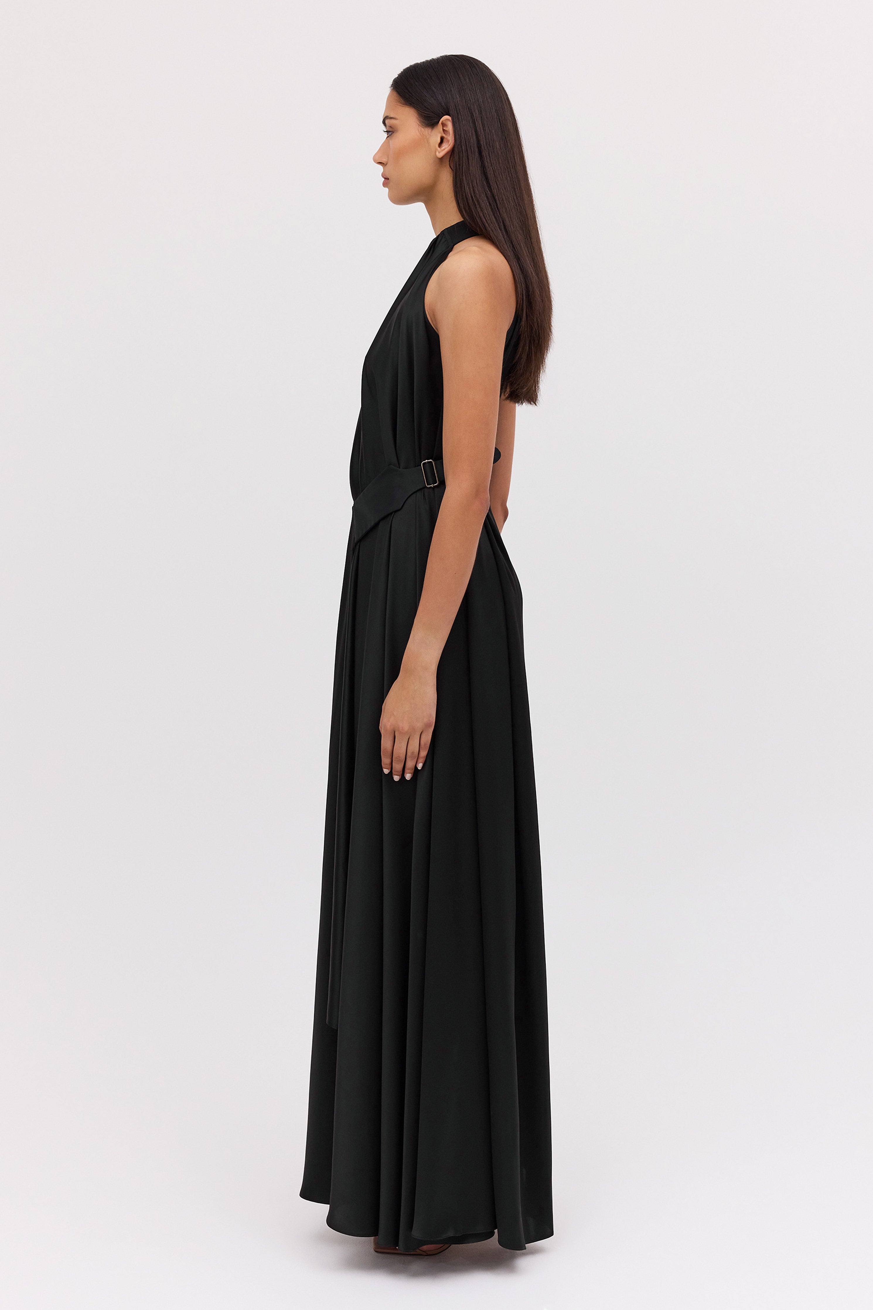 The Isabella Gown exudes glamour and sophistication. The gown is cut from lustrous silk satin and gracefully falls to the ground, skimming the body. It features a high neckline and a delicate side adjustable belt that cinches in at the waist, creating a stunning, feminine silhouette.