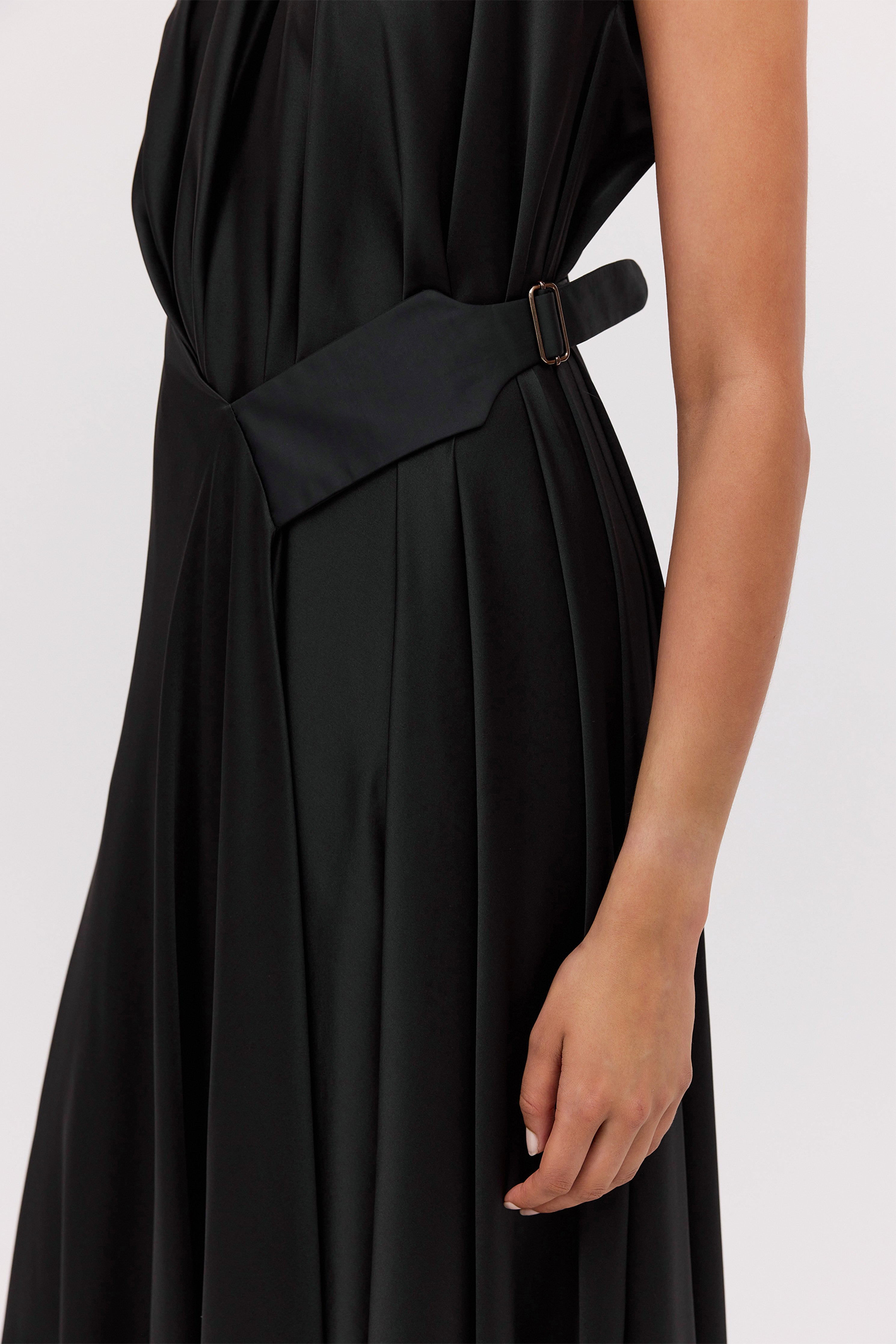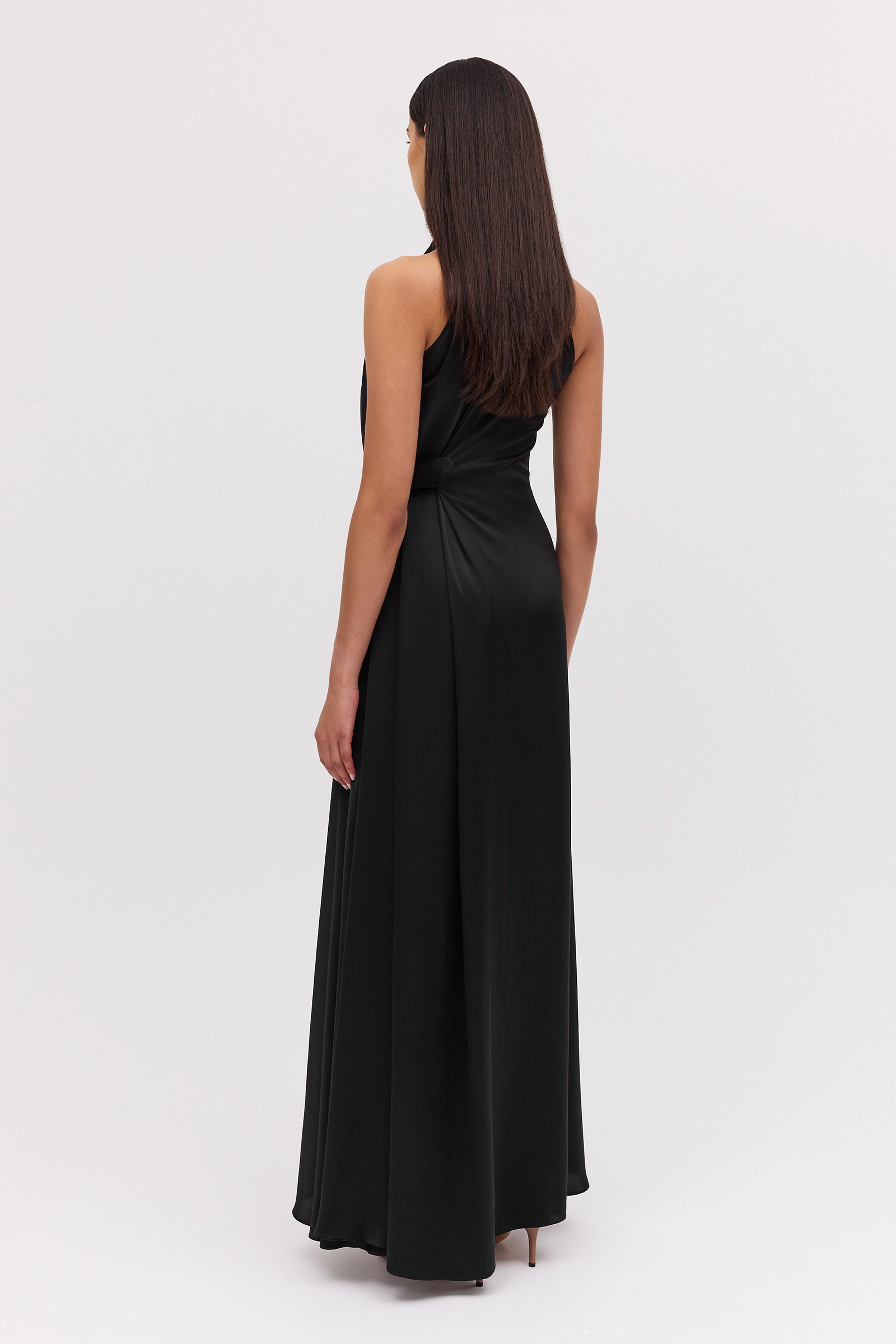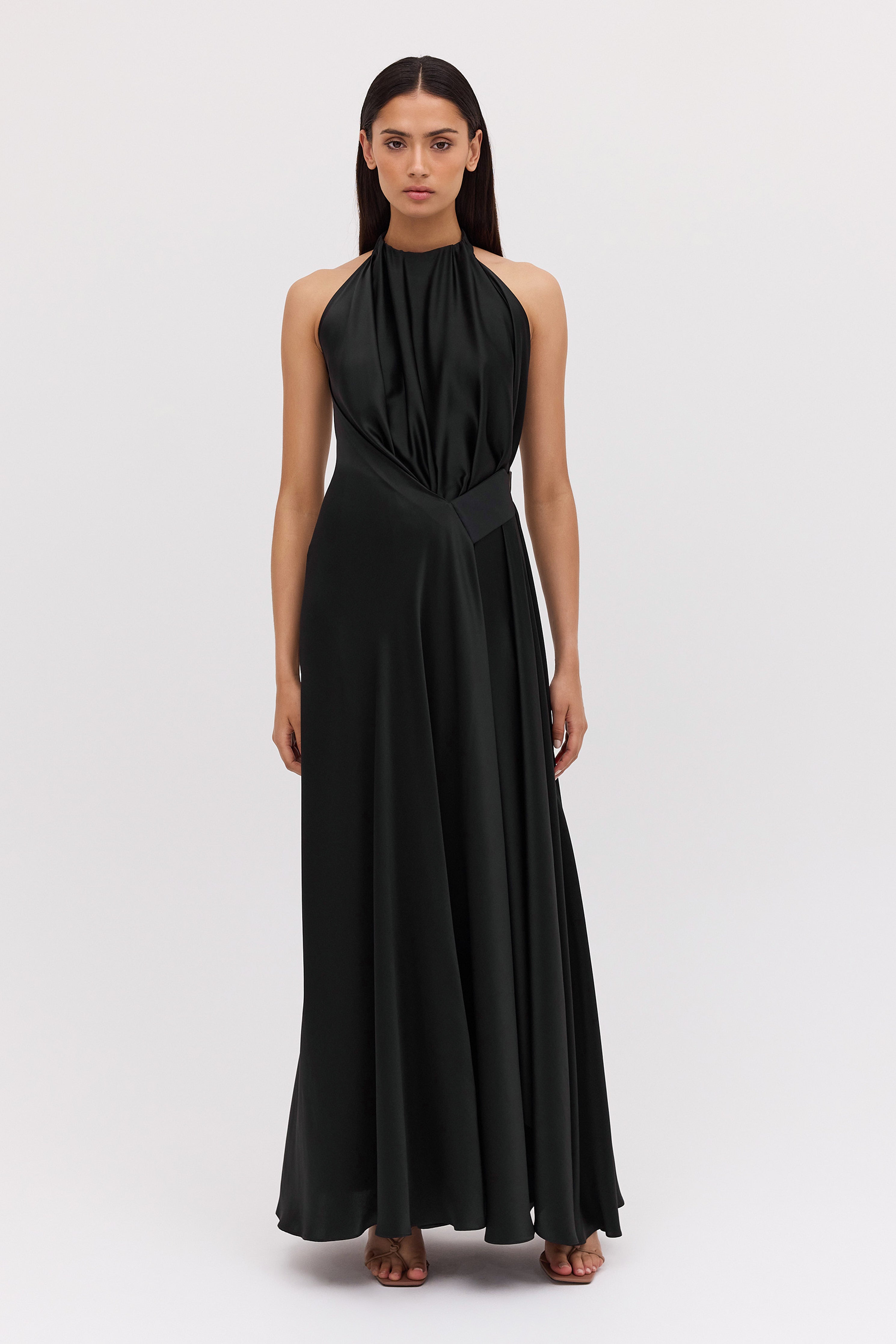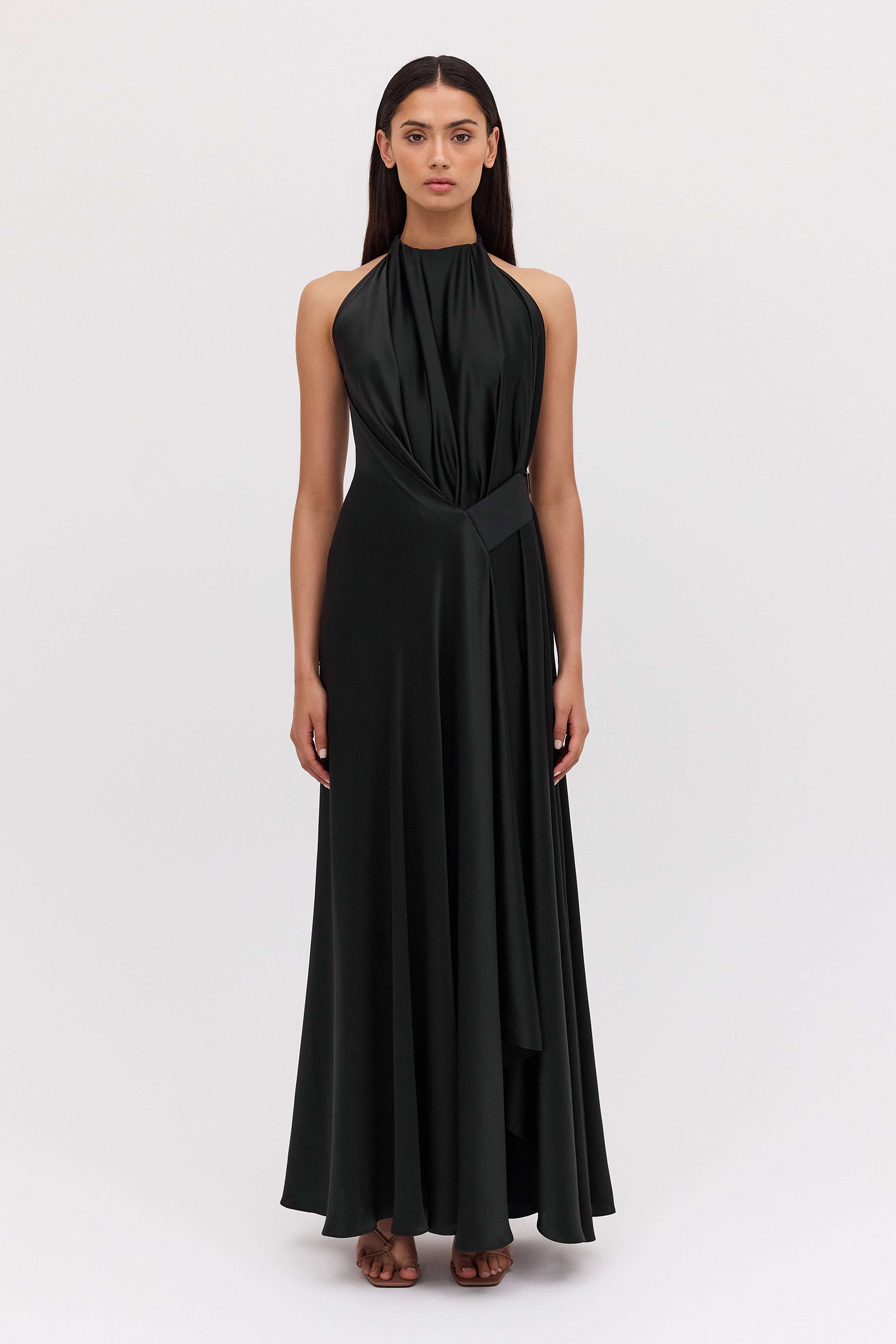The Isabella Gown exudes glamour and sophistication. The gown is cut from lustrous silk satin and gracefully falls to the ground, skimming the body. It features a high neckline and a delicate side adjustable belt that cinches in at the waist, creating a stunning, feminine silhouette.