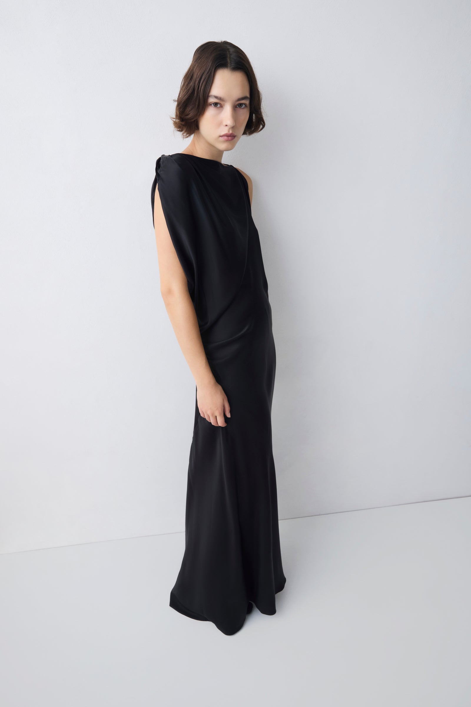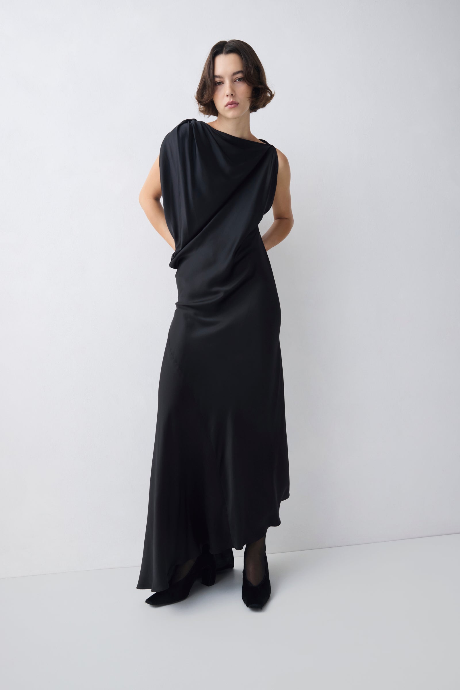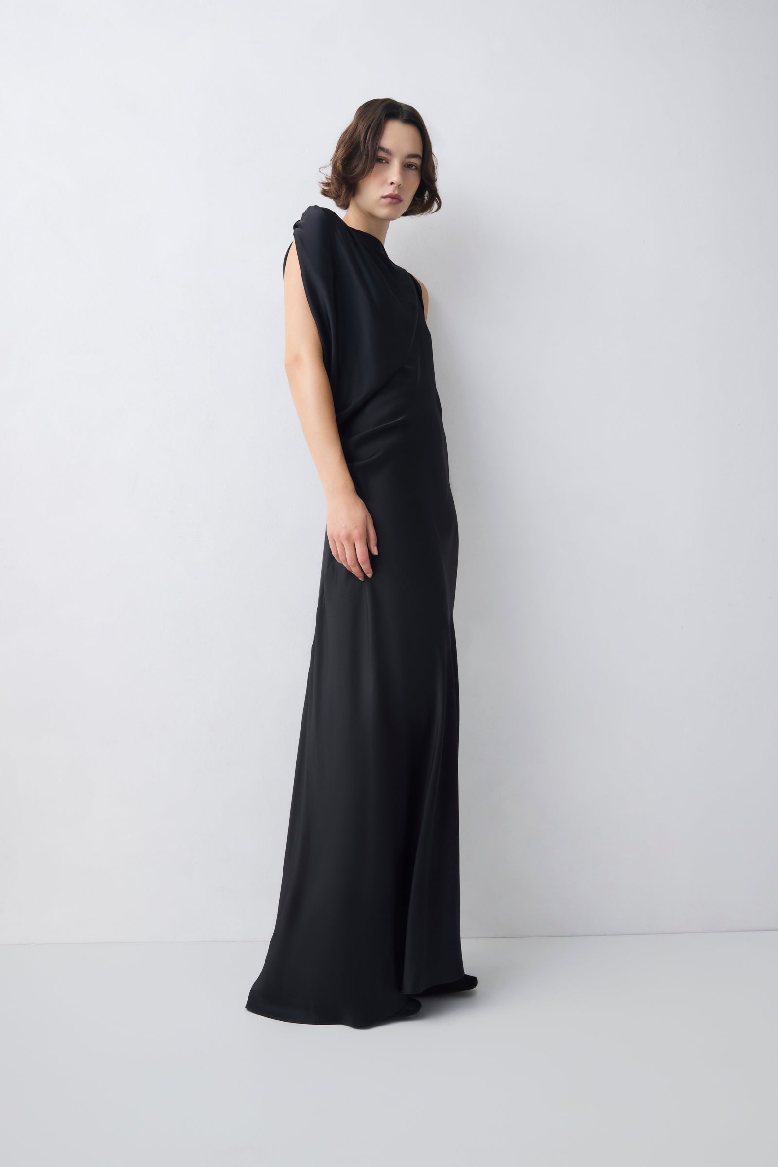 The Roma Gown is draped from a single length of cloth. Twisted and folded to accentuate and elongate the body, this stunning style is cut in our seasonless Black silk. With its draped bodice and contouring stitching across the skirt, the Roma Gown is an unforgettable piece. It is a reversible style that can be worn either way.
