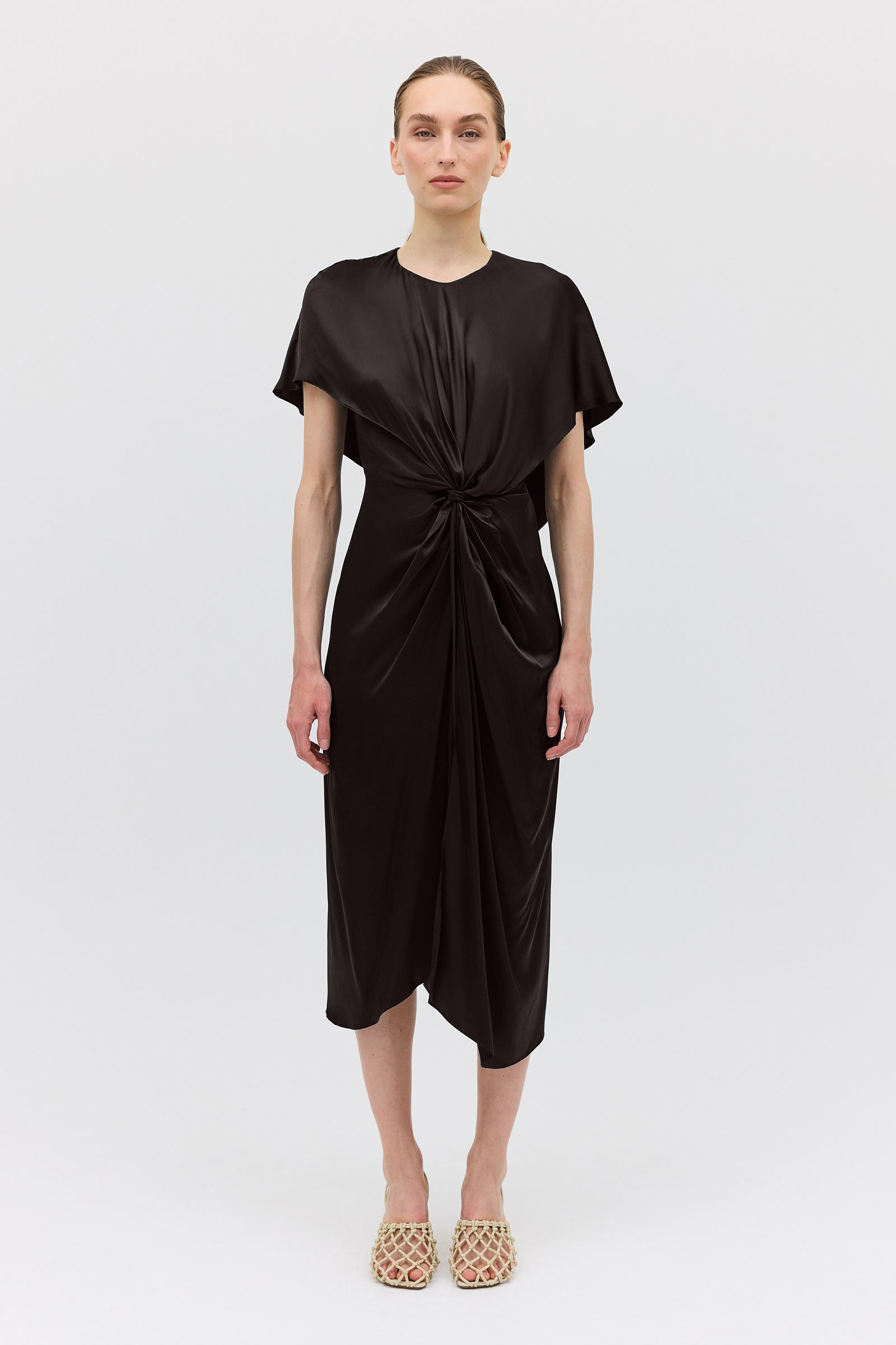 A best-selling silhouette, reimagined in decadent chocolate silk satin. The Illusionist Dress is a masterclass in draping, with a sculptural knot detail at the waist that shapes and flatters the body. Cape-like sleeves offer soft arm coverage, while the back falls into a gentle drape for added elegance and movement.