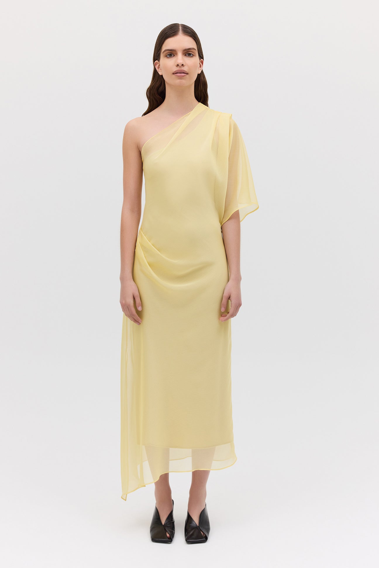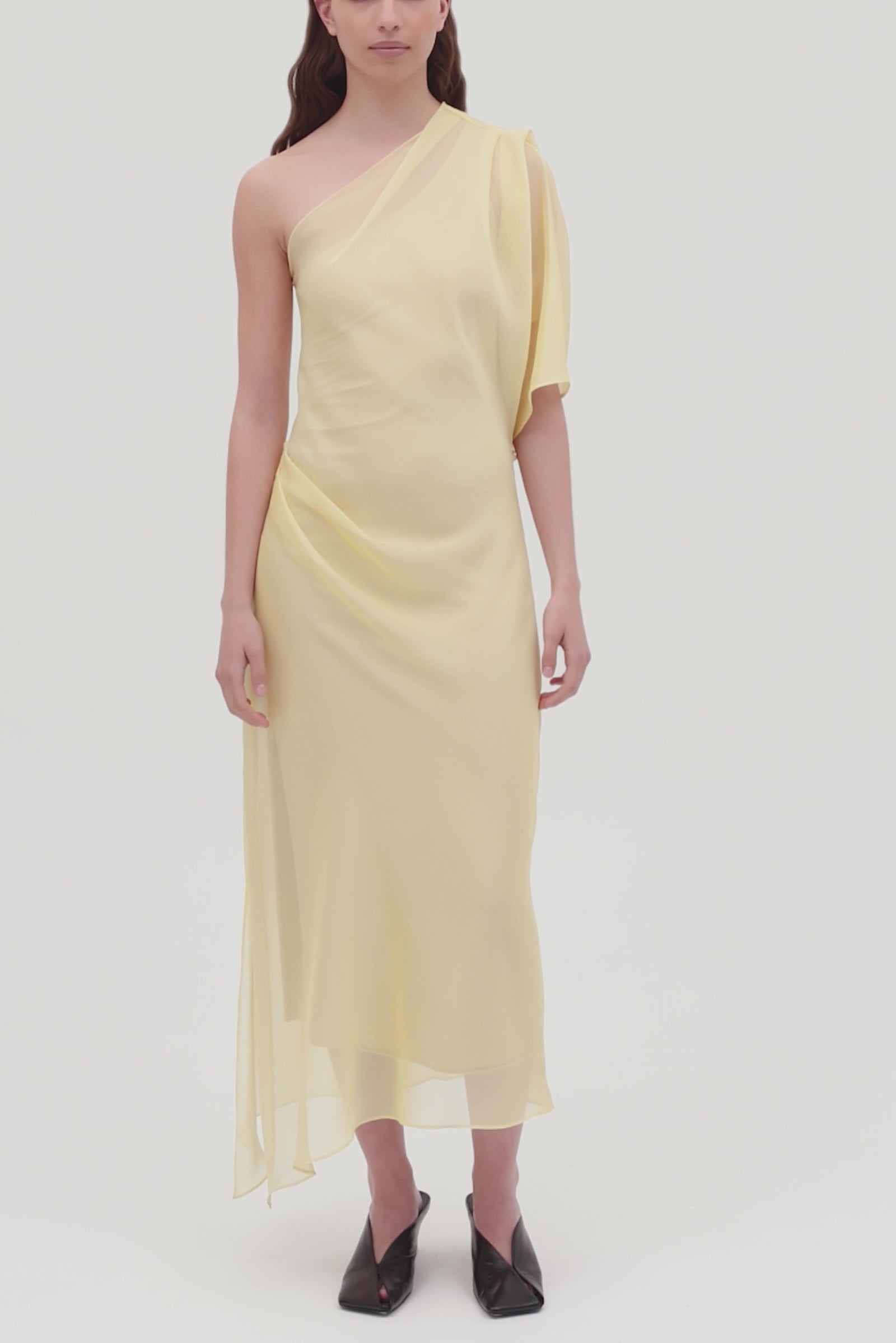 A best-selling silhouette returns in a new sunlit hue. The Valencia Dress is cut from luminous lemon chiffon, its surface gently catching the light to reveal the movement of each draped fold. Designed with an asymmetrical neckline and softly gathered side seam, it balances structure and softness with effortless grace.
