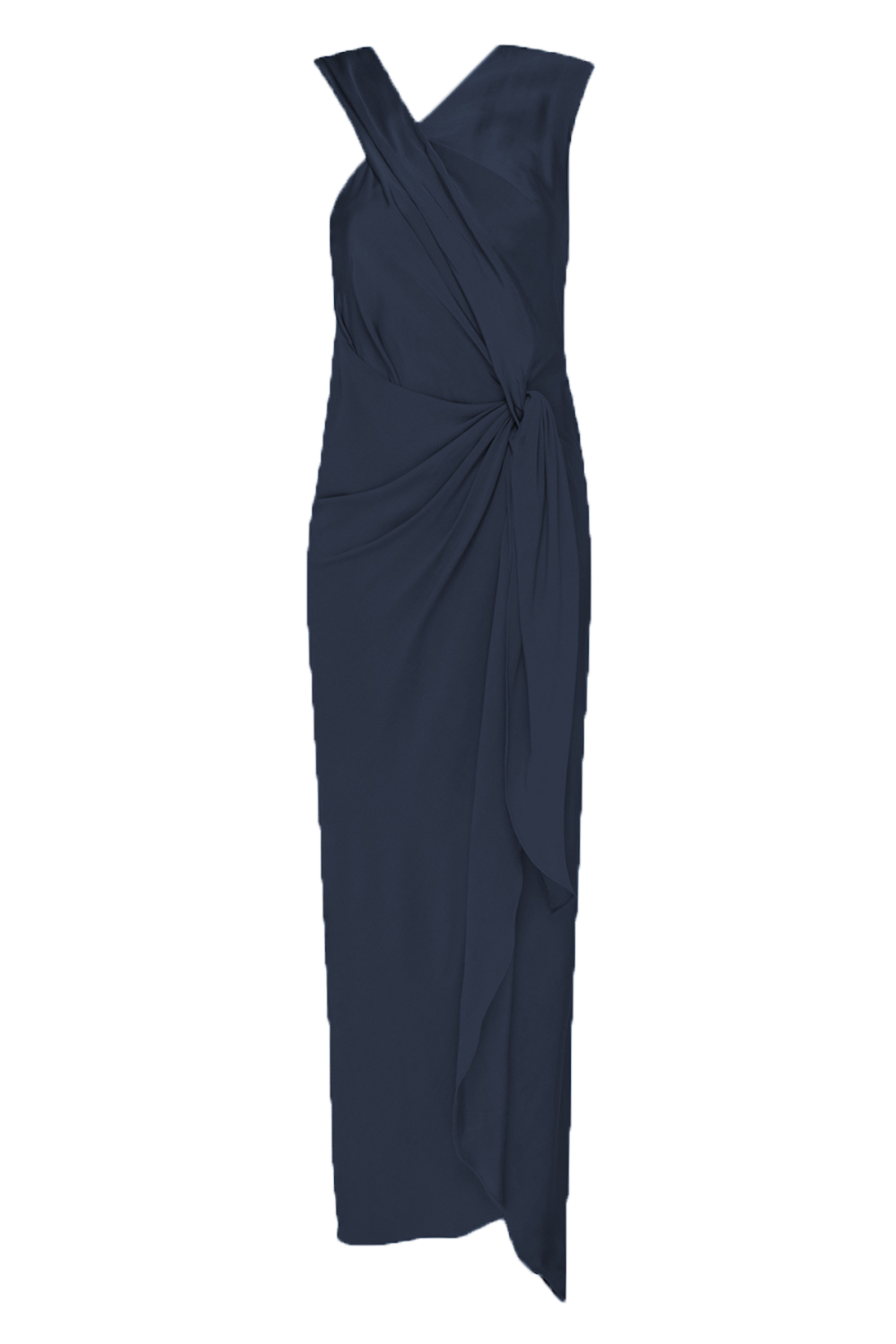 Living in a dream. The Deviation Gown dress radiates in Navy Satin crepe. With its gathered detail, asymmetric panels, and flowing ribbons, this style will take your breath away.