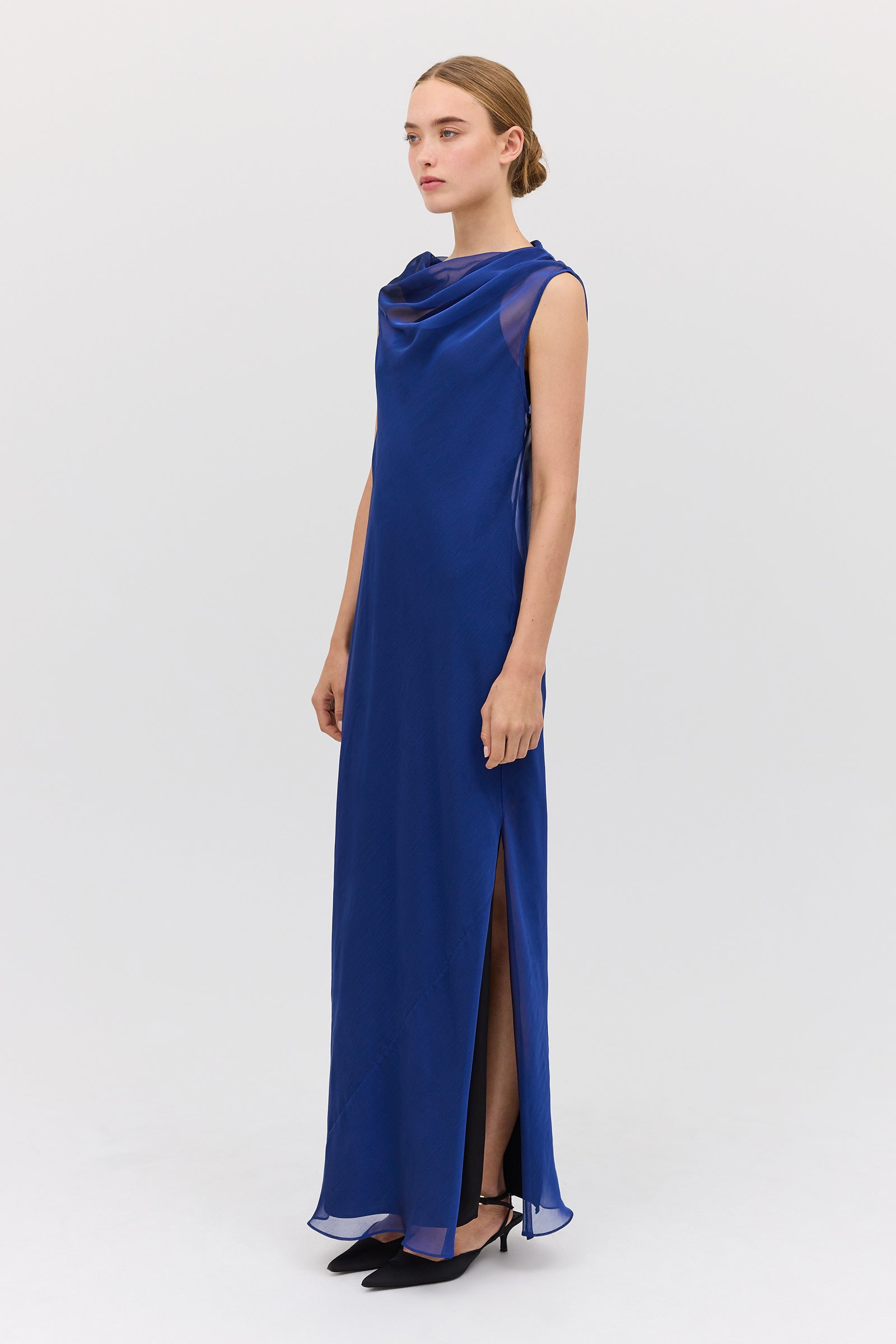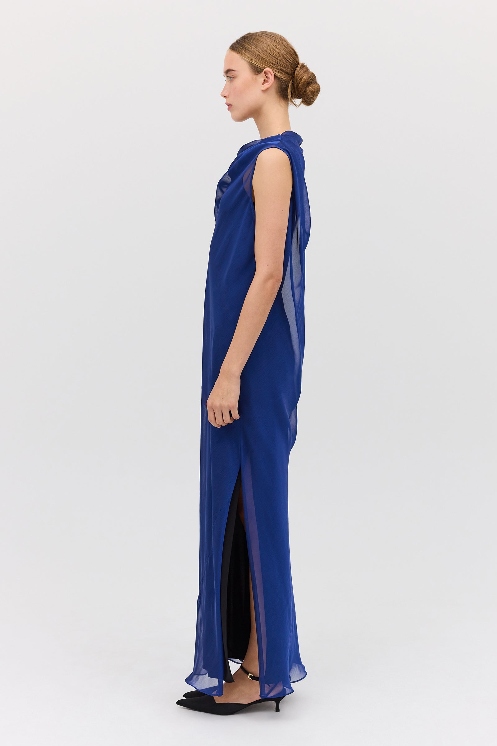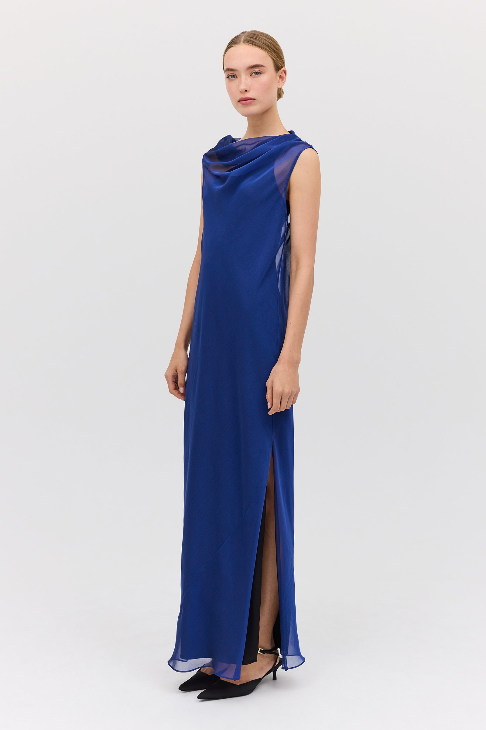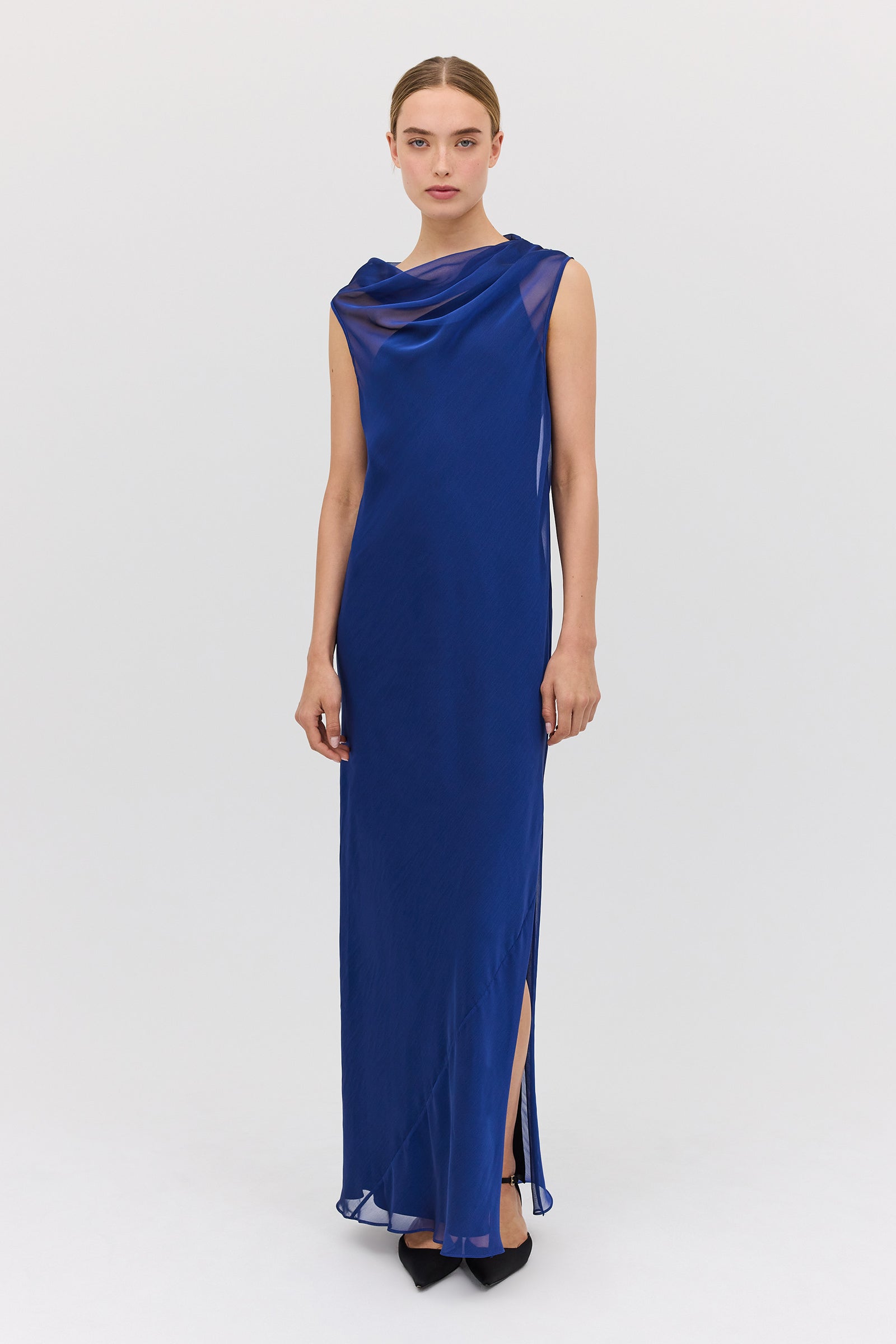 Introducing the Cezanne Gown. Leaning into the idea of intimacy and sensuality, glimpses of skin are gleaned through the veiled sheerness of the chiffon fabric. The bared-shoulder design, amplifying the intimate notion of revelation and concealment. This cowl neckline design is free-slowing and fluid throughout the body, with subtle side splits to the knee allowing ease of movement.