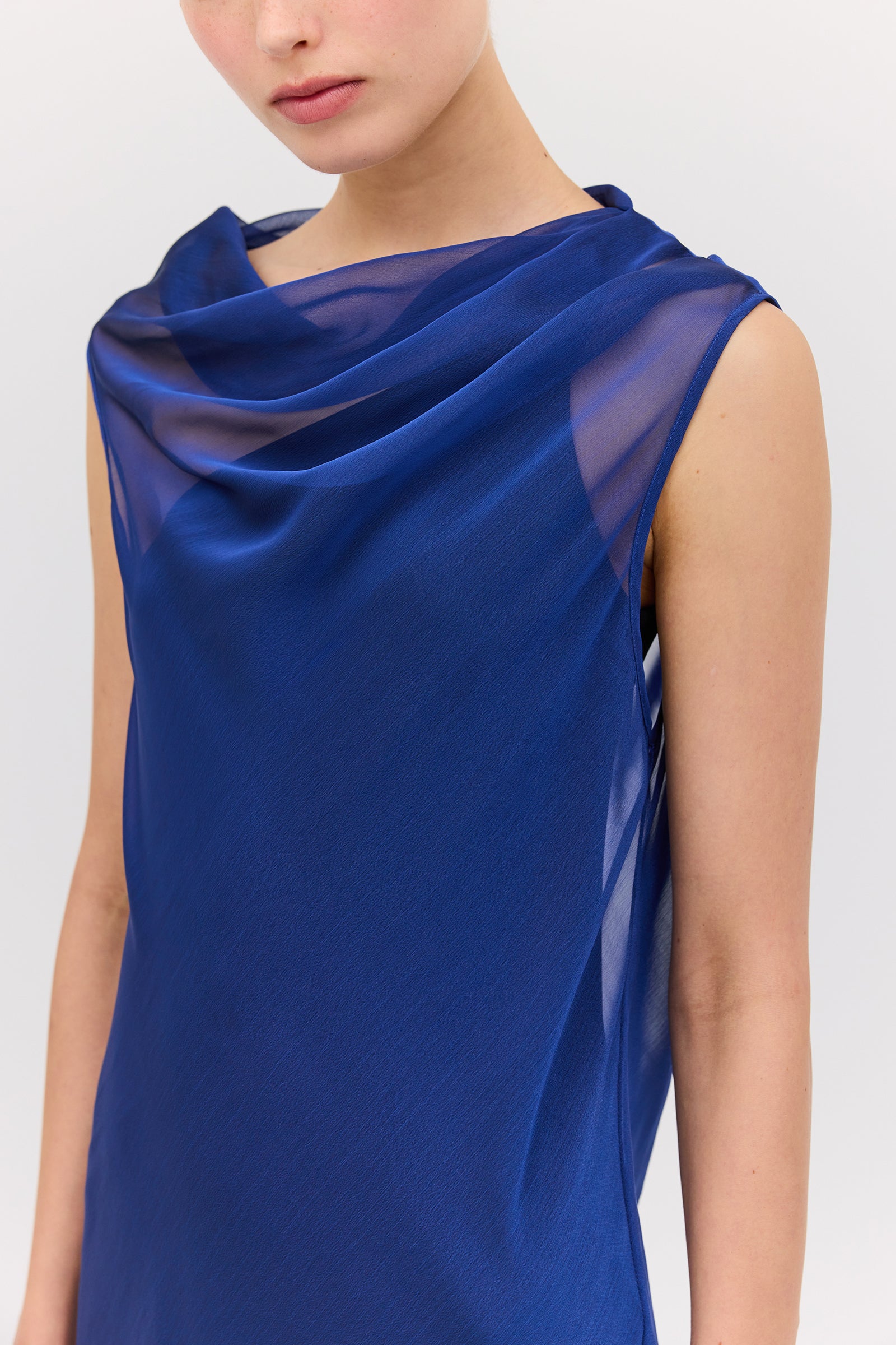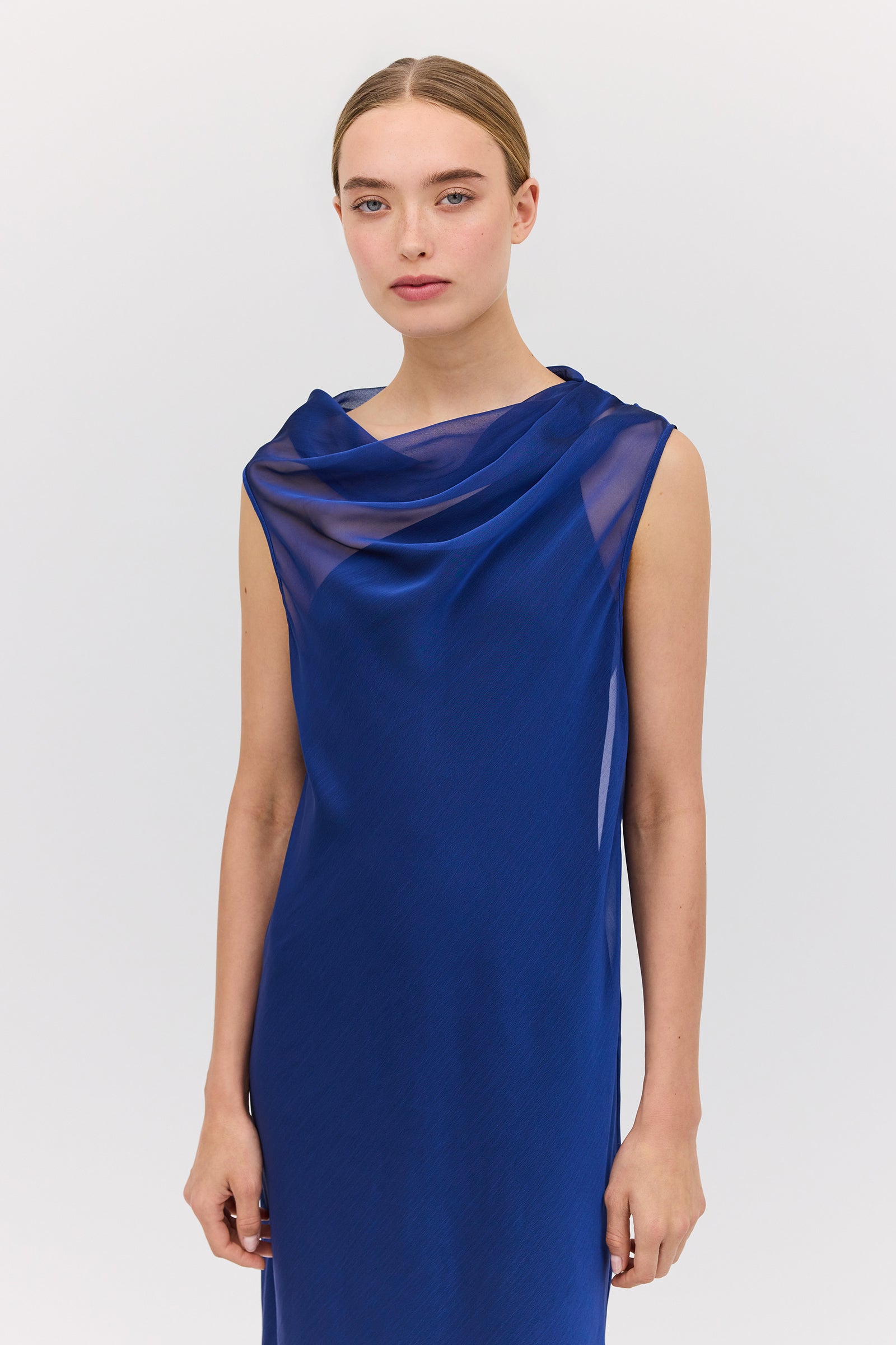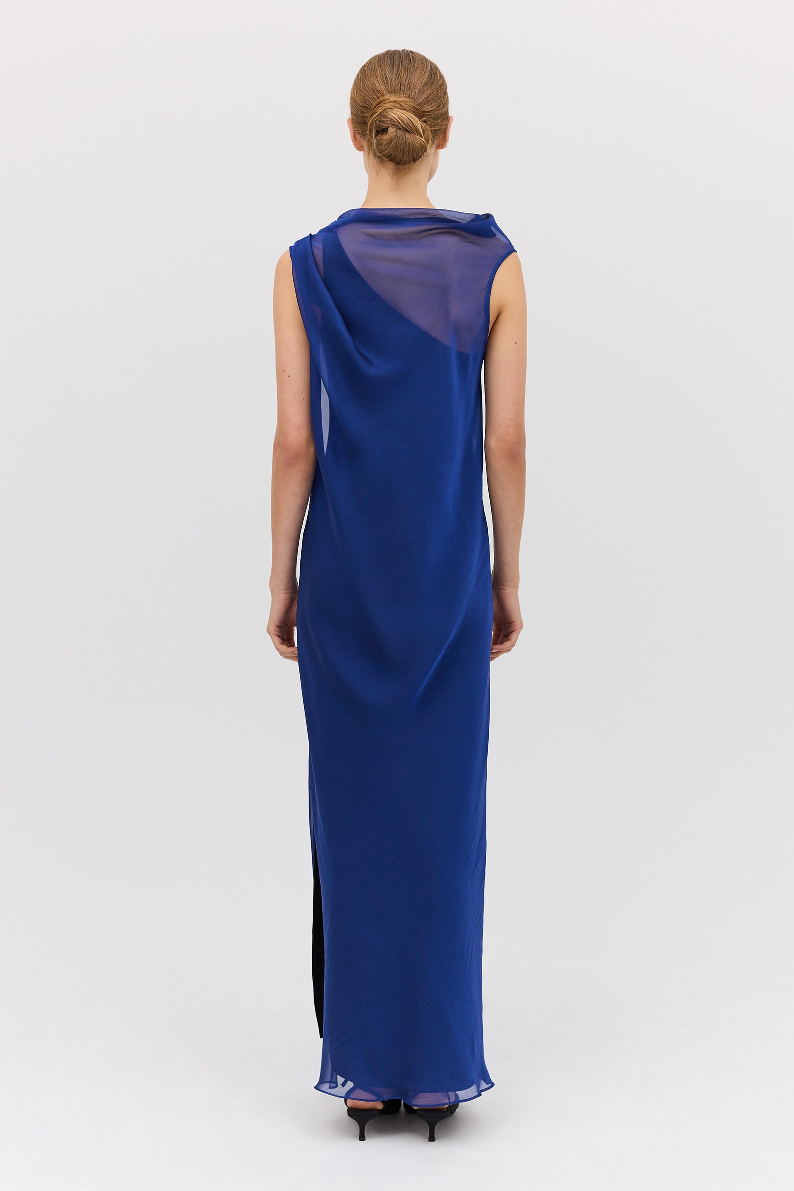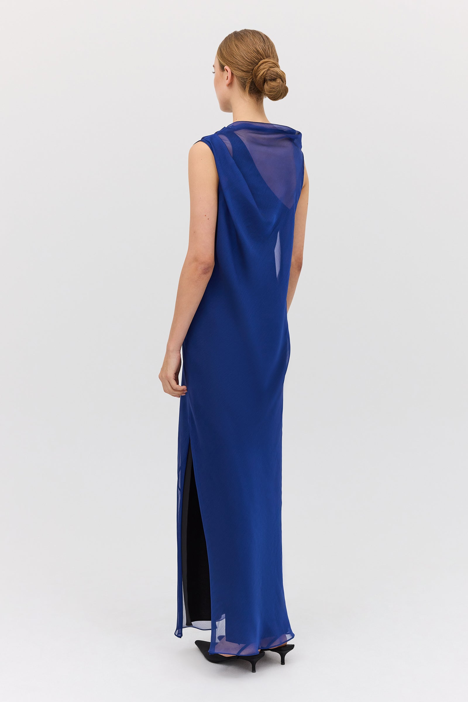 Introducing the Cezanne Gown. Leaning into the idea of intimacy and sensuality, glimpses of skin are gleaned through the veiled sheerness of the chiffon fabric. The bared-shoulder design, amplifying the intimate notion of revelation and concealment. This cowl neckline design is free-slowing and fluid throughout the body, with subtle side splits to the knee allowing ease of movement.