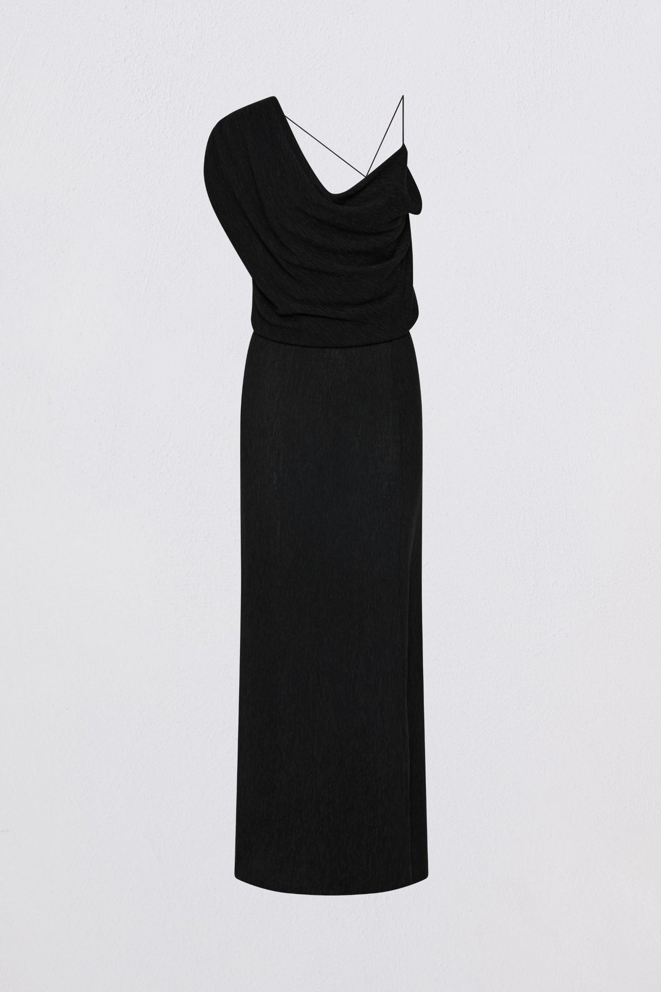 A new interpretation of our bestselling Liquid silhouette, now reimagined as a full-length dress in lightweight Japanese crinkle. Sculptural drape and soft asymmetry define the form - the cowl neckline falls effortlessly across the body, while the single strap and fluid folds create a sense of quiet drama.