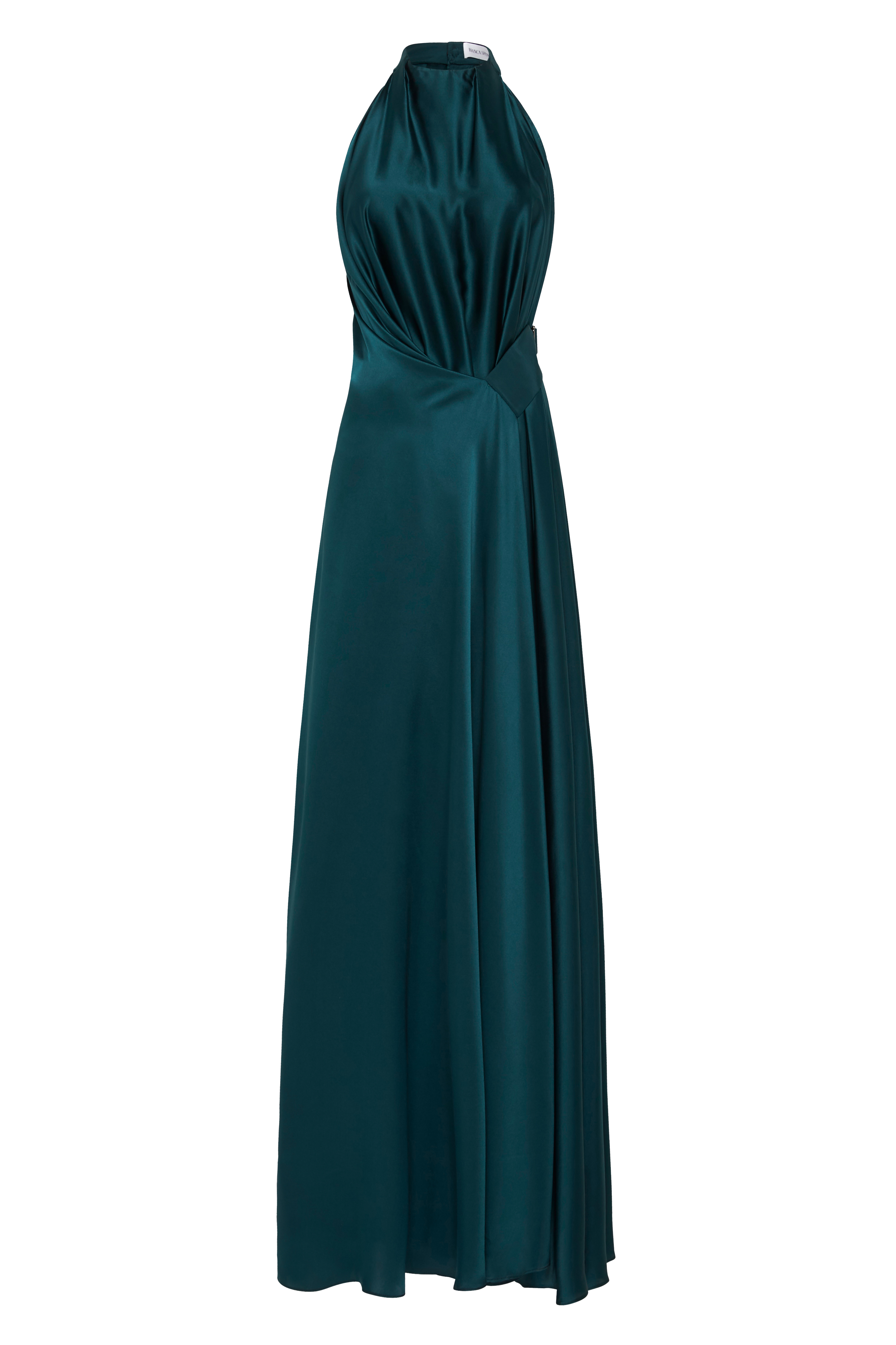 The Isabella Gown exudes glamour and sophistication. The gown is cut from lustrous silk satin and gracefully falls to the ground, skimming the body. It features a high neckline and a delicate side adjustable belt that cinches in at the waist, creating a stunning feminine silhouette.