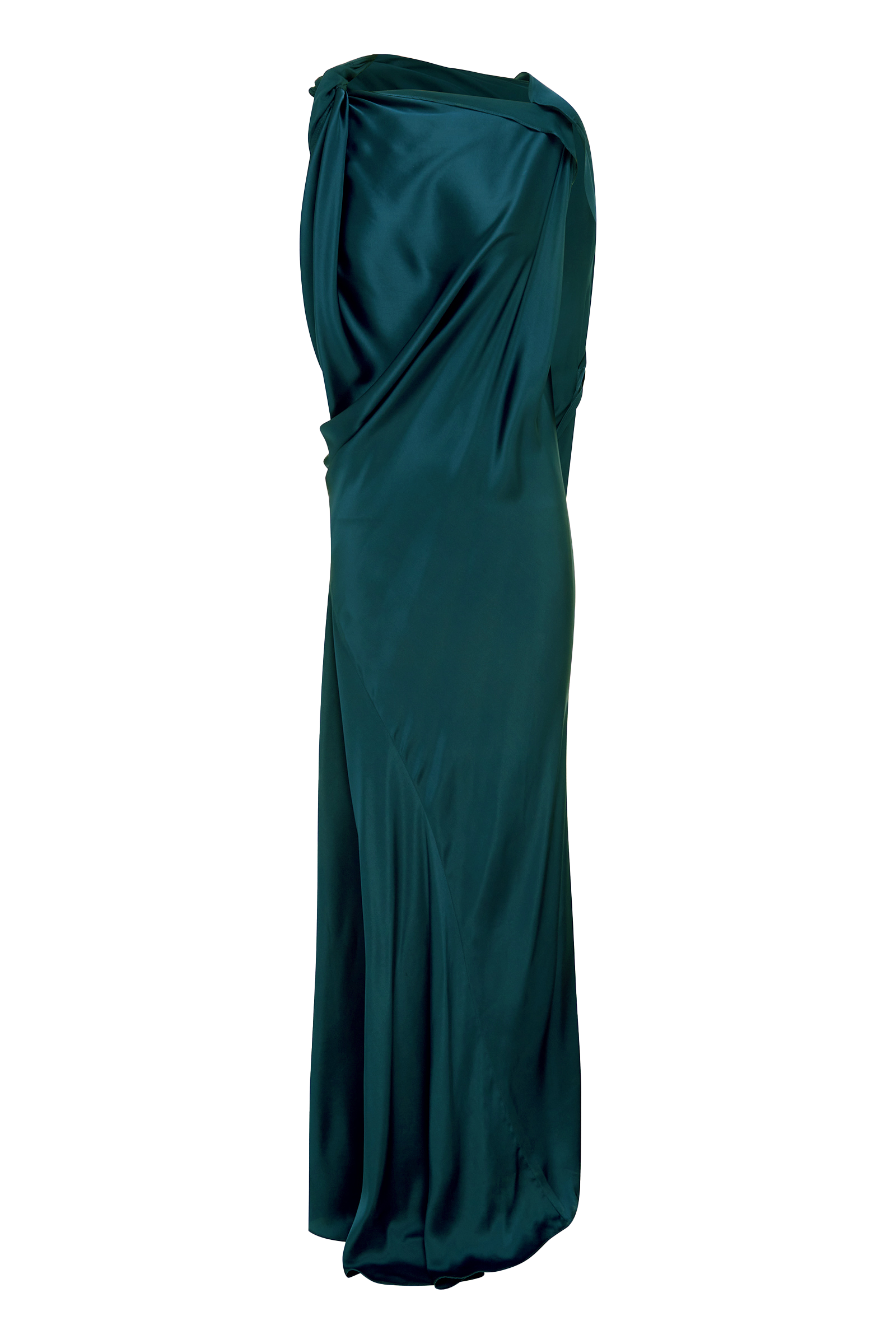 The Roma Gown is draped from a single length of cloth. Twisted and folded to accentuate and elongate the body, this stunning style is cut in our seasonless Petrol silk. With its draped bodice and contouring stitching across the skirt, the Roma Gown is an unforgettable piece. A reversible style that can be worn either way.