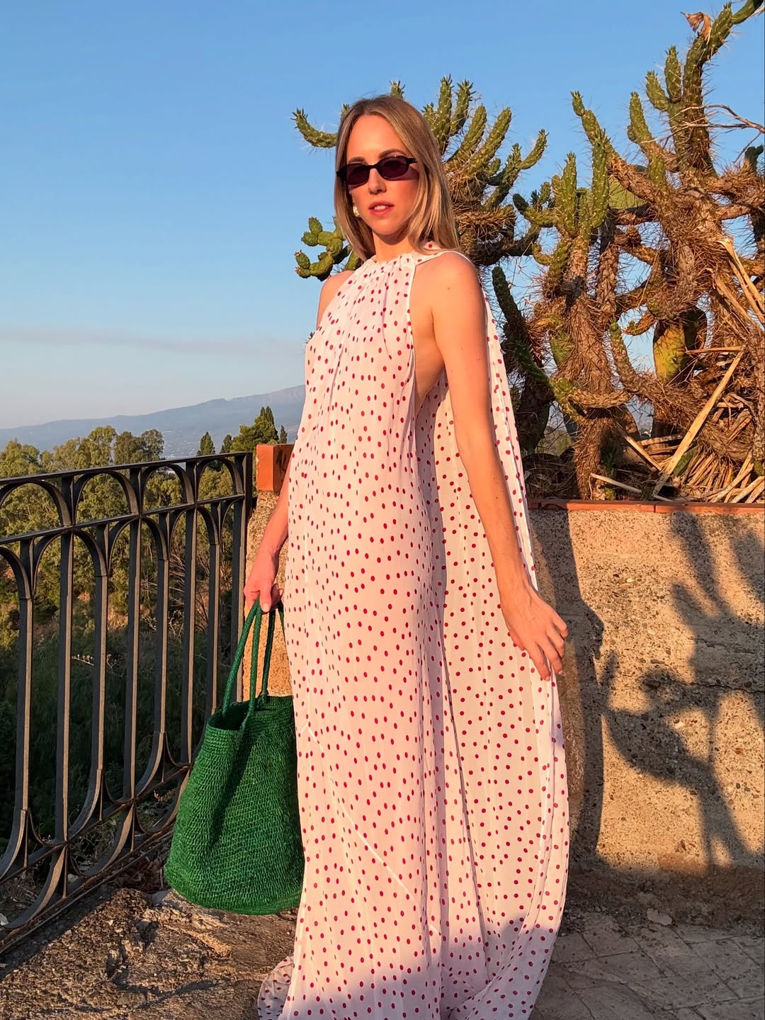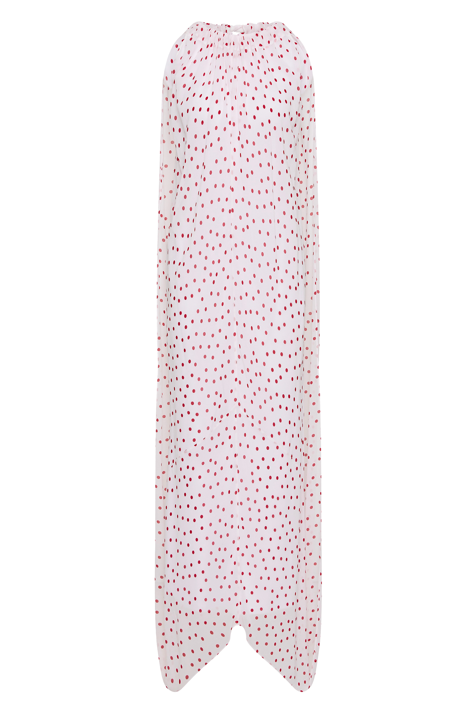 A sheer statement in playful red polka dot chiffon, the Current Dress features a high, gathered neckline and a softly draped silhouette that moves with ease. The looped back detail adds fluidity and elegance, echoing the much-loved Polka Dot Emerge Dress in a refreshed palette. Swooping drape panels sculpt gentle shape as you move, making this a striking option for summer occasions.