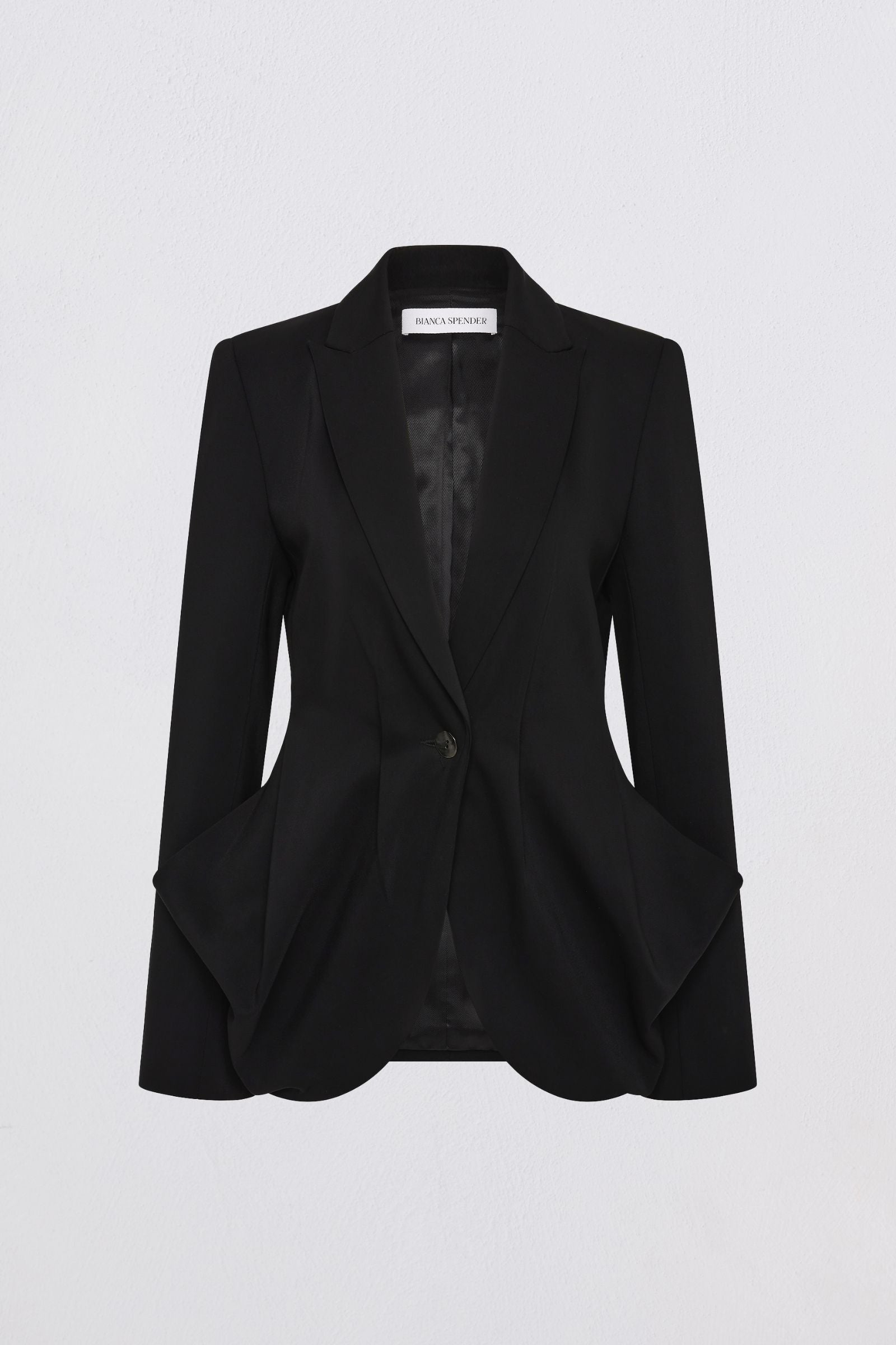 A study in soft structure, the Black Crepe Suiting Surrender Jacket reimagines tailoring with sculptural fluidity. Cut in a cool black crepe, the silhouette features a deep V neckline, sharp lapel, and full-length sleeve, brought into balance by a single button fastening. A signature swooping drape detail falls from the hip, creating a sense of movement and ease. Designed to pair with the matching Surrender Pant, or to stand alone as a directional statement.