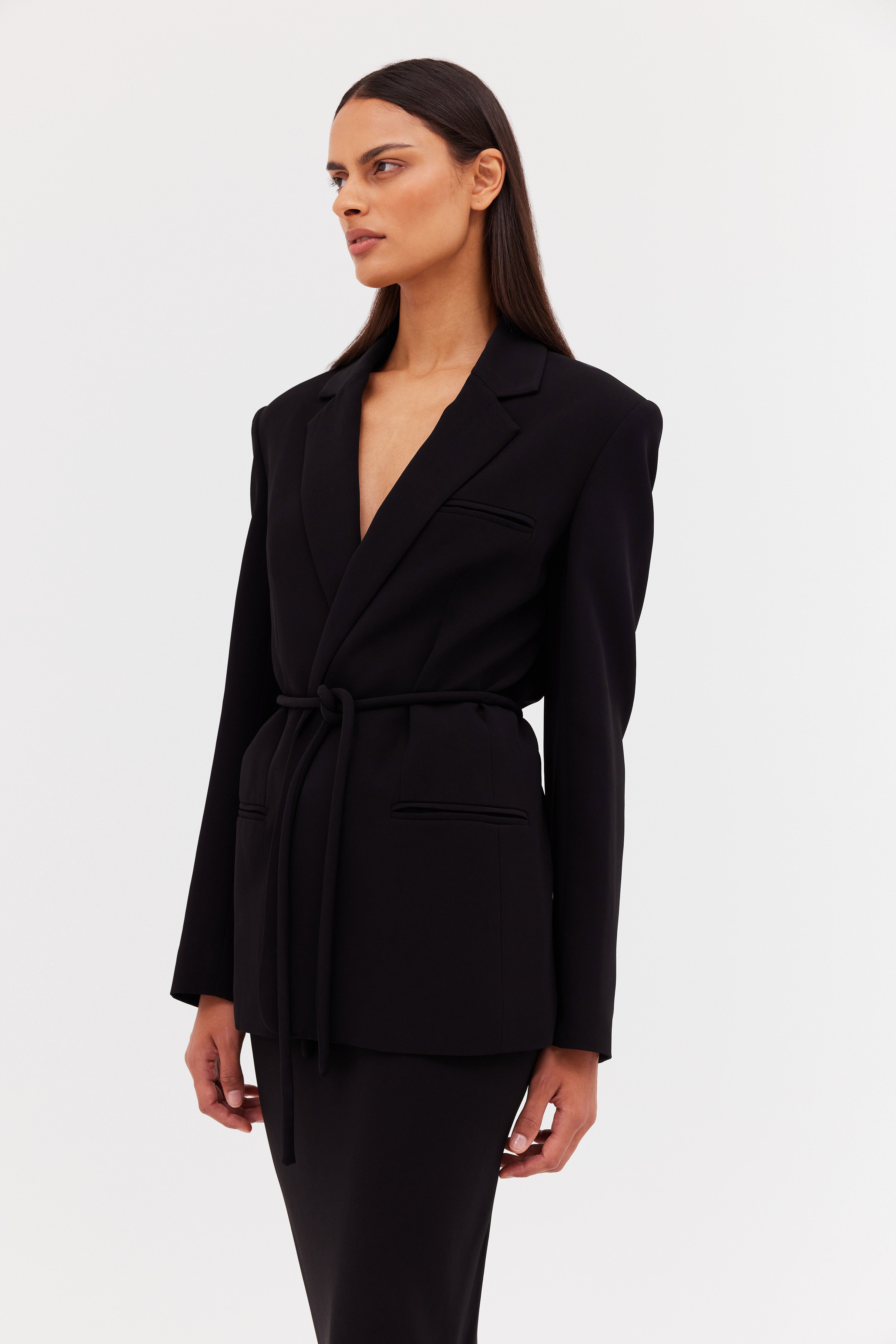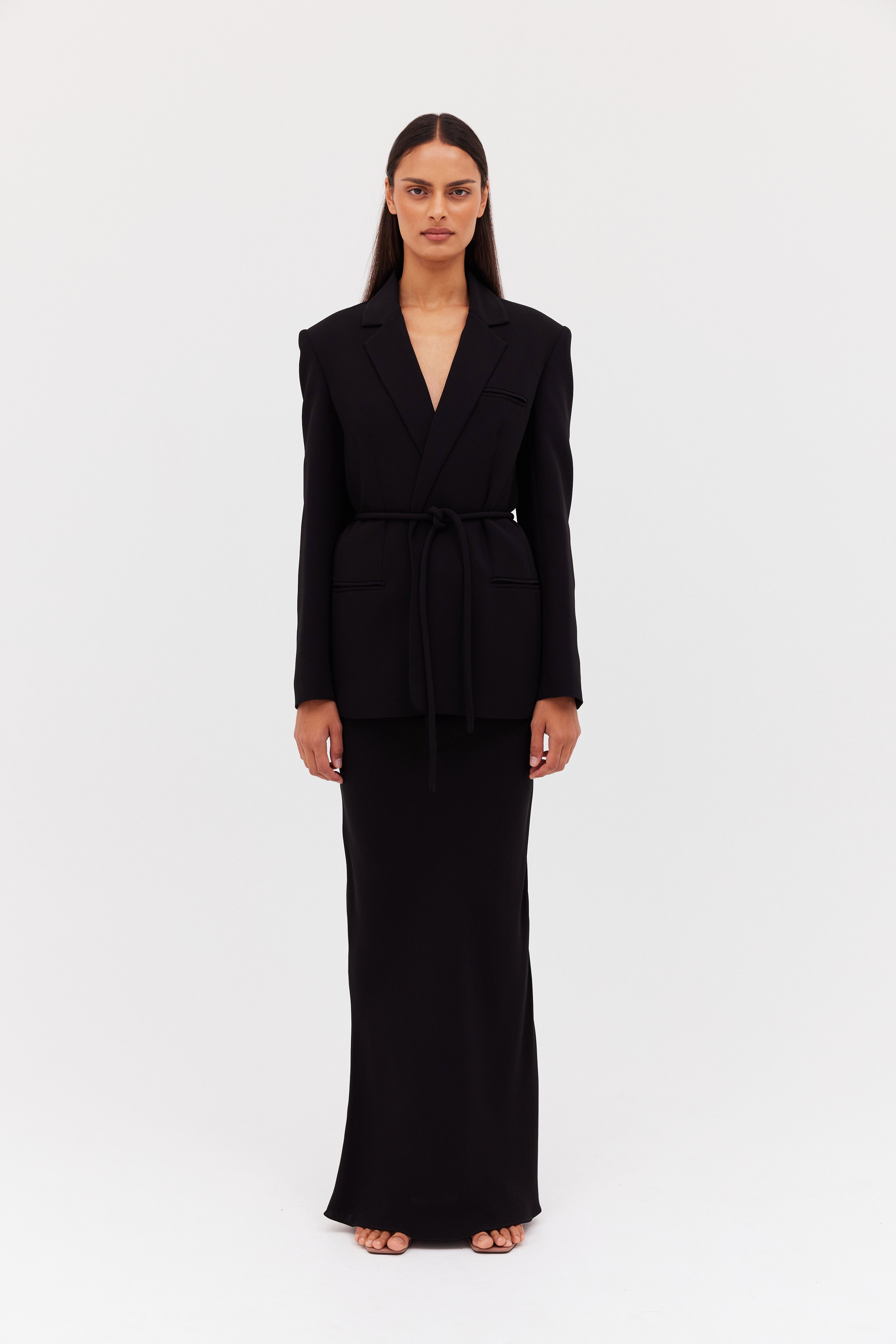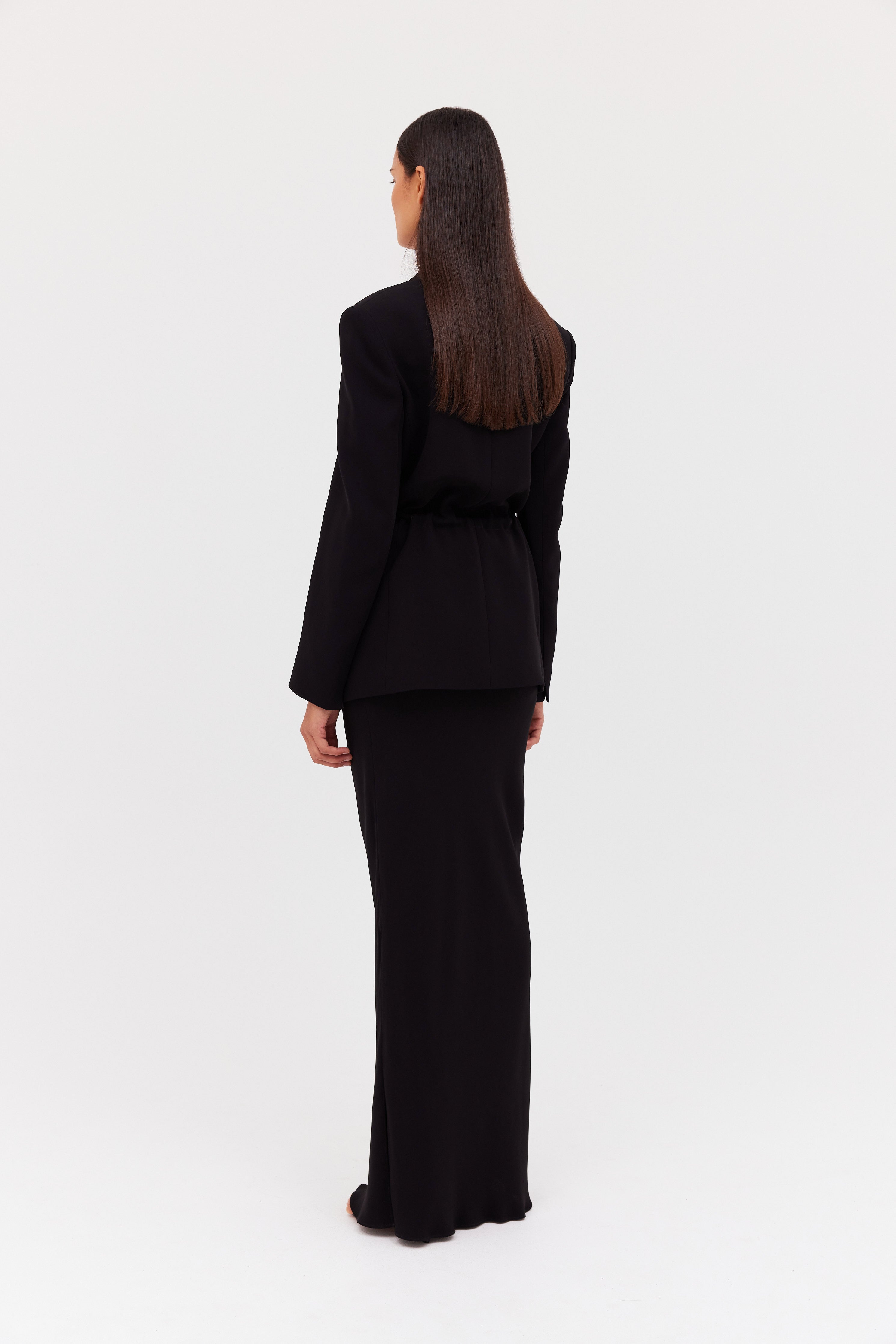 Unrestricted tailoring for modern dressing. The Shifting Jacket is constructed in Black Crepe and designed with an adjustable drawstring that plays on utility.