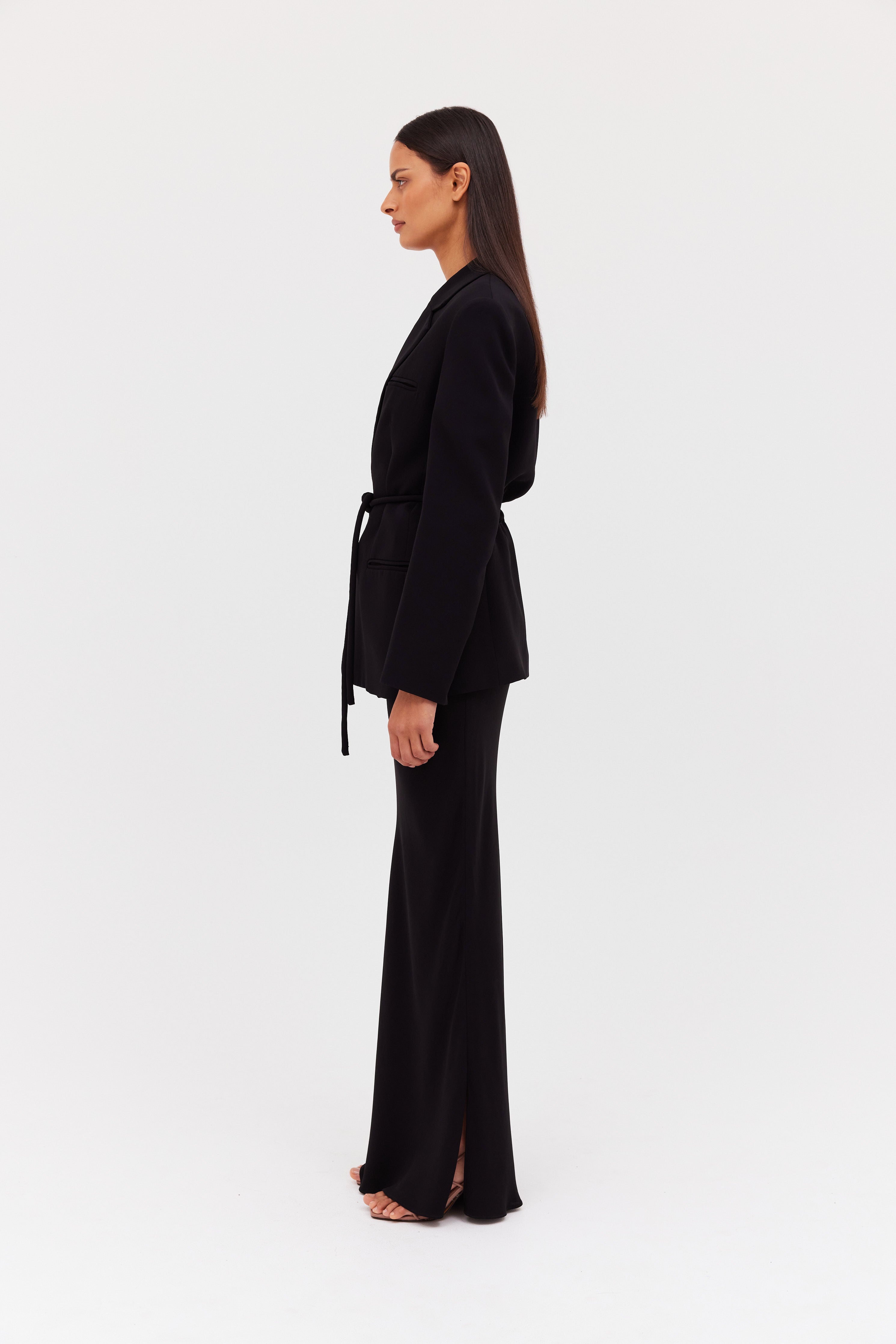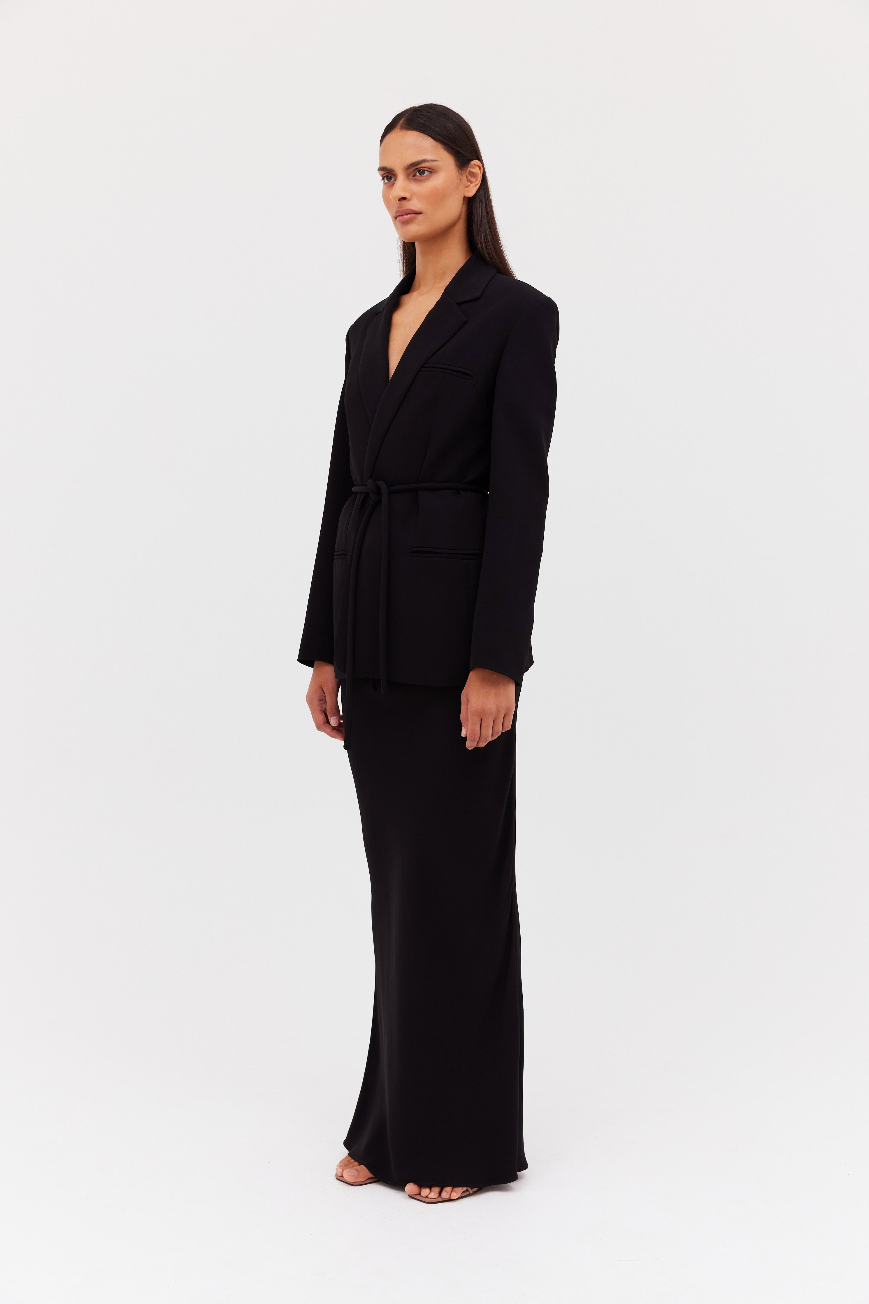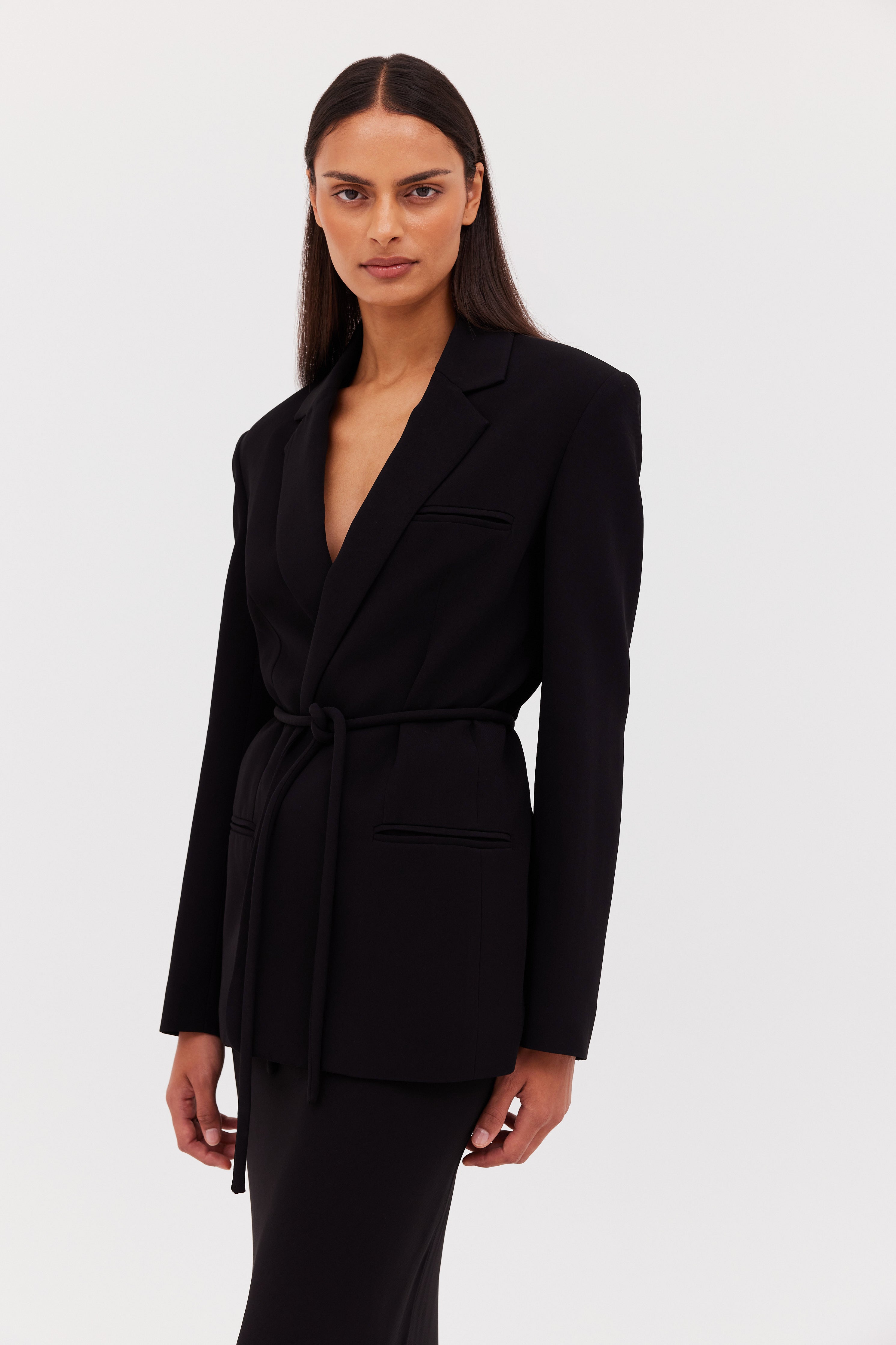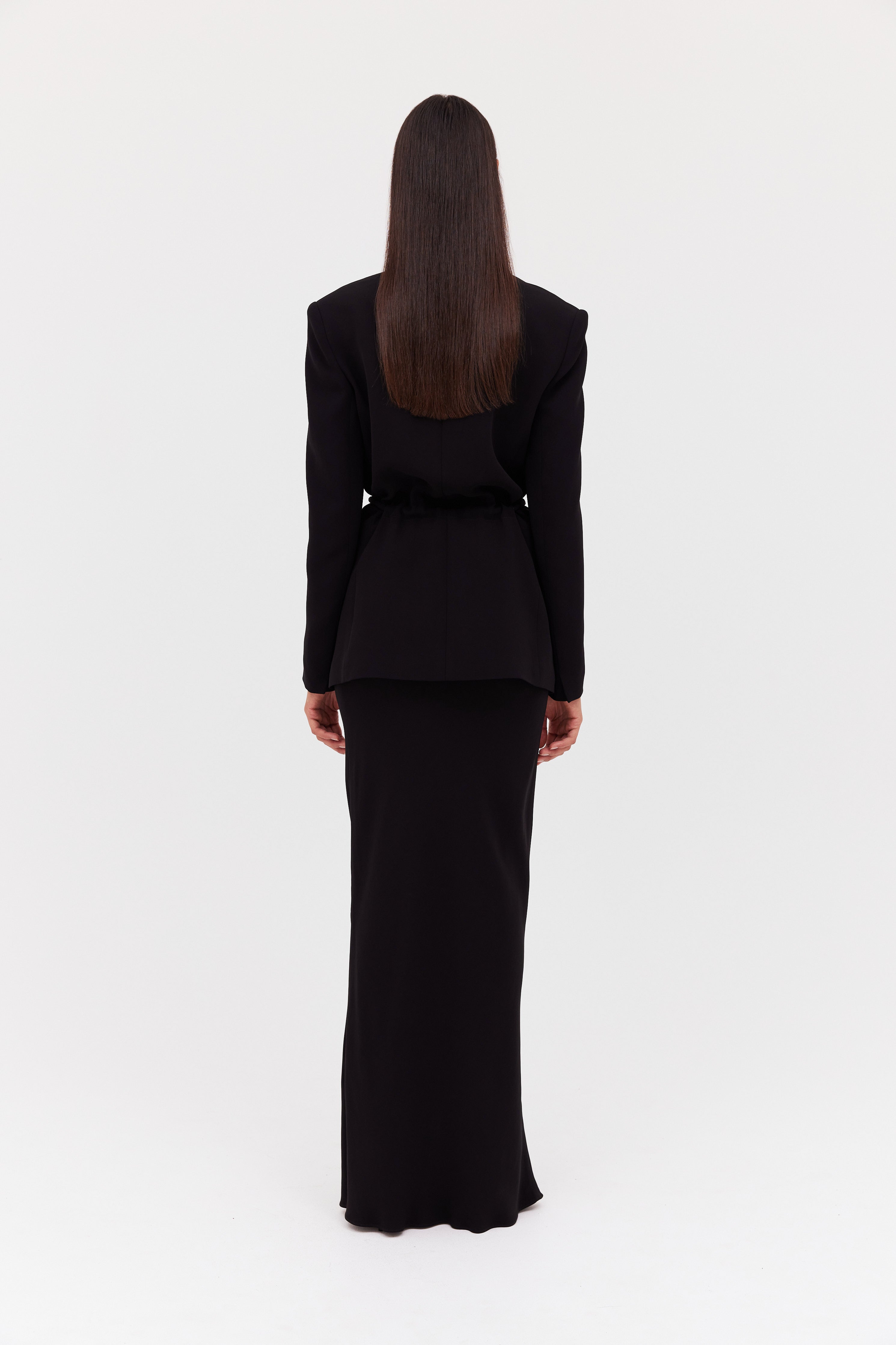 Unrestricted tailoring for modern dressing. The Shifting Jacket is constructed in Black Crepe and designed with an adjustable drawstring that plays on utility.