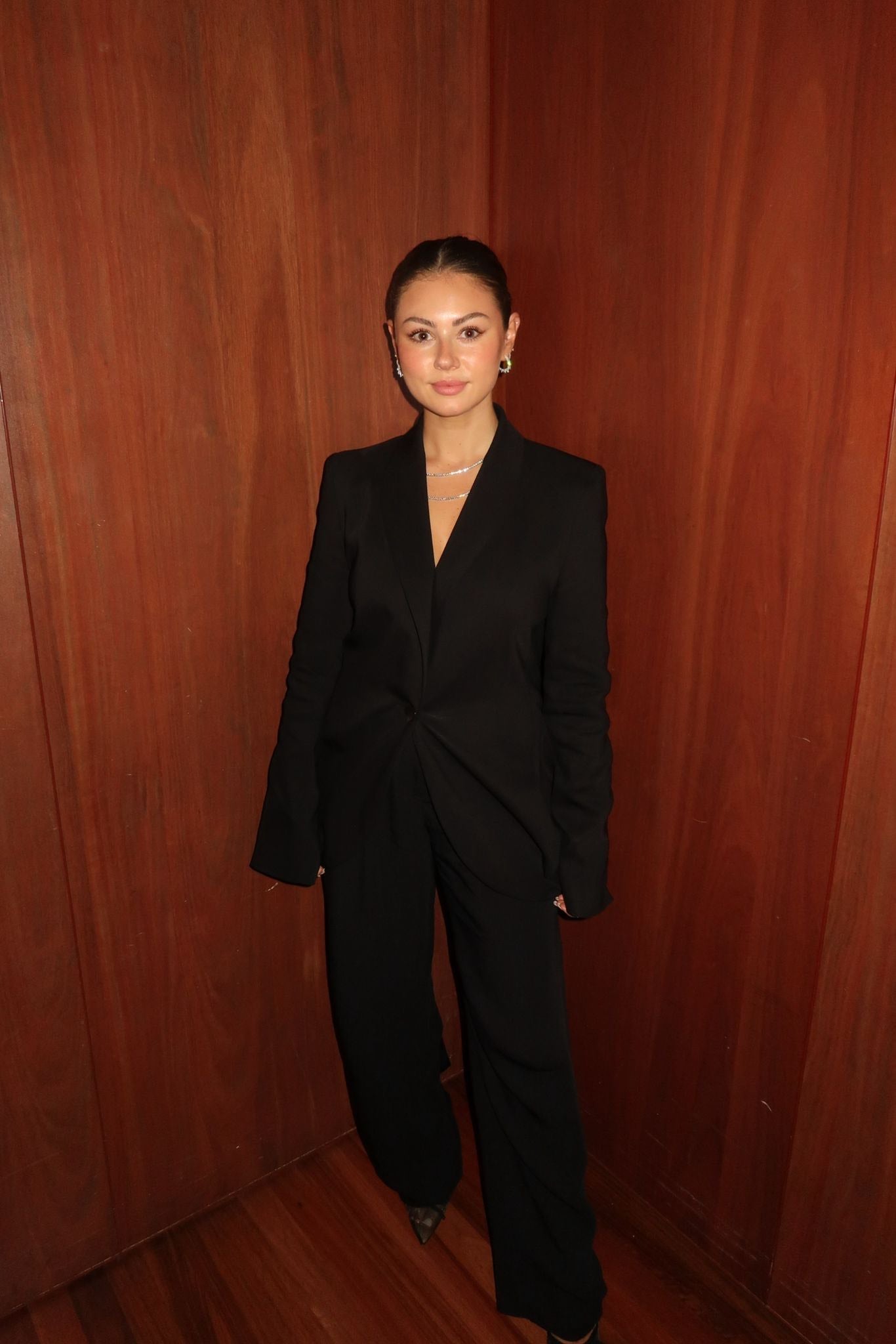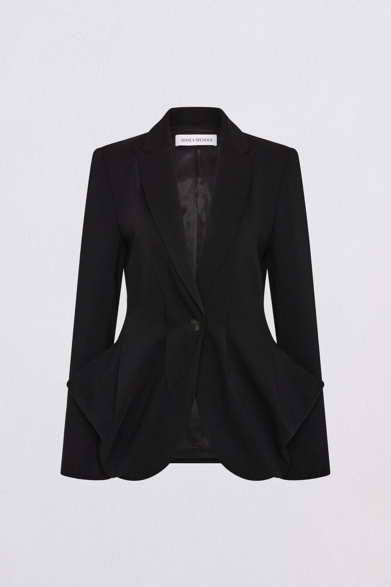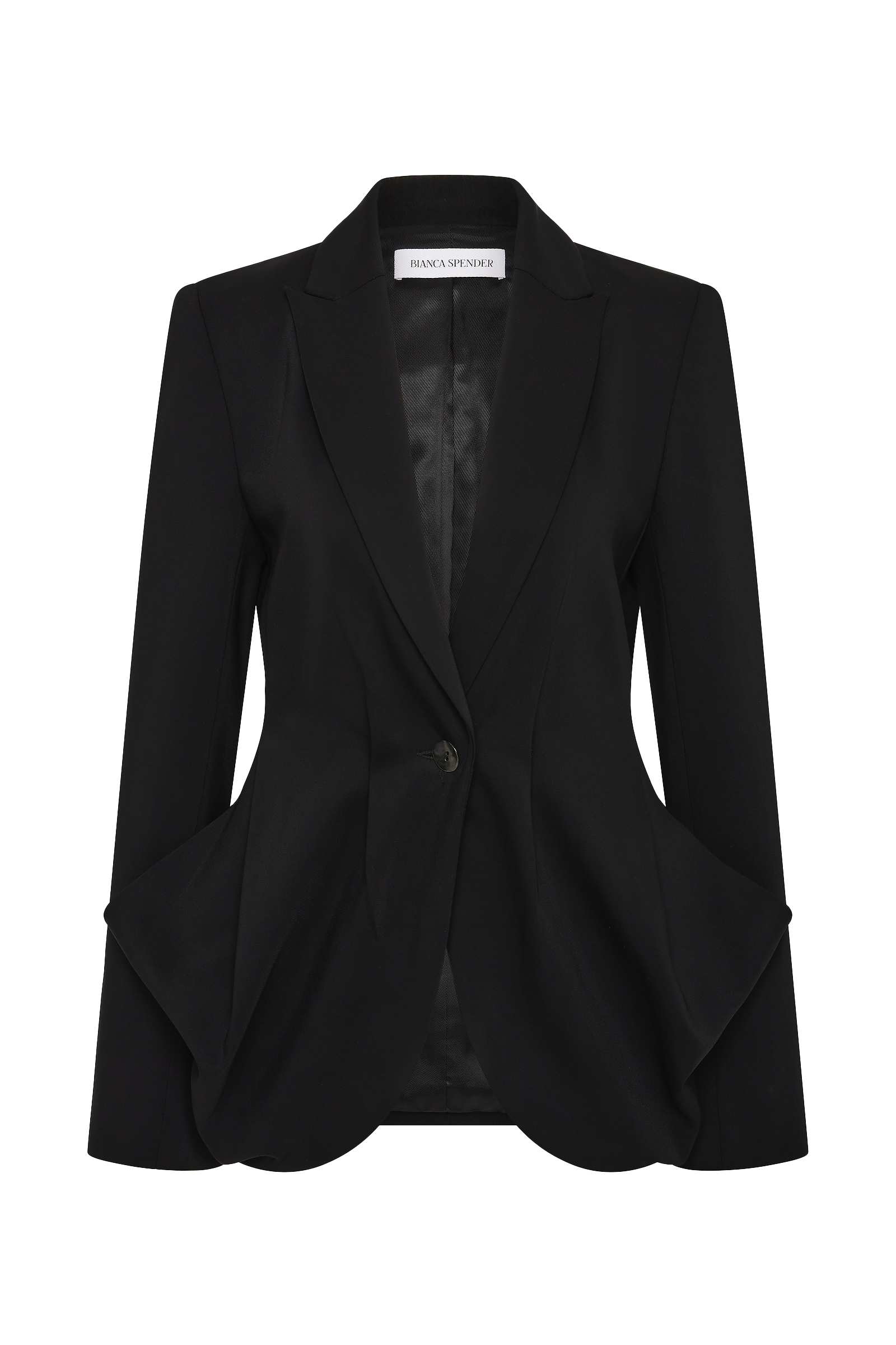 A study in soft structure, the Black Crepe Suiting Surrender Jacket reimagines tailoring with sculptural fluidity. Cut in a cool black crepe, the silhouette features a deep V neckline, sharp lapel, and full-length sleeve, brought into balance by a single button fastening. A signature swooping drape detail falls from the hip, creating a sense of movement and ease. Designed to pair with the matching Surrender Pant, or to stand alone as a directional statement.