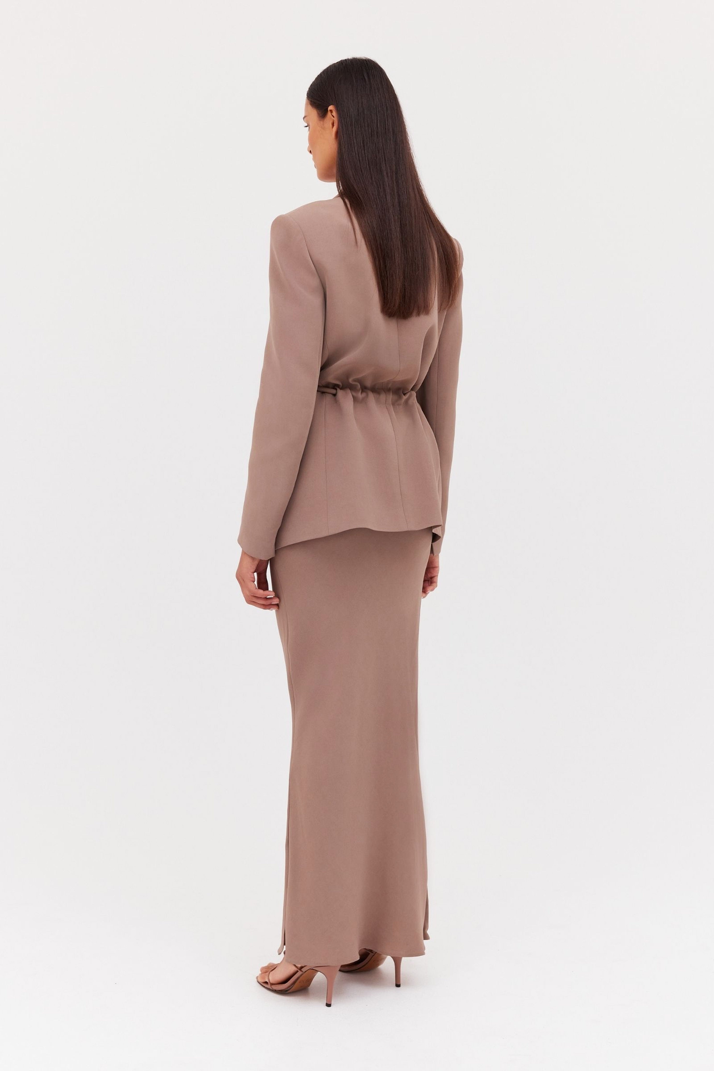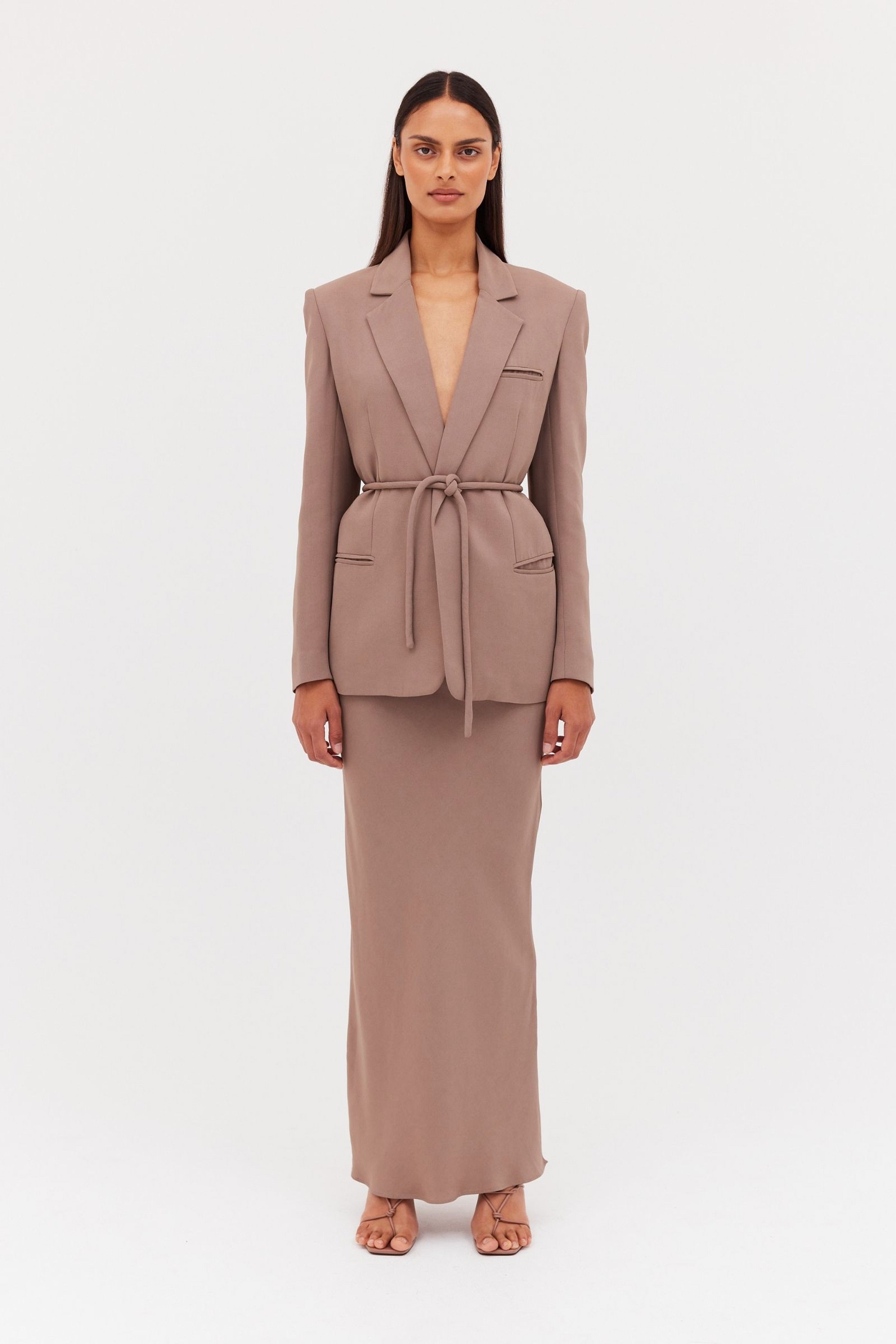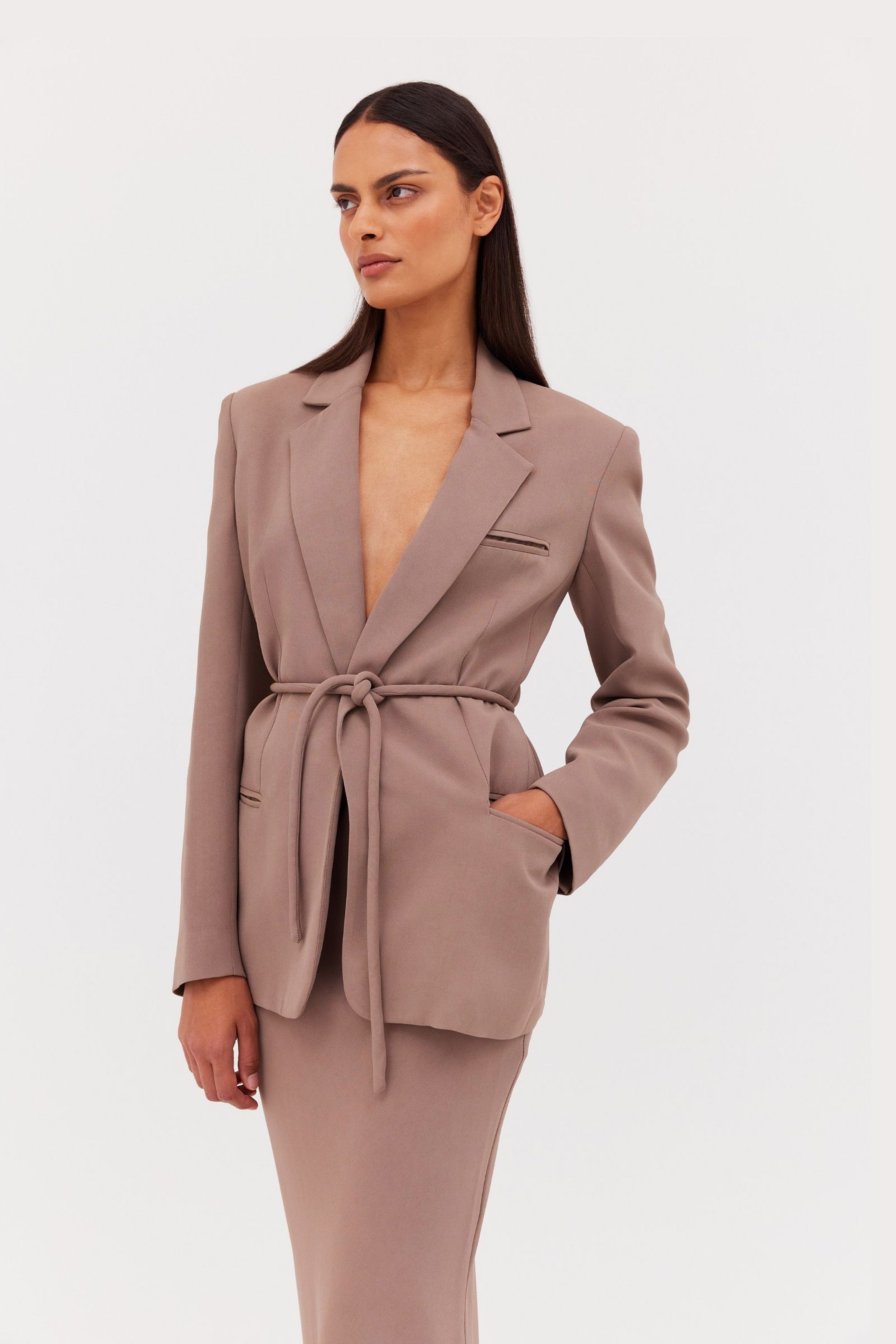 Unrestricted tailoring for modern dressing. Our Spring 2023 Australian Fashion Week opening look, The Shifting Jacket is constructed in Taupe Suiting and designed with an adjustable drawstring that plays on utility. Wear on its own, tied at the waist for a sensual yet elegant look.