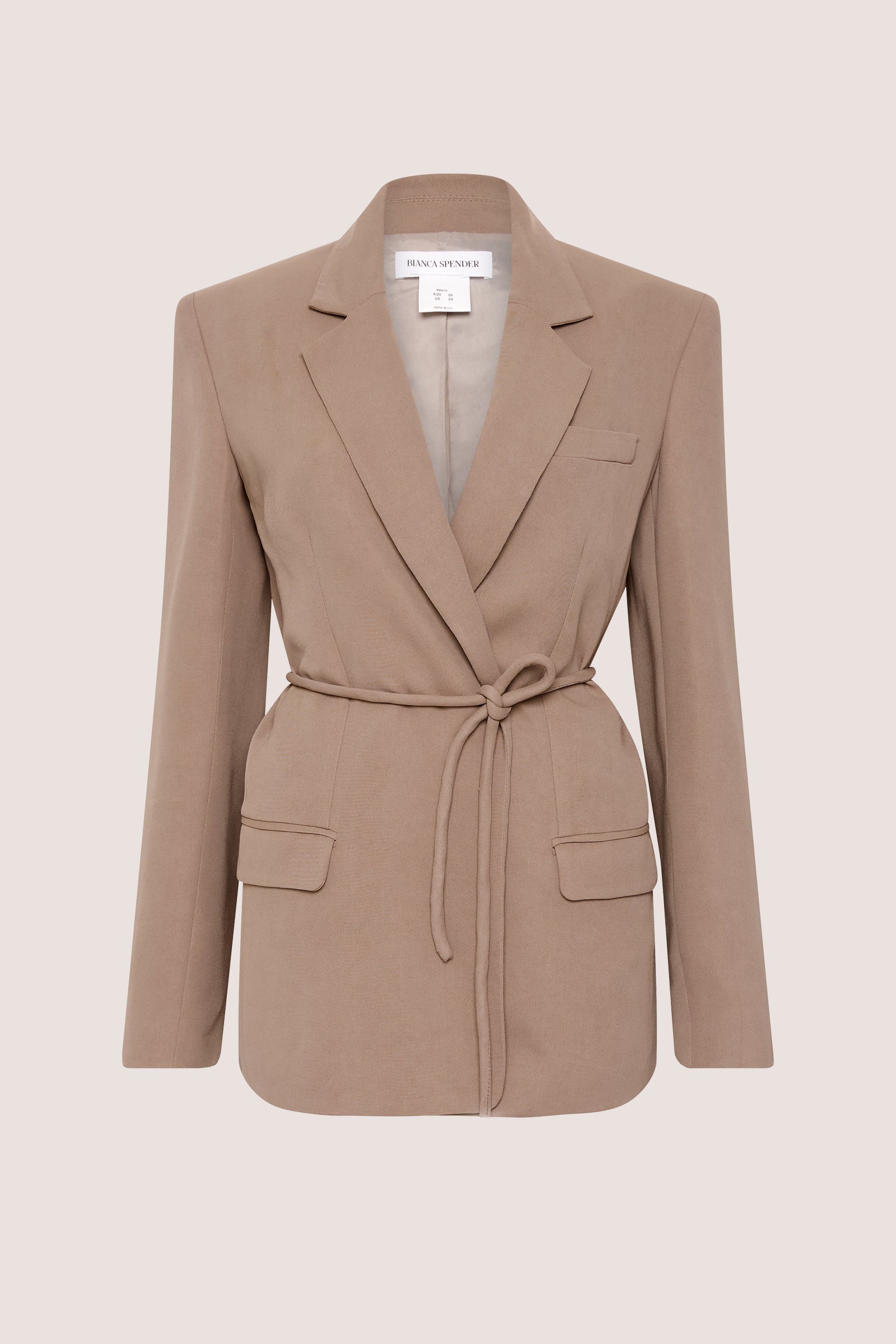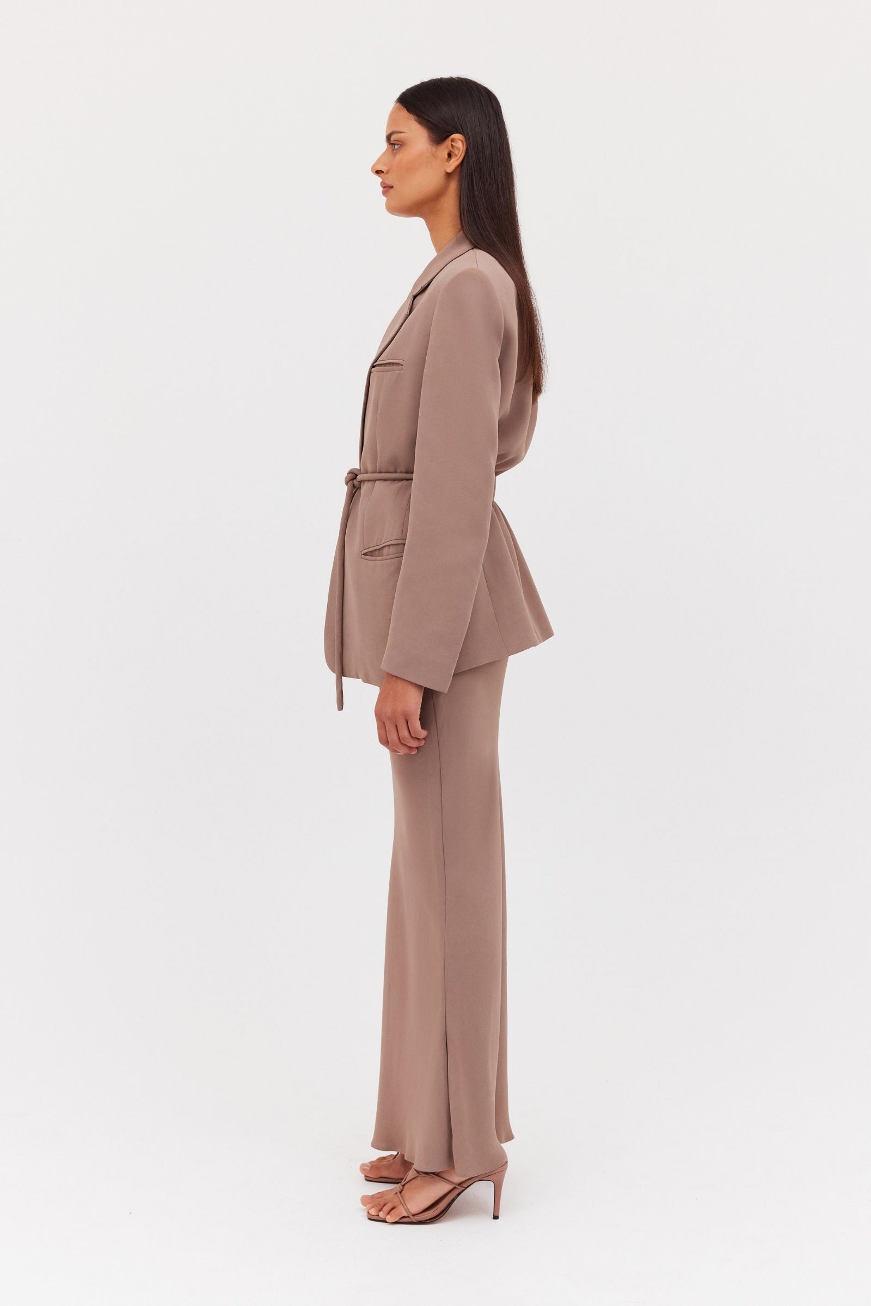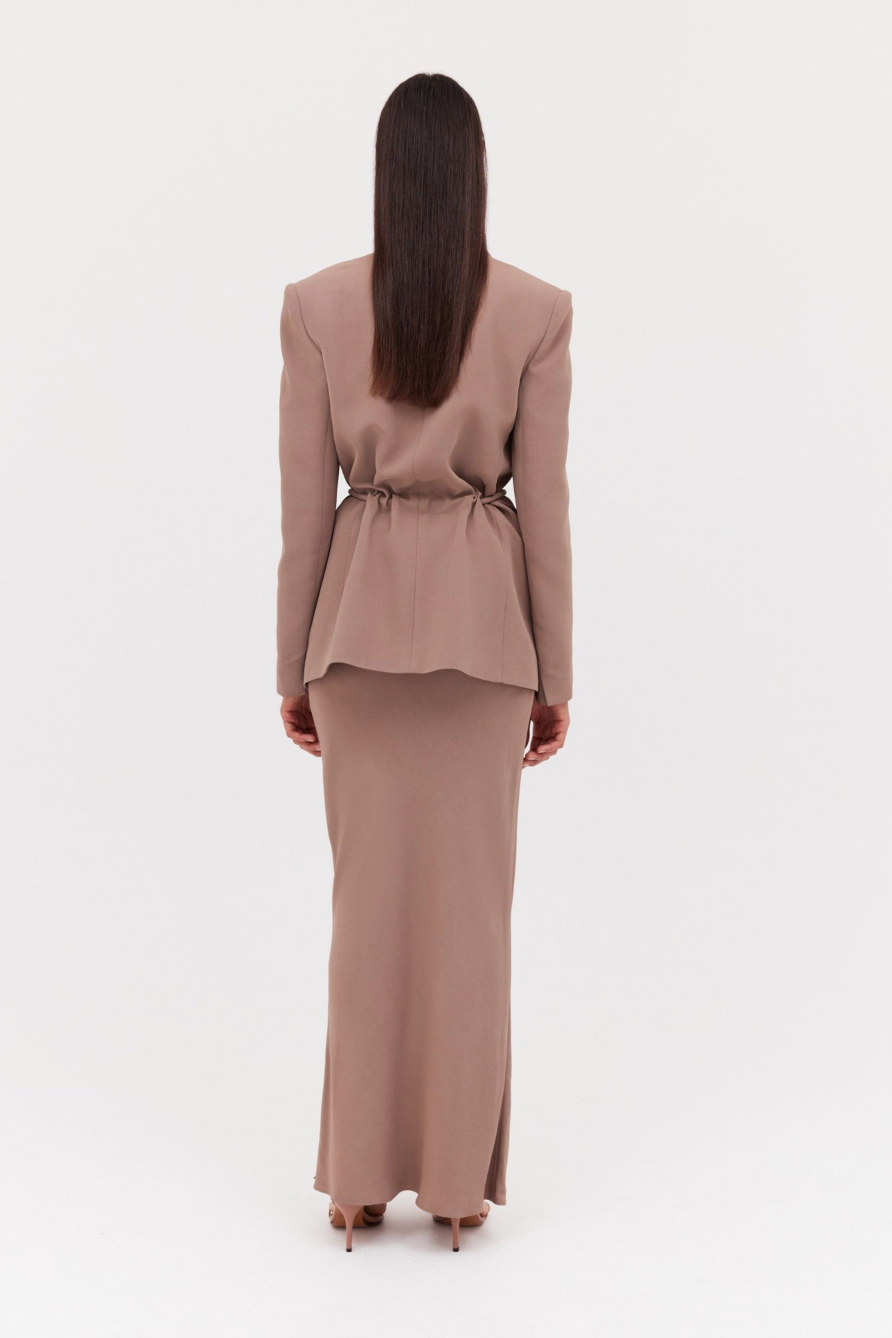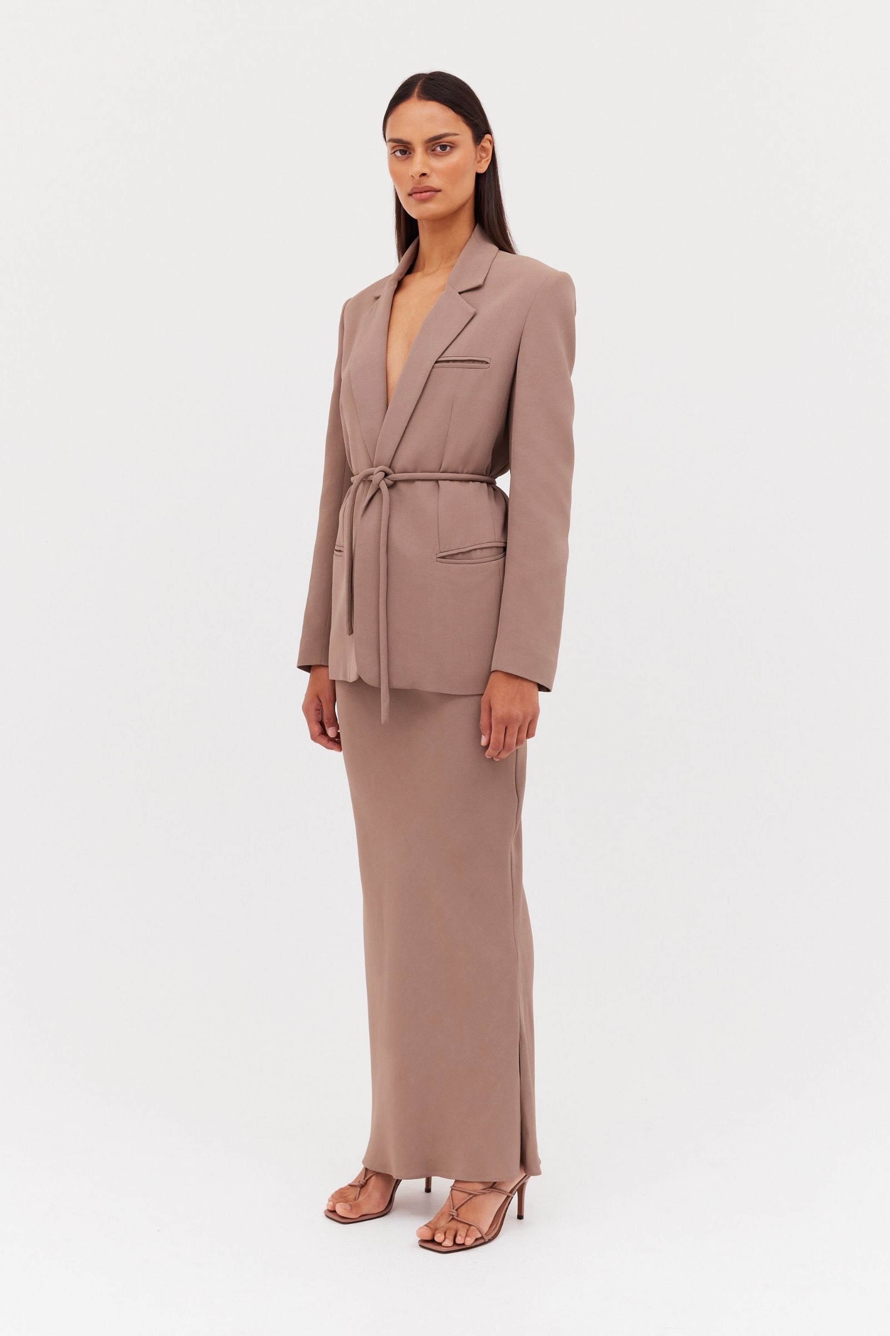 Unrestricted tailoring for modern dressing. Our Spring 2023 Australian Fashion Week opening look, The Shifting Jacket is constructed in Taupe Suiting and designed with an adjustable drawstring that plays on utility. Wear on its own, tied at the waist for a sensual yet elegant look.
