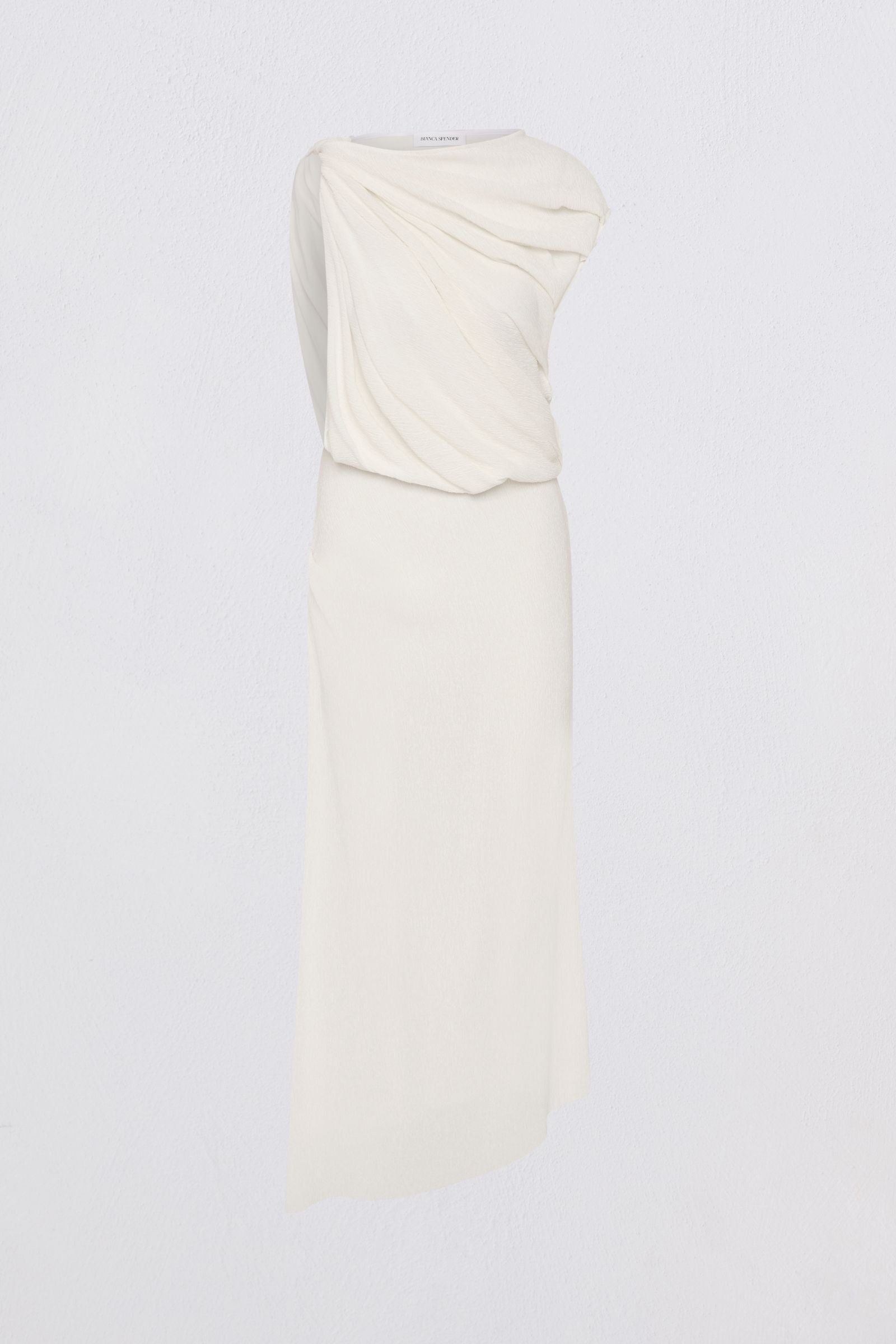 A signature Bianca Spender silhouette, reimagined in lightweight Japanese crinkle. The Tumble Dress is defined by its sculptural drape - a soft twist at the shoulder that falls into fluid folds, wrapping the body with ease.