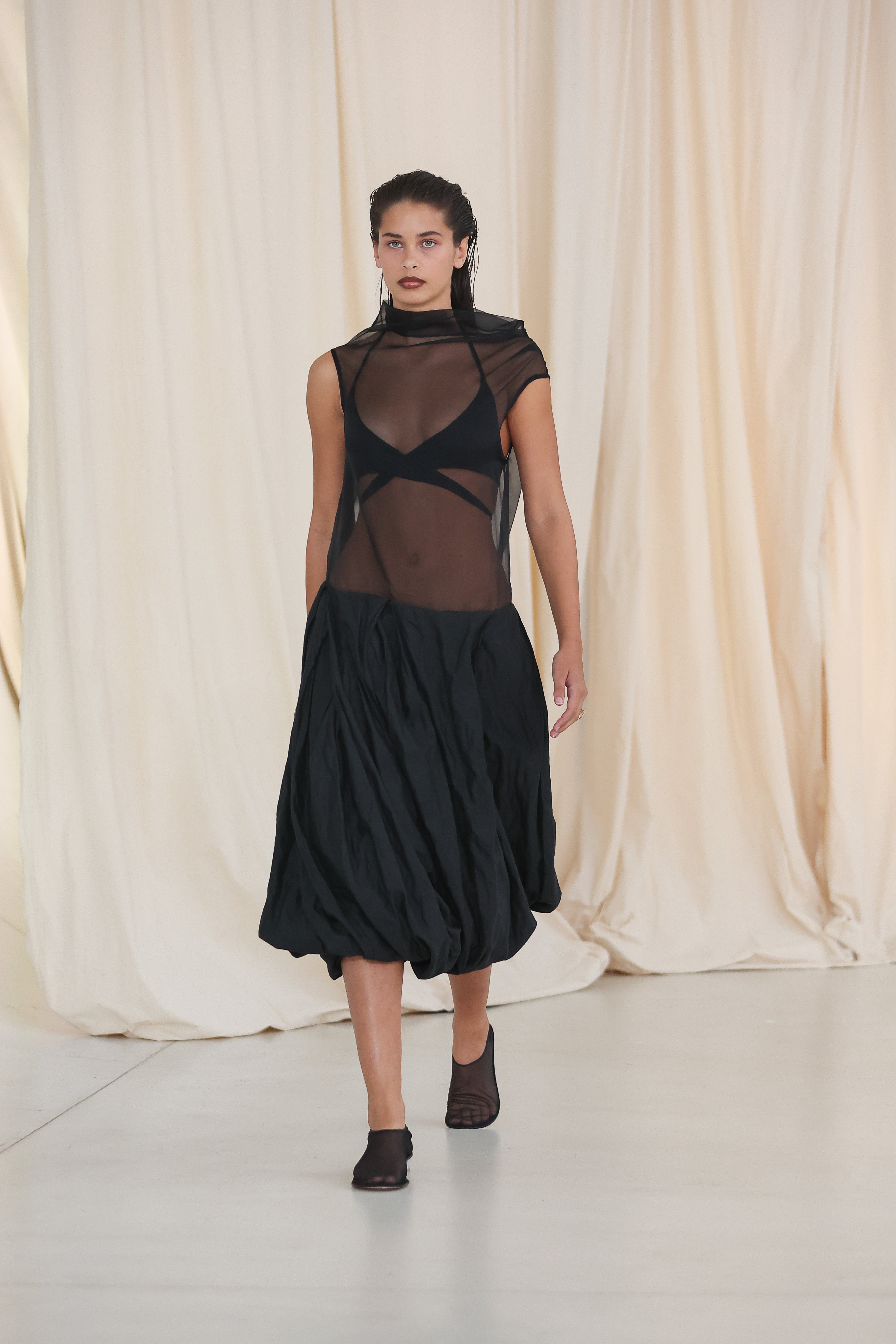 Crafted from a structured cotton metal fabric, the Deliquesce Skirt creates bold volume through its sculptural, bubble hem silhouette. Lightweight yet architectural, it moves with dynamic ease. Pair with the Black Silk Organza Cezanne Top for the full AFW runway look.