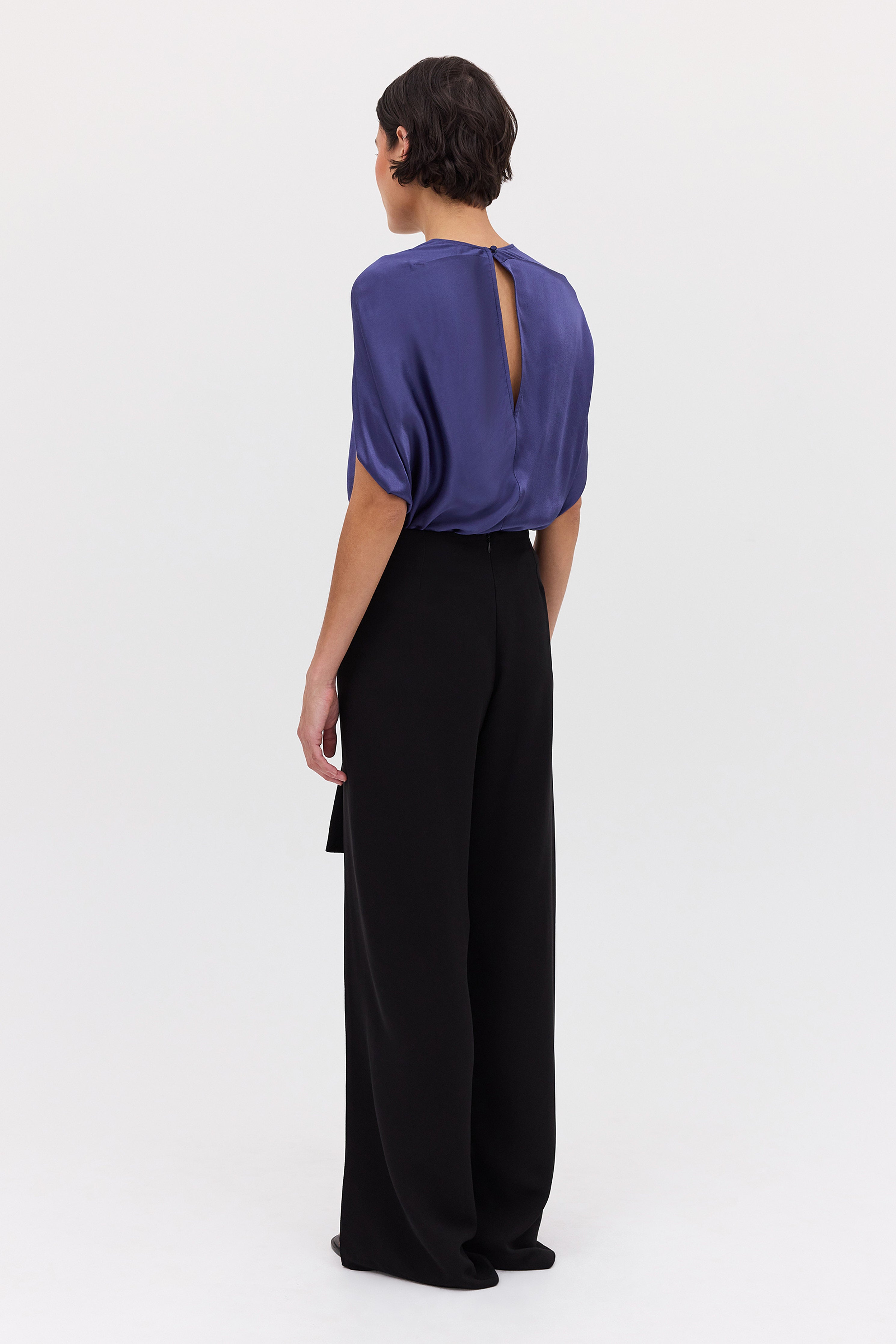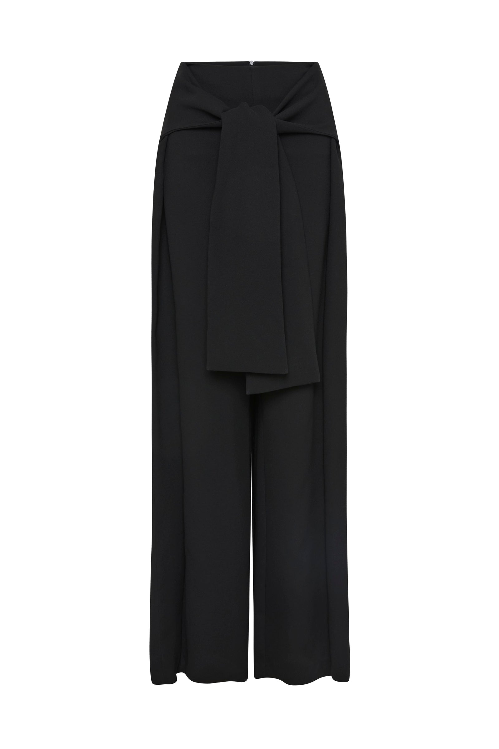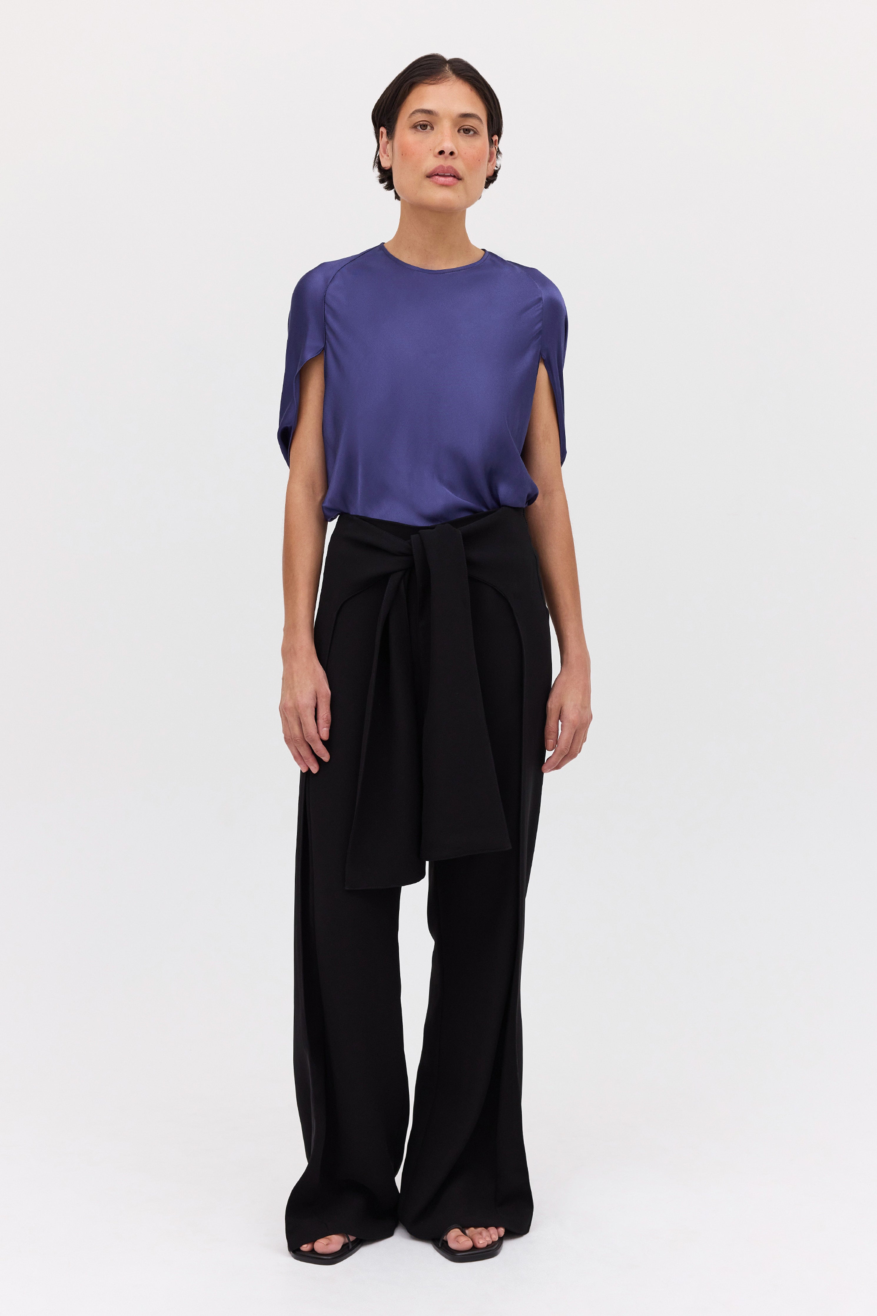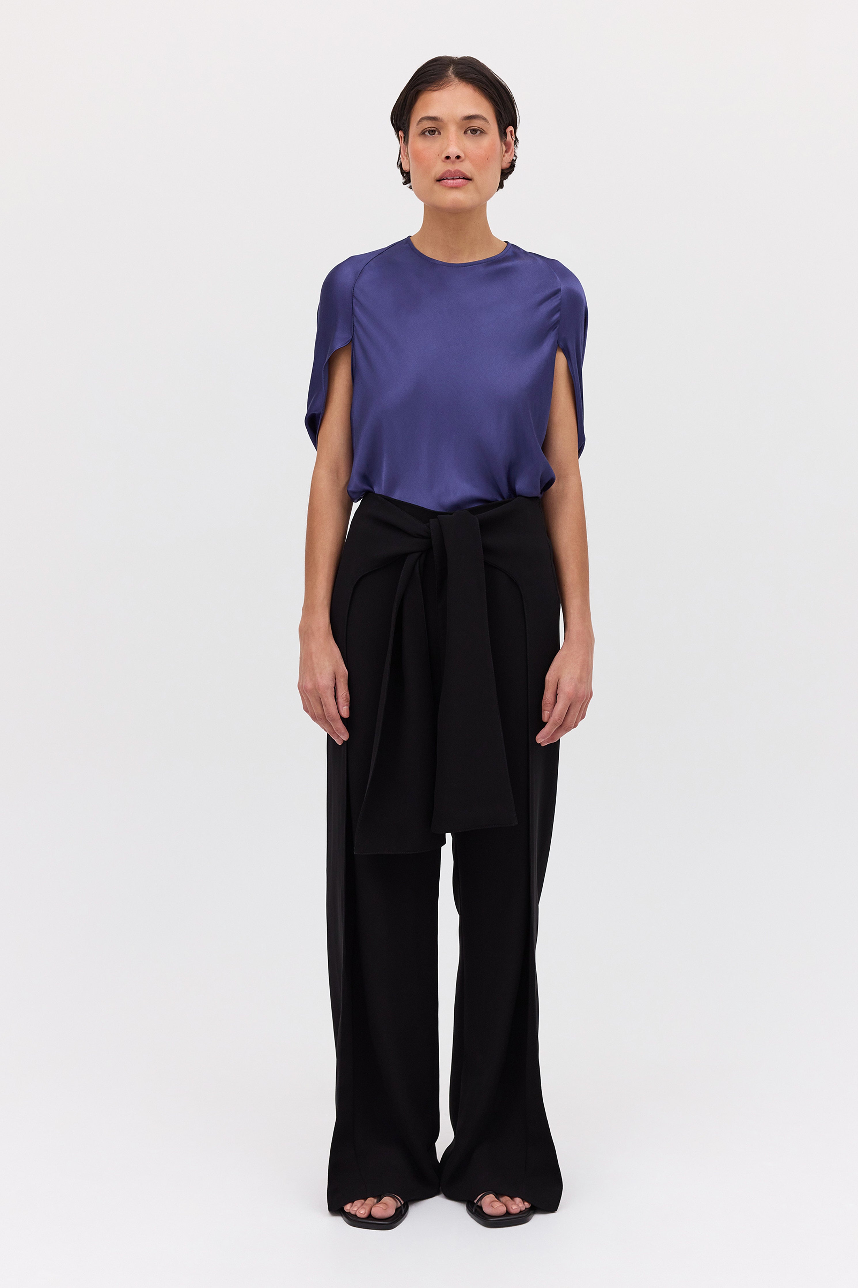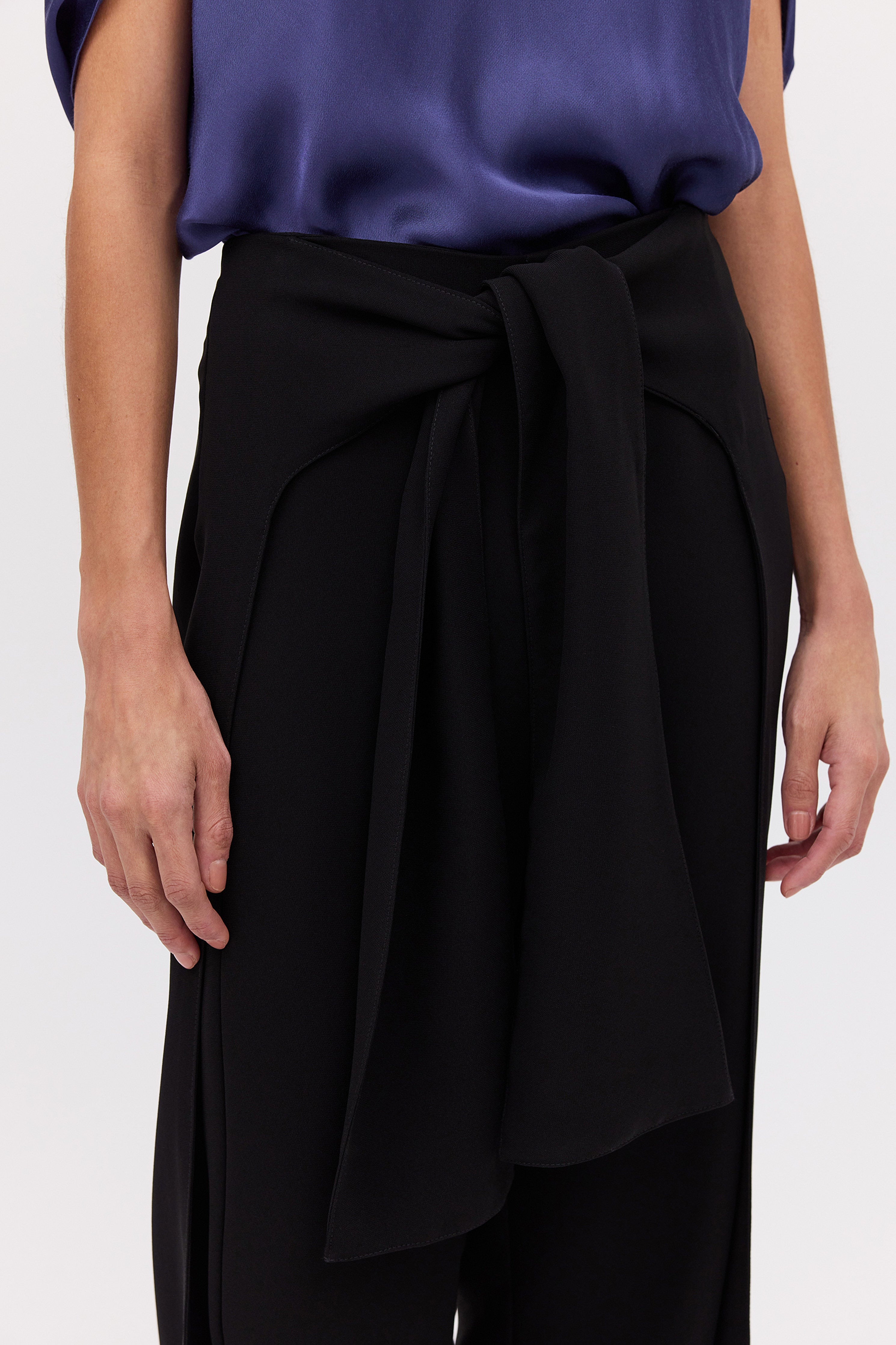 Introducing the Fluent Pant. An elevated take on a classic wardrobe staple, trouser, this style will add instant polish to the everyday. Crafted from a mid-weight crepe de chine, with an elegant wide leg fit for ease of movement. The Fluent Pant features a tie waist that gently folds and envelops, adding structure and interest to an essential wardrobe pillar- the black trouser.