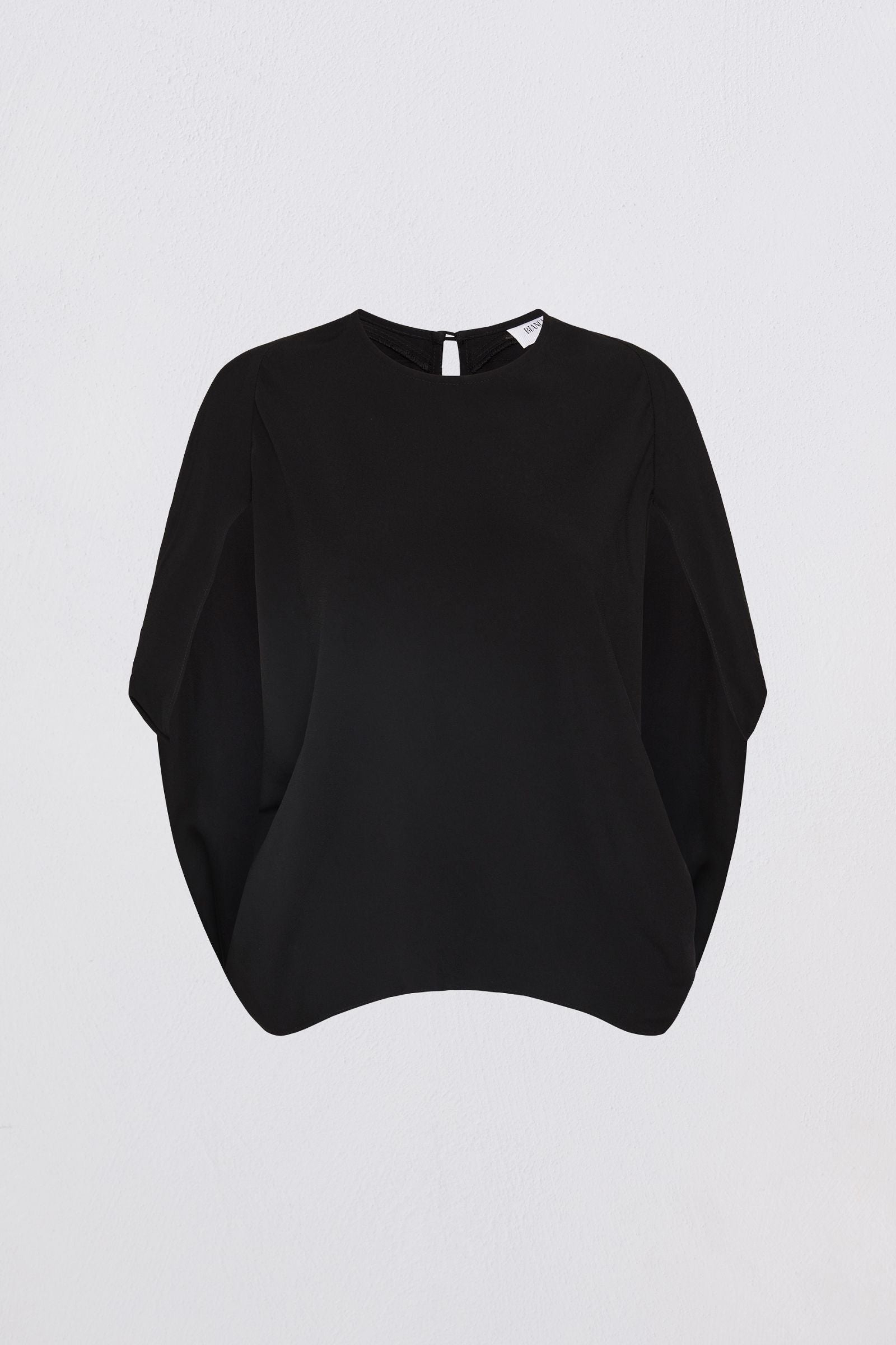 Subtly subversive, the Black Crepe Crawford top is an elegant expression of the Bianca Spender T-shirt. The perfect style to pair back with everything in your wardrobe. Slit cut-out sleeves that drape down to the back of the elbow, fastened with a single button at the back of the neck. Designed to fall just above the hip, style down with jeans and heels for a casual Spring occasion.