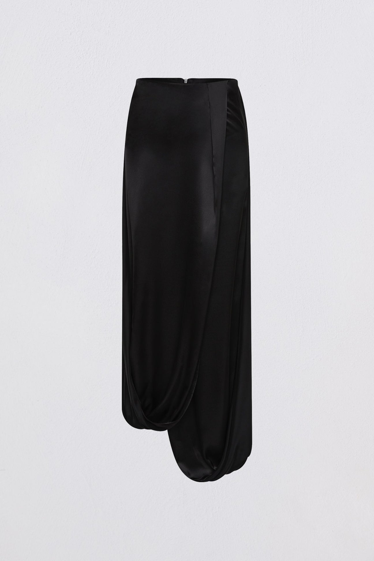 Tailored with ease and elevated by sculptural drape, the Surrender Skirt in Black Silk Satin reimagines one of our best-selling silhouettes. Cut with fluid precision, it features a looped hem that creates soft architectural volume and natural movement. The high-waisted fit skims the hips before cascading into a liquid fold through the hemline, balancing polish with ease.